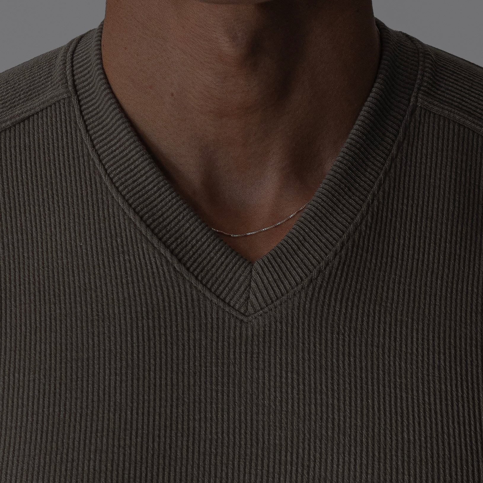 - 브이넥 라인으로 답답함 없이 목선을 길어 보이게 연출