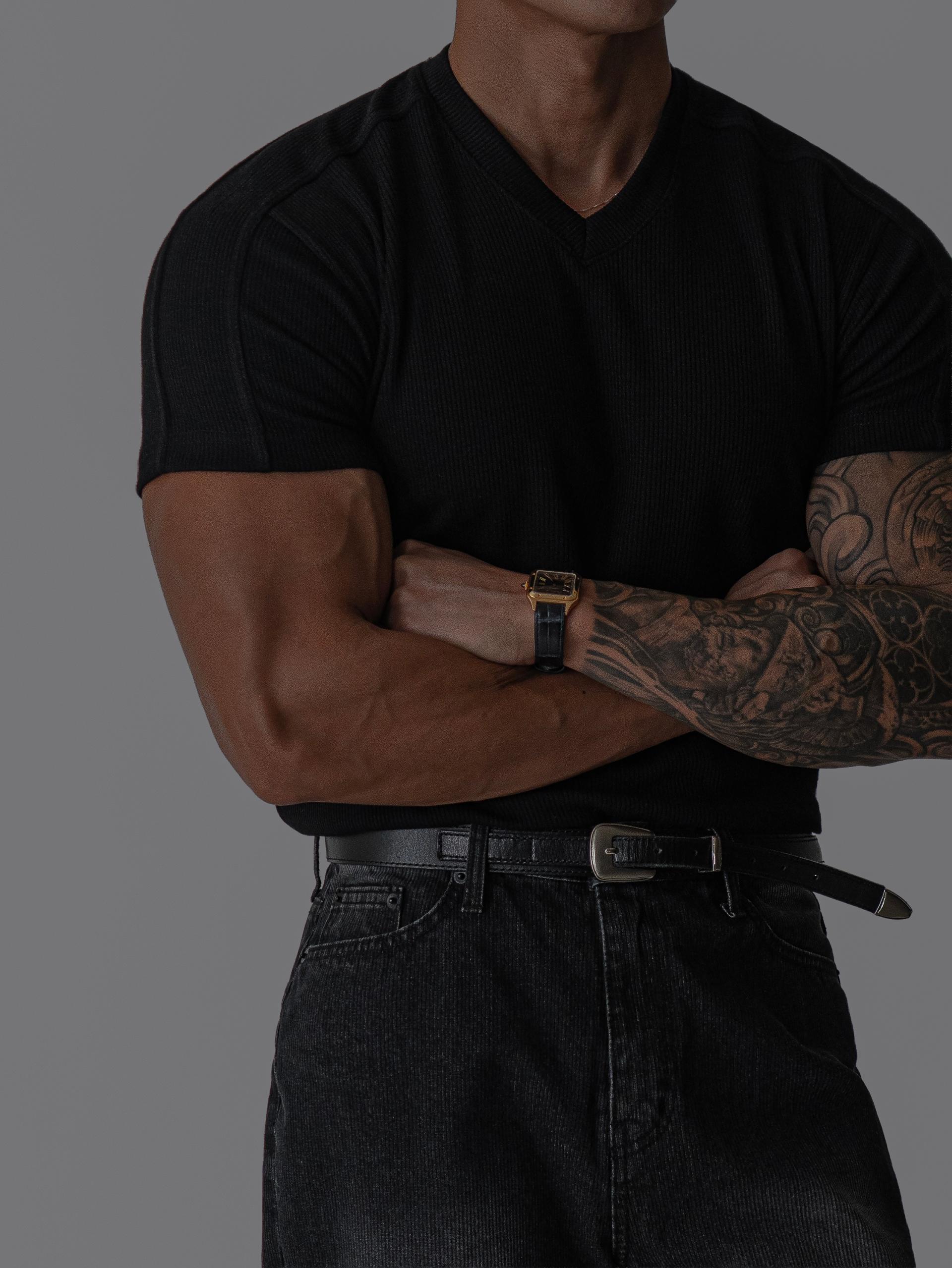 - 타이트하게 잡힌 암홀 라인으로 팔 근육을 확실하게 부각