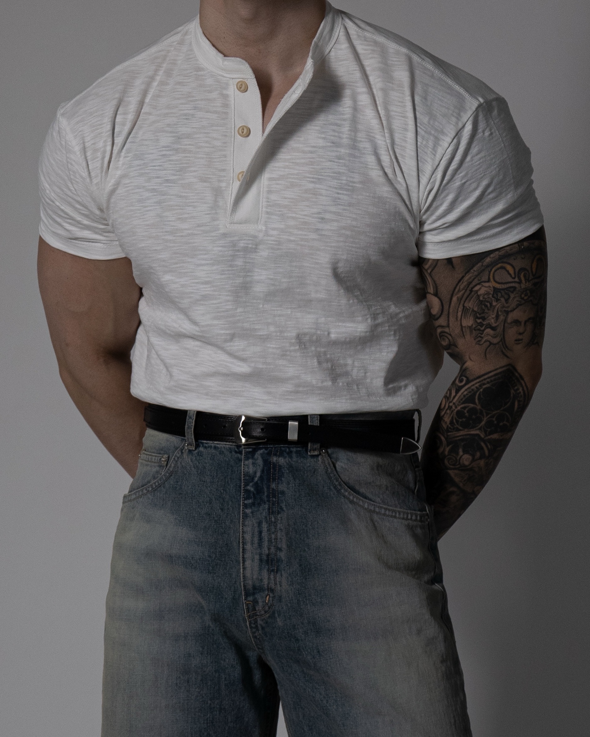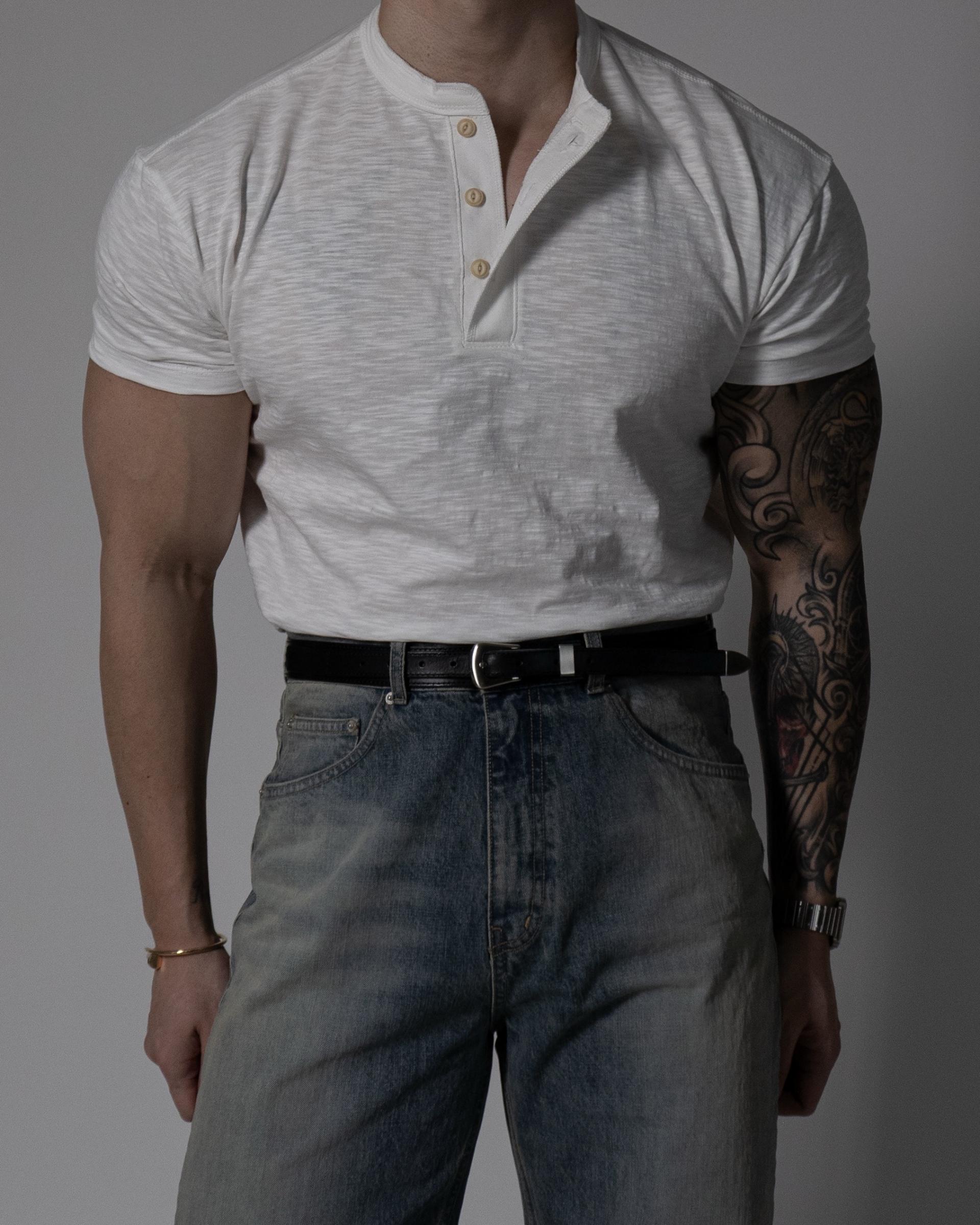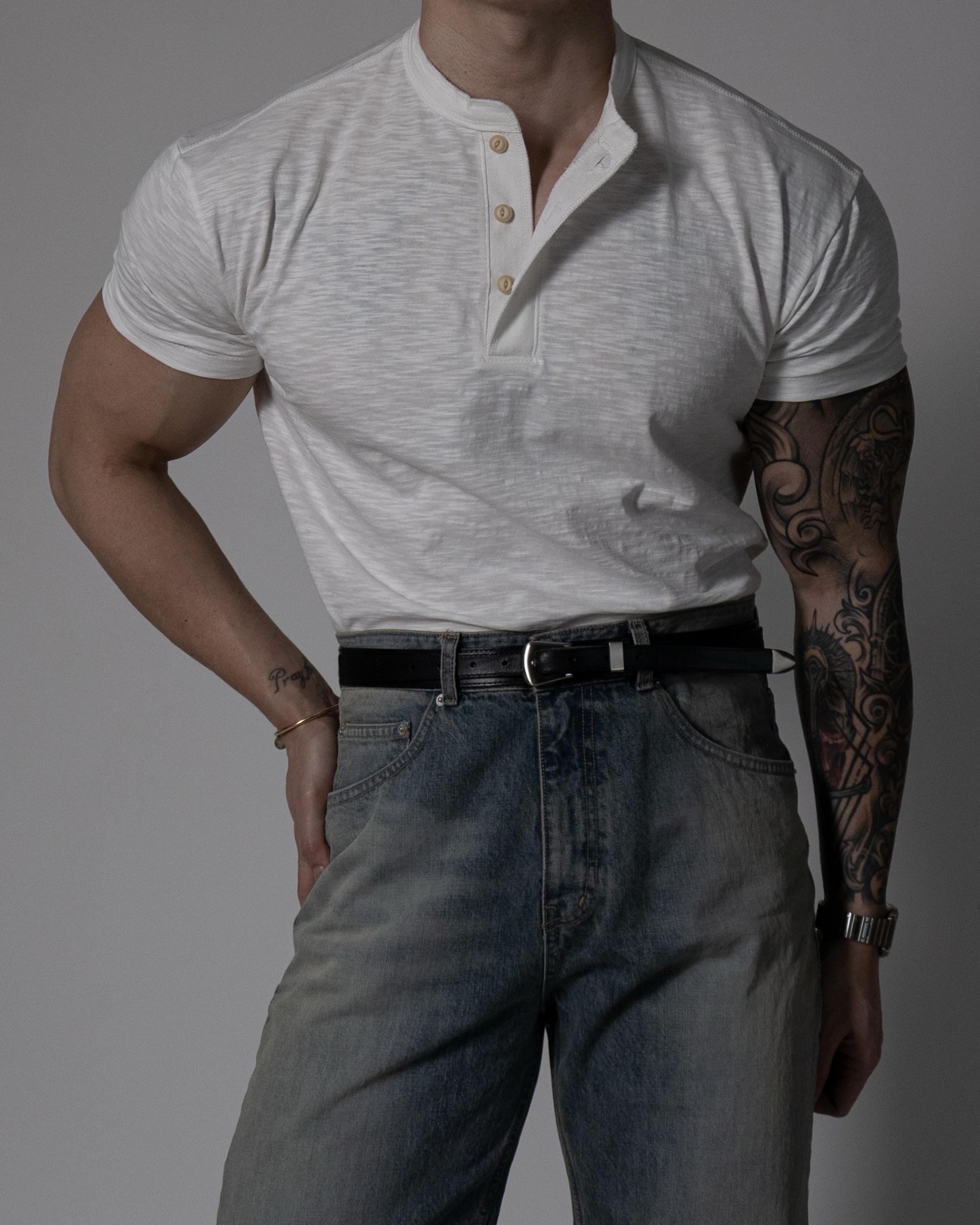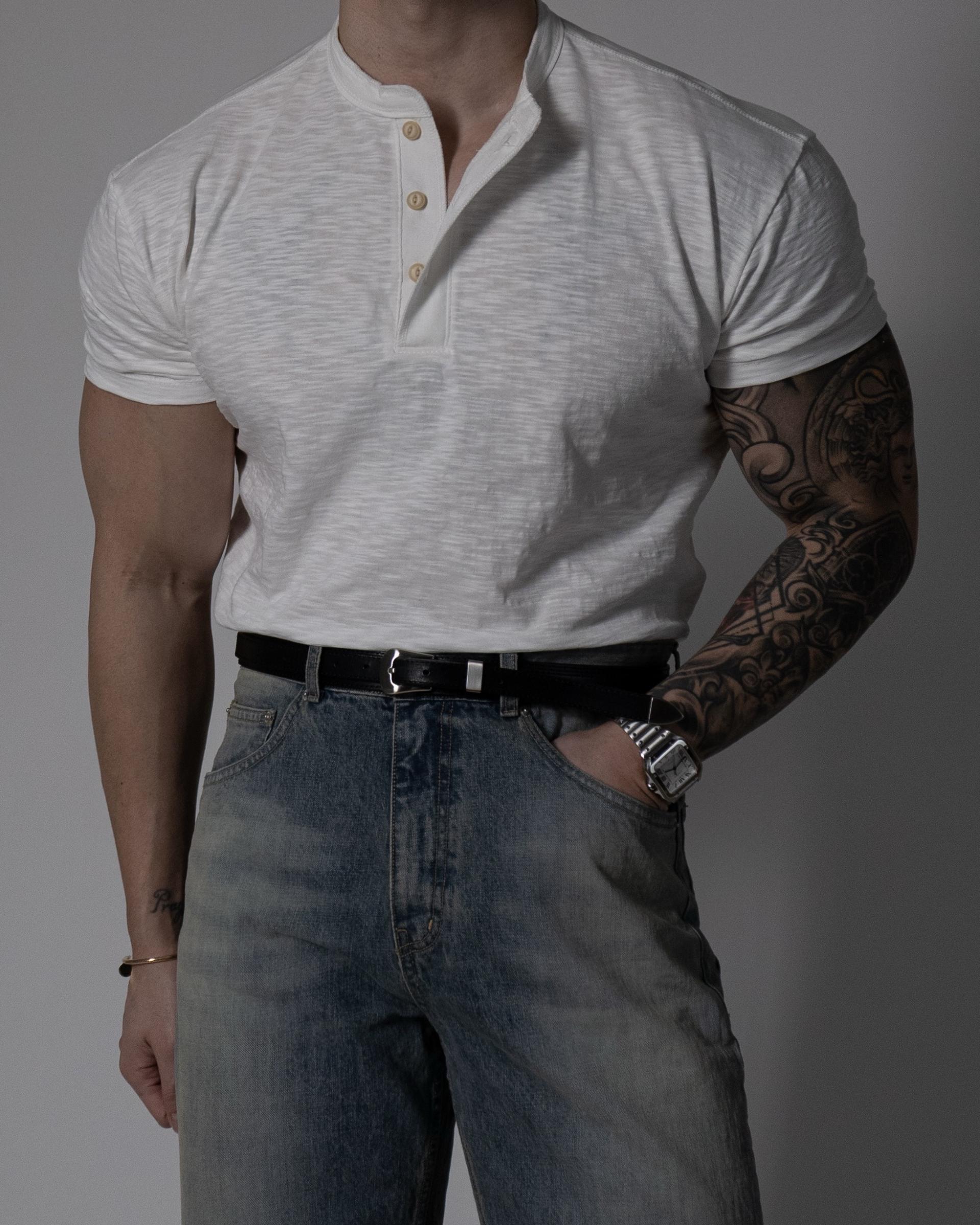 - 고급스러운 텍스처의 프리미엄 슬라브 원단의 헨리넥 티셔츠