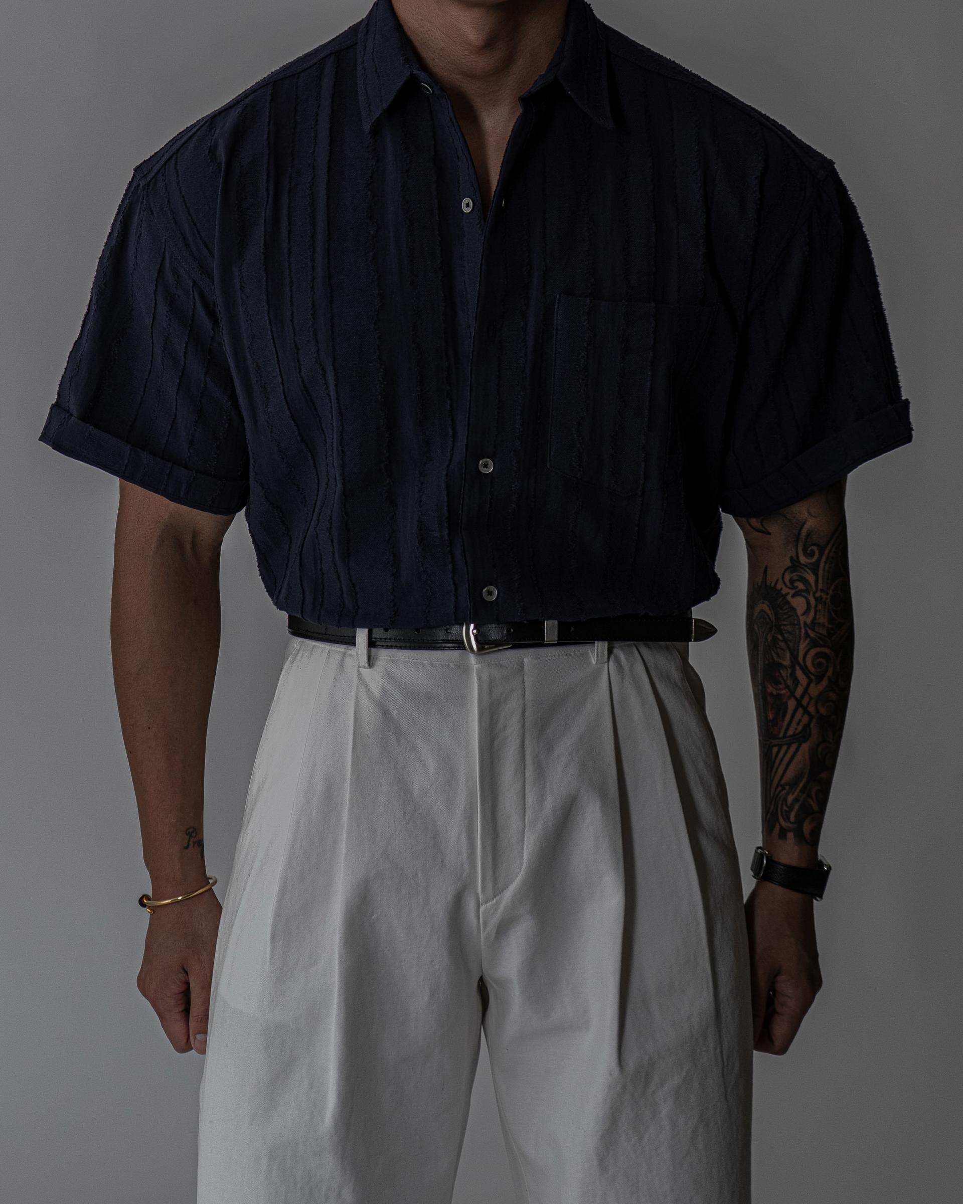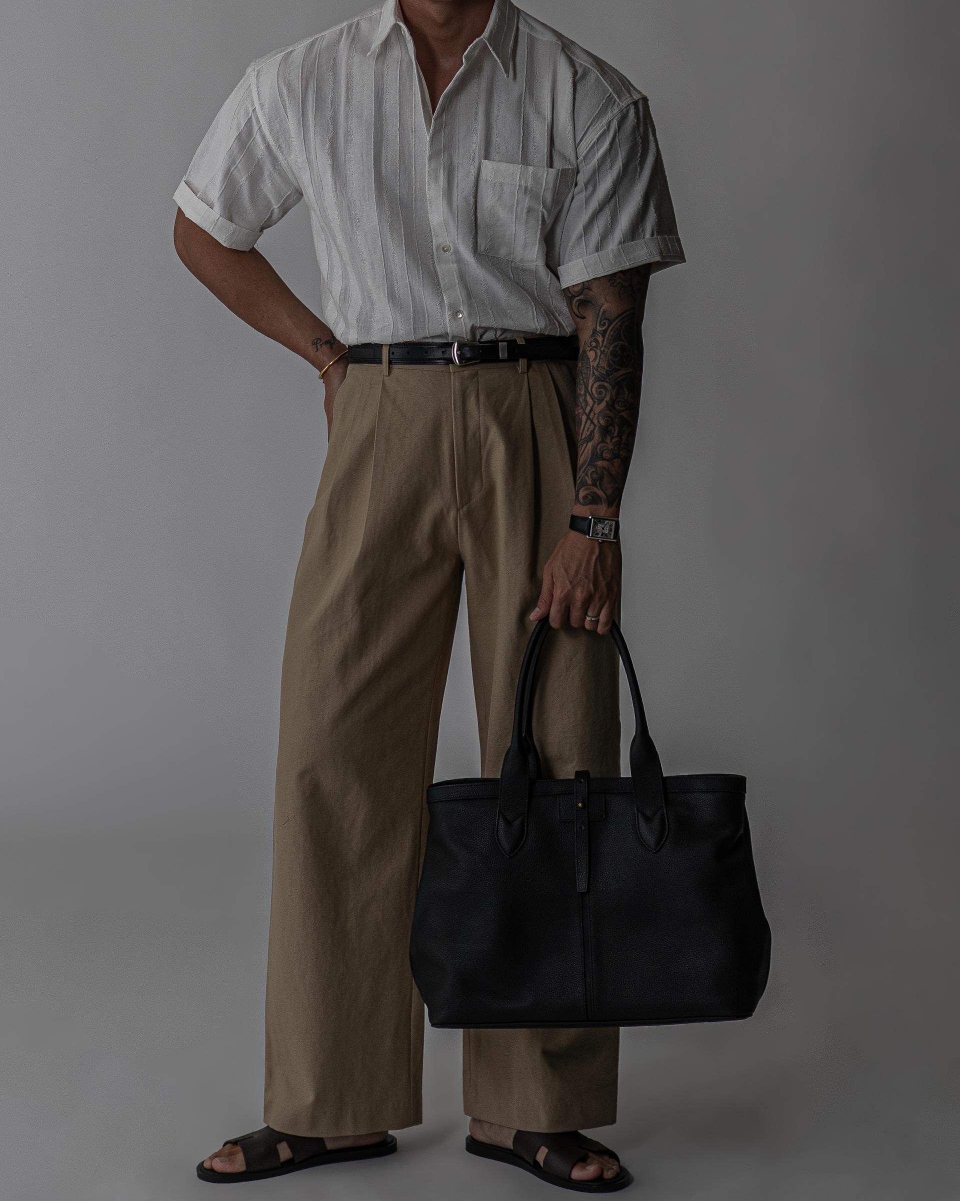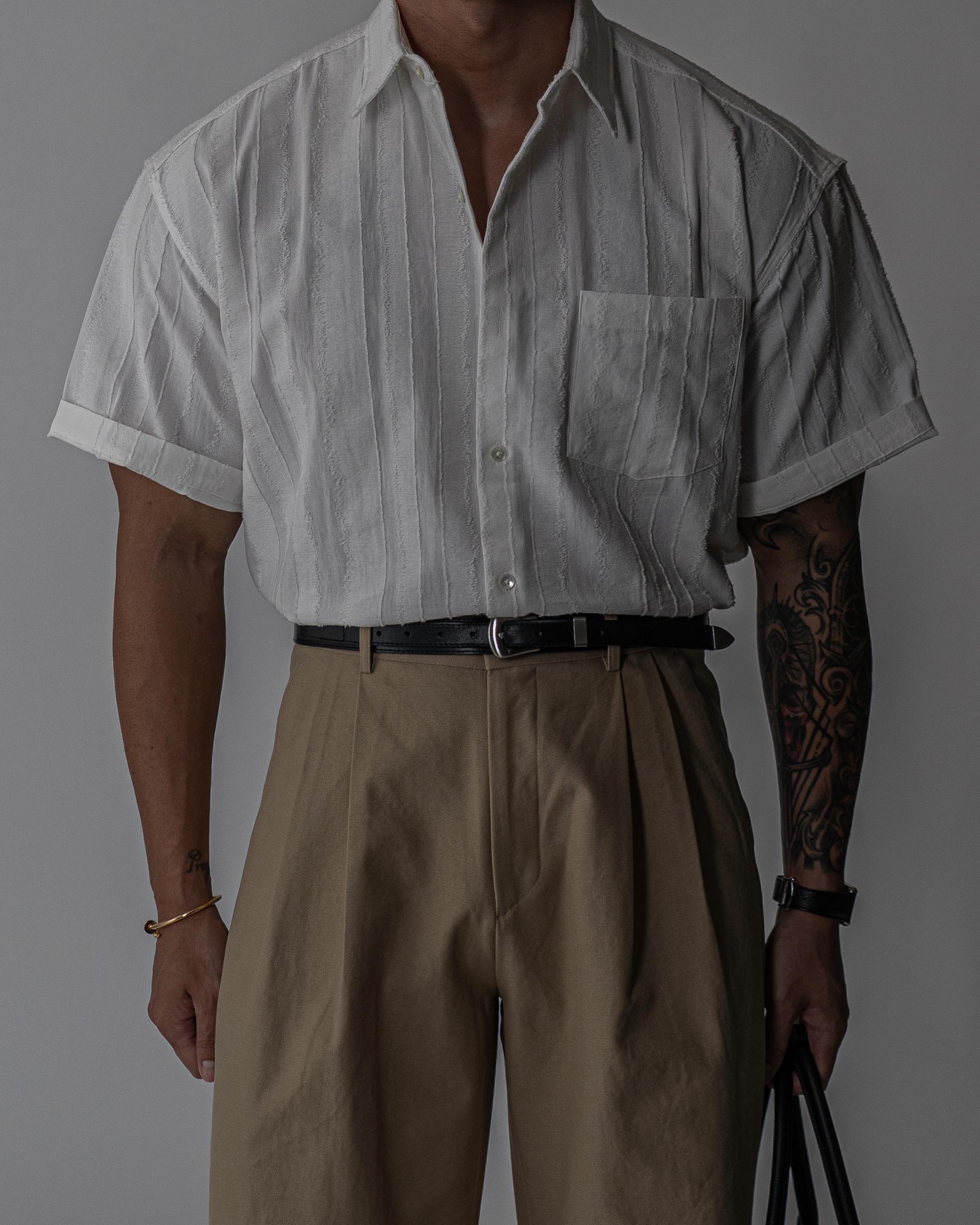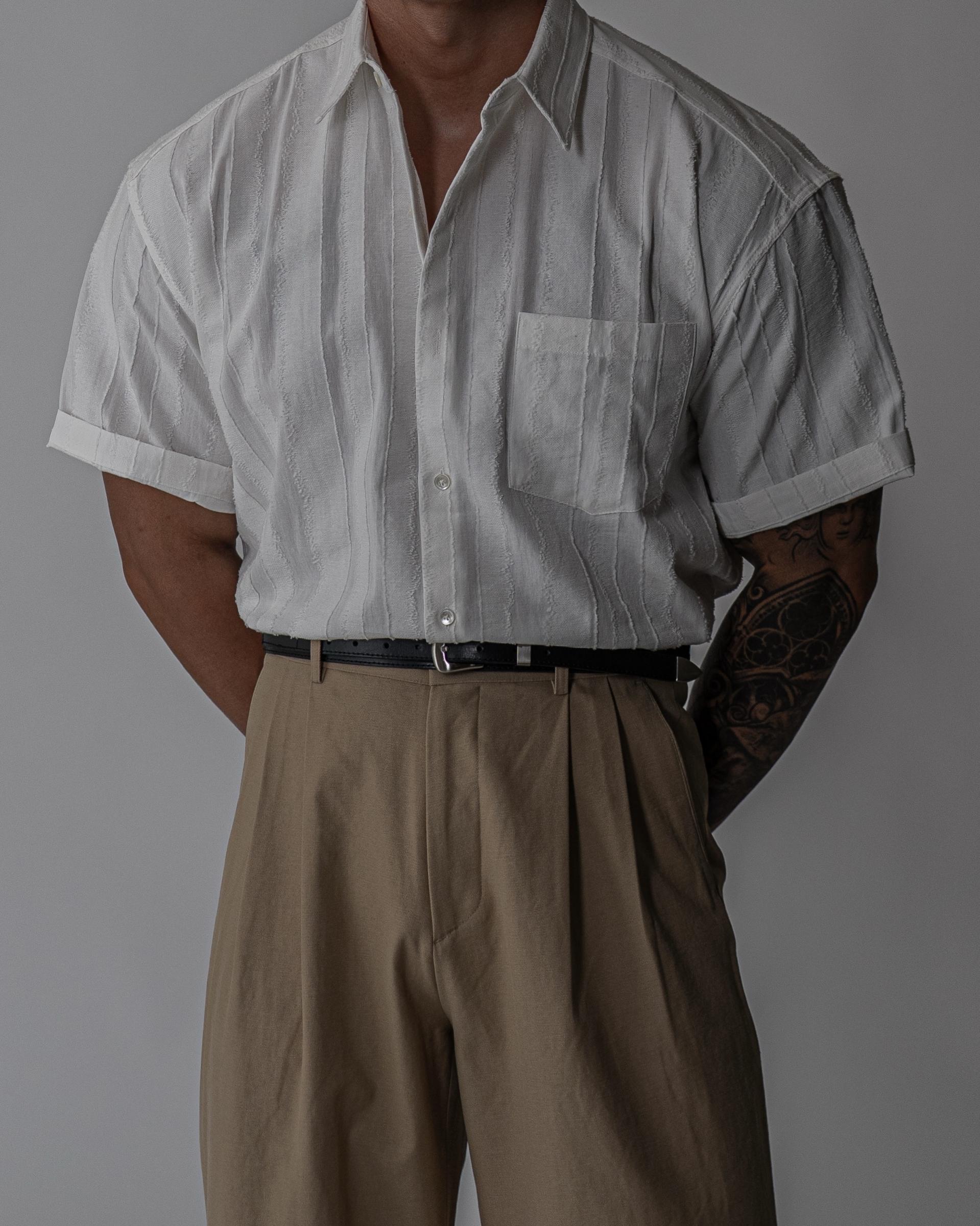 - 불규칙한 텍스처와 스트라이프 패턴이 어우러져 고급스러운 실루엣