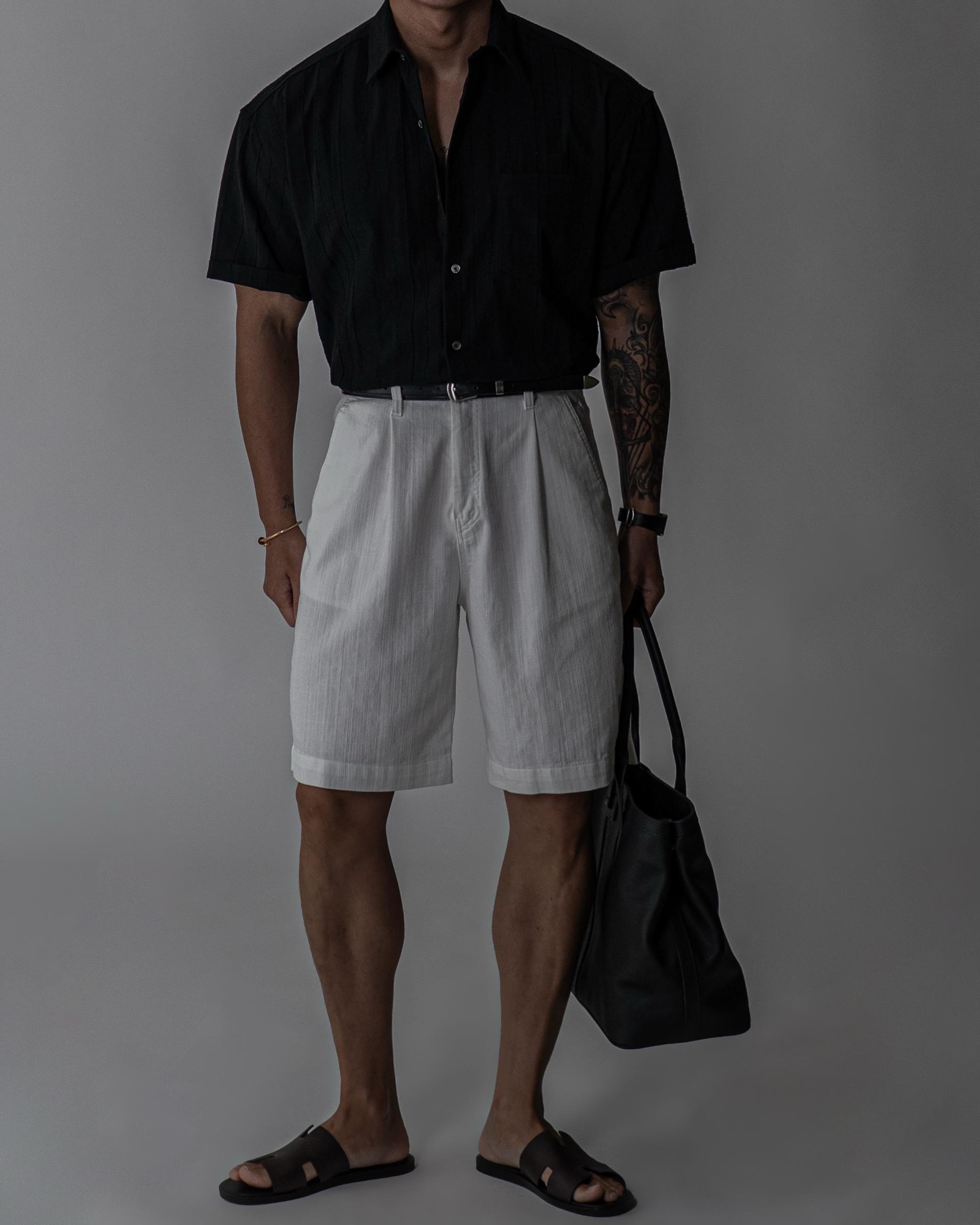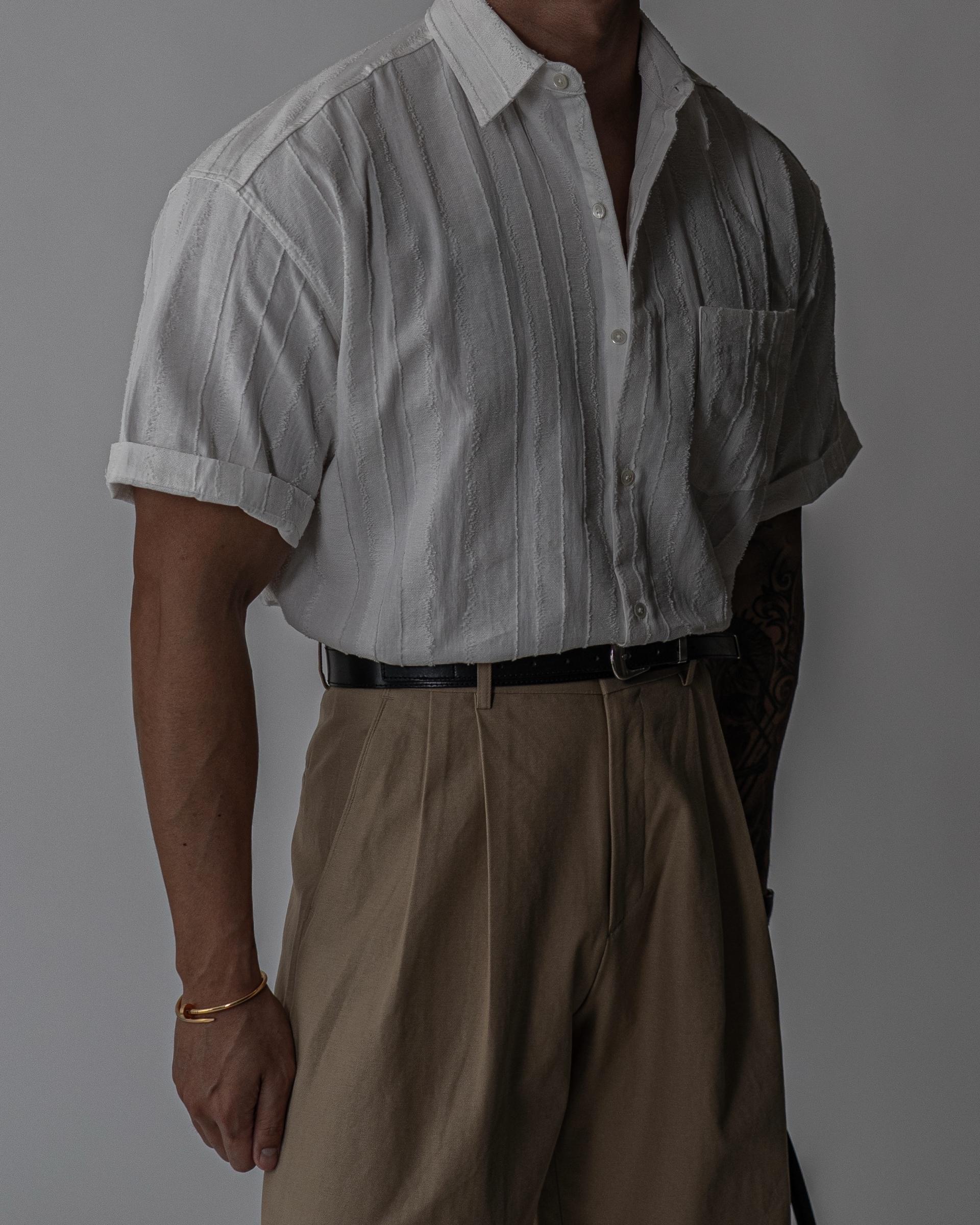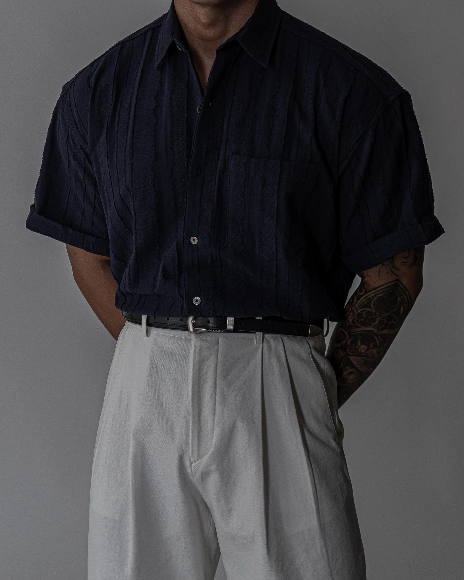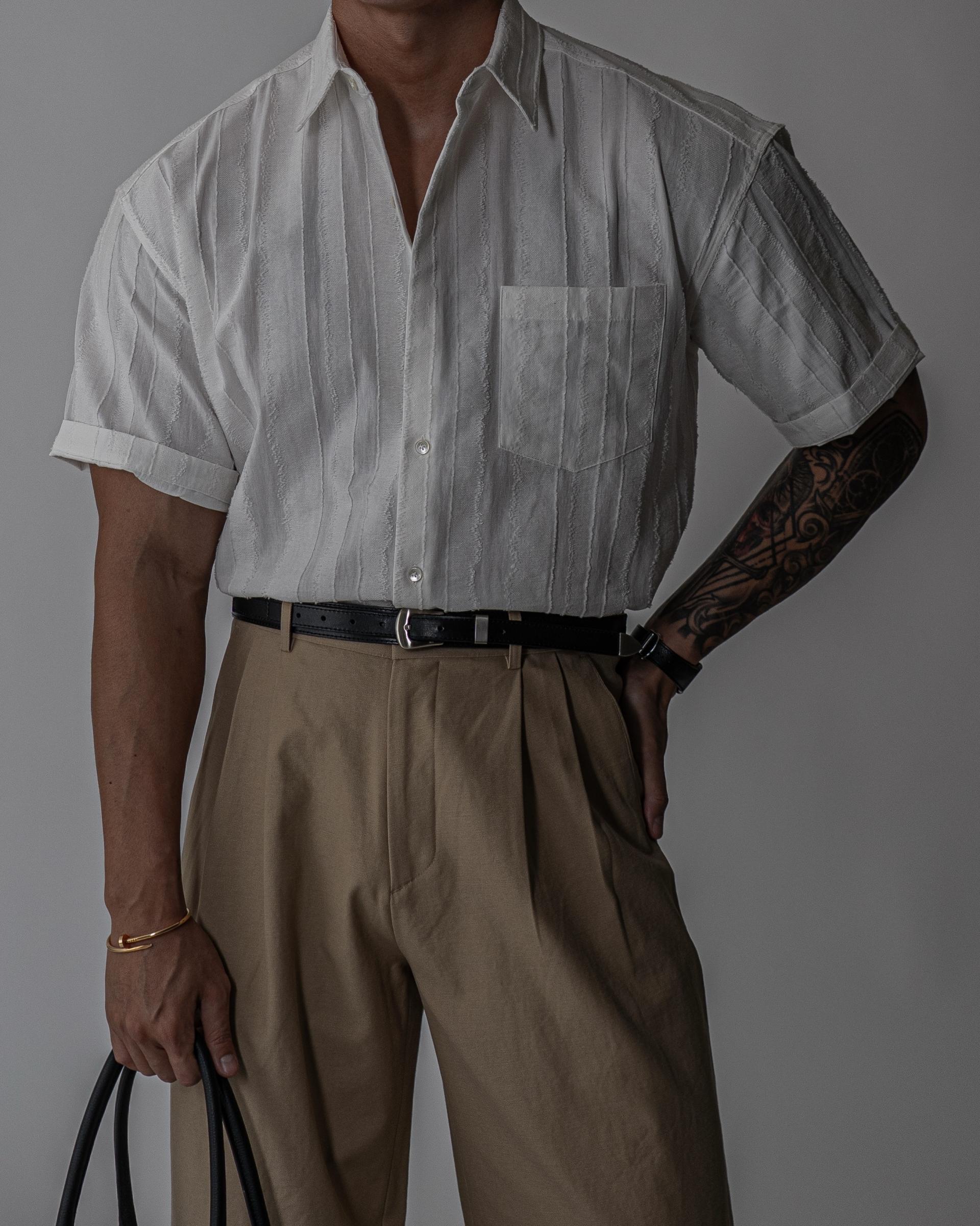 - 불규칙한 텍스처와 스트라이프 패턴이 어우러져 고급스러운 실루엣