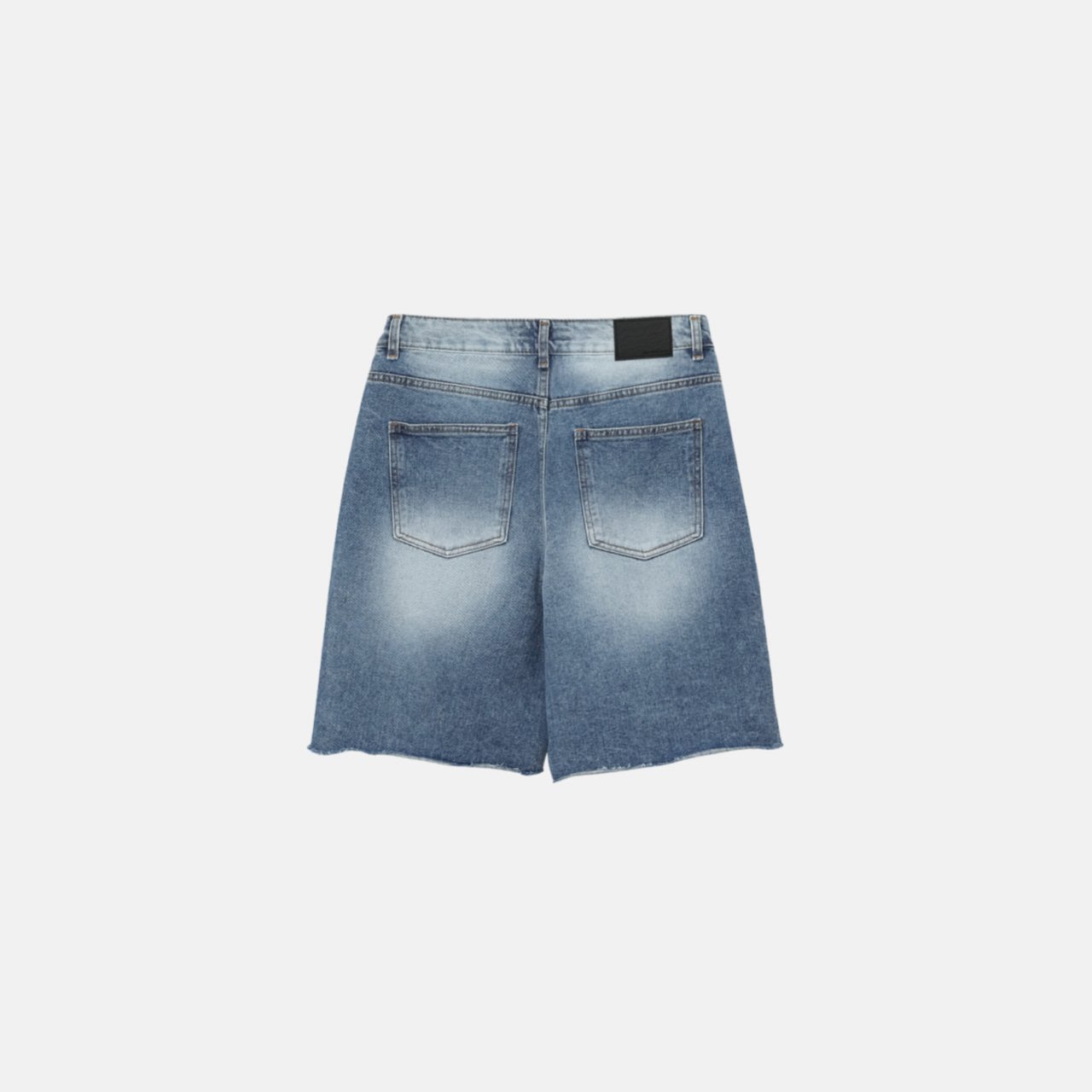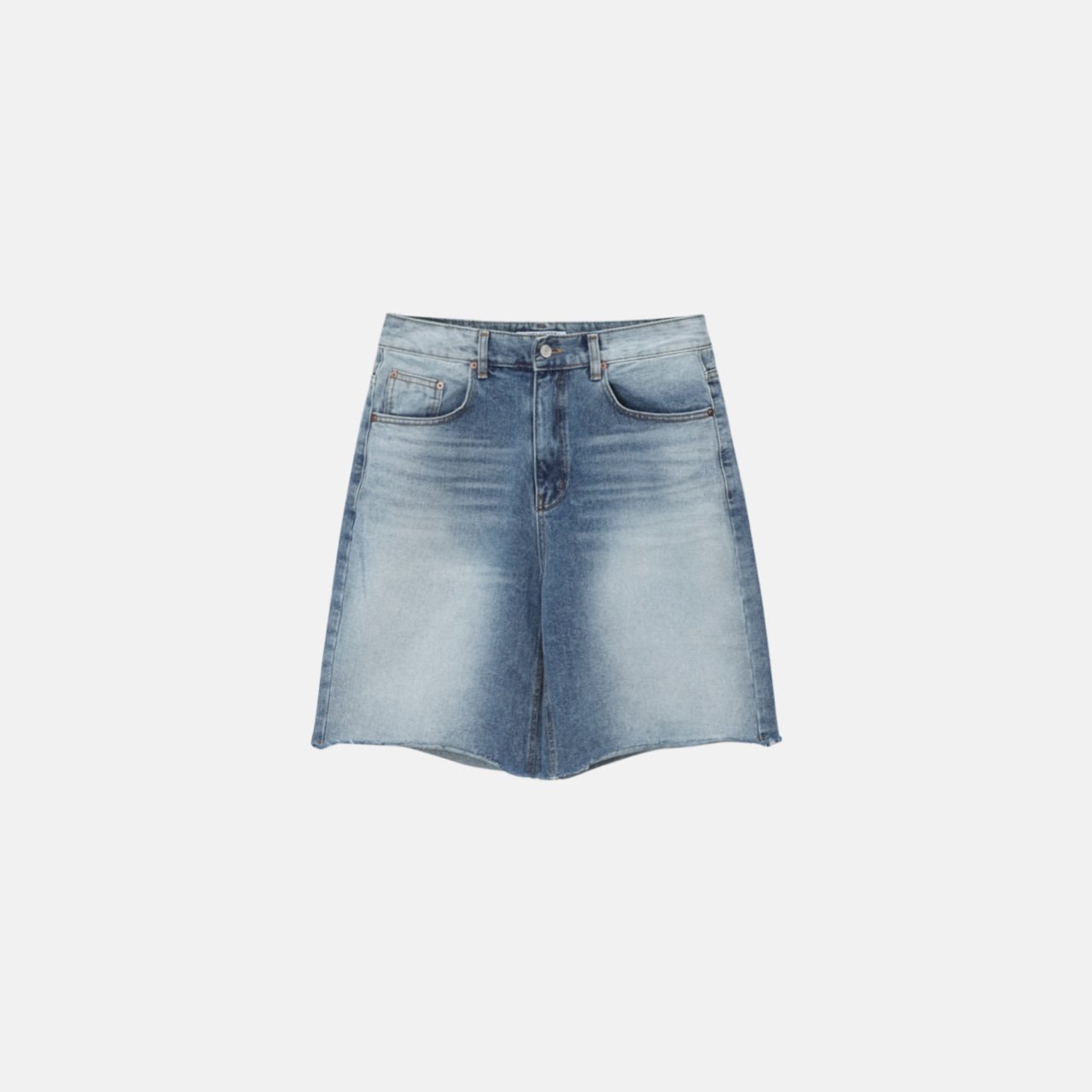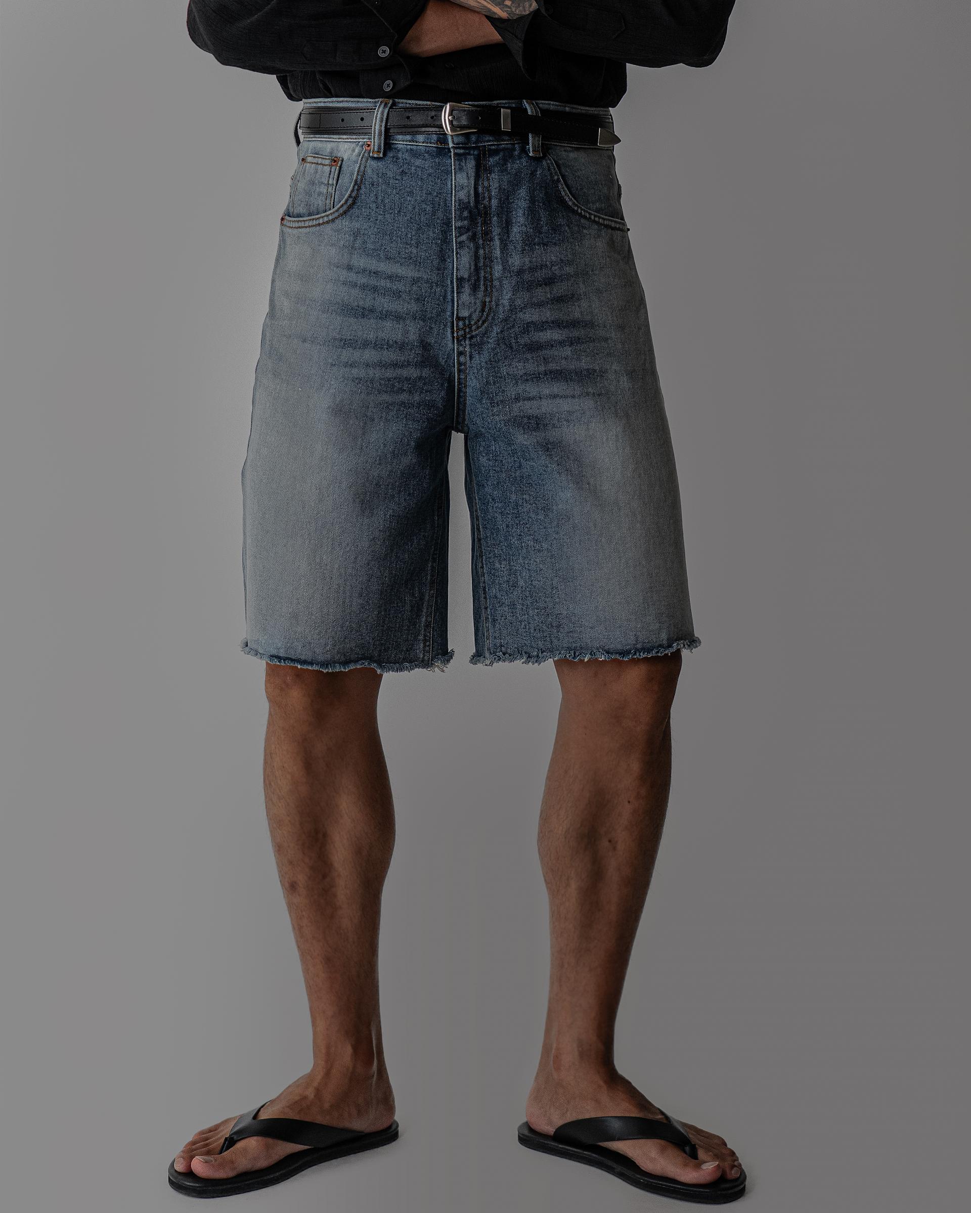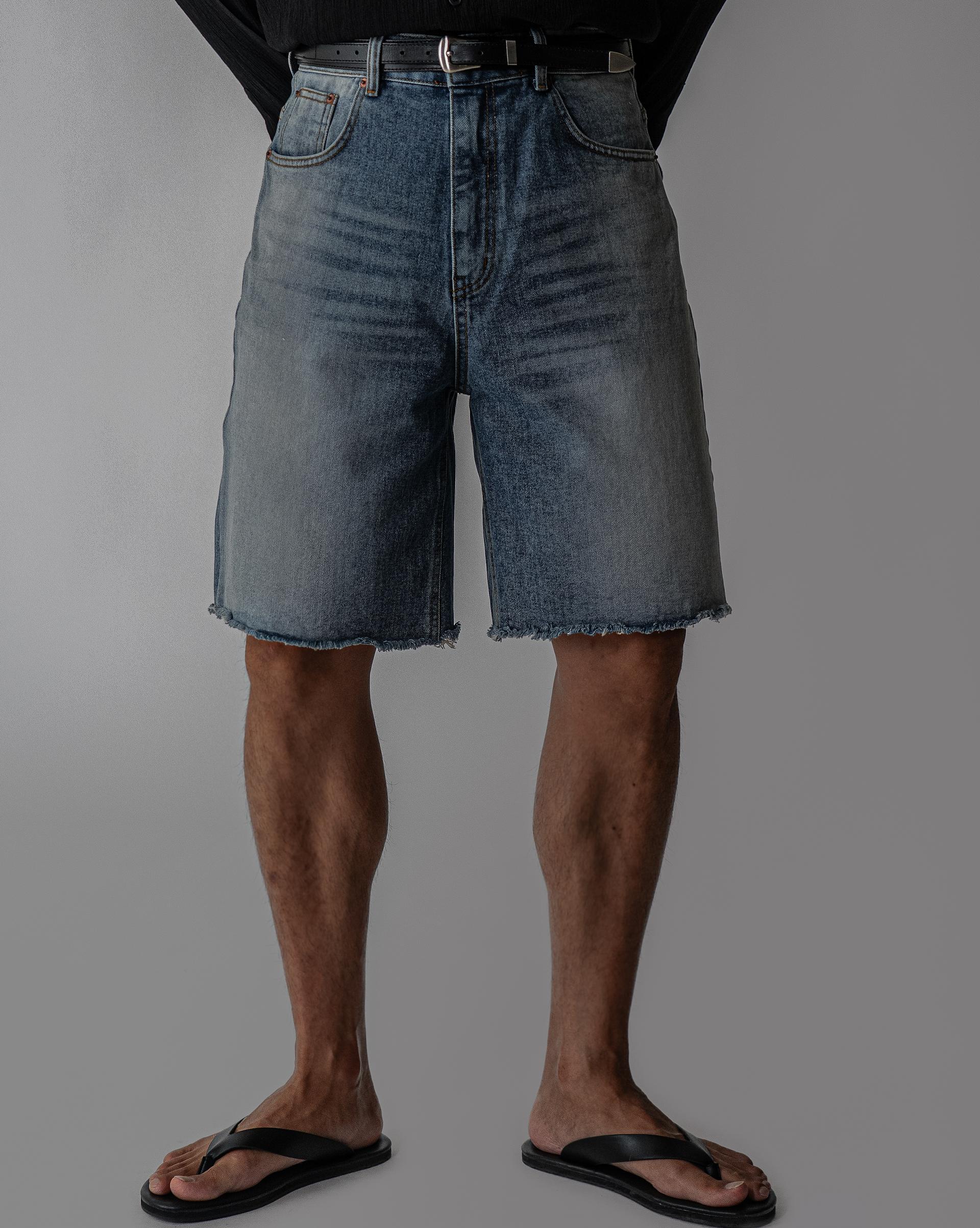 - 남성스러운 무드와 데미지 디테일이 돋보이는 하프 데님 팬츠