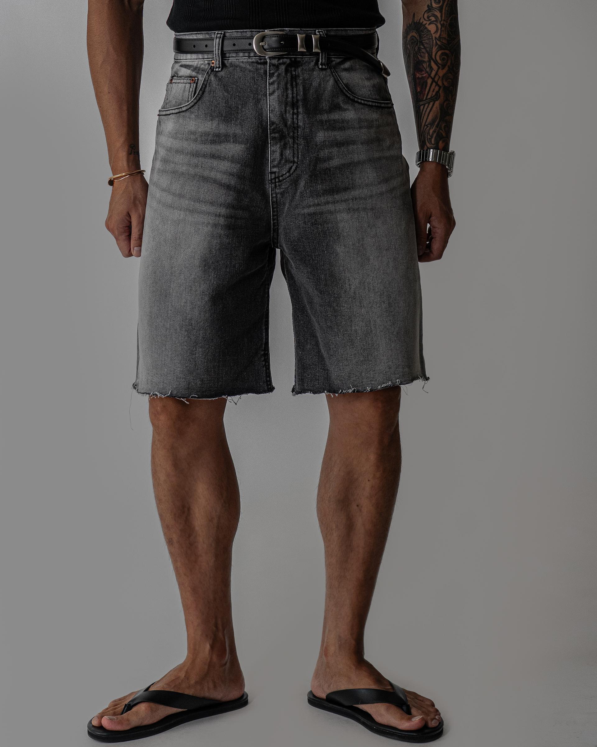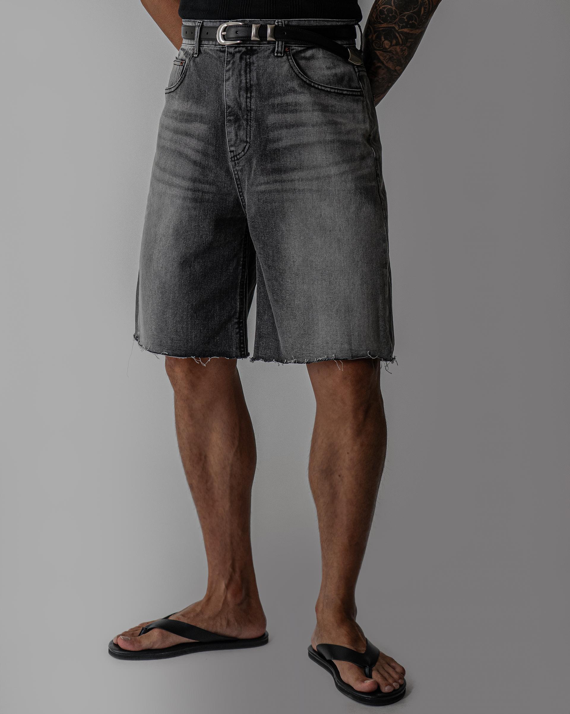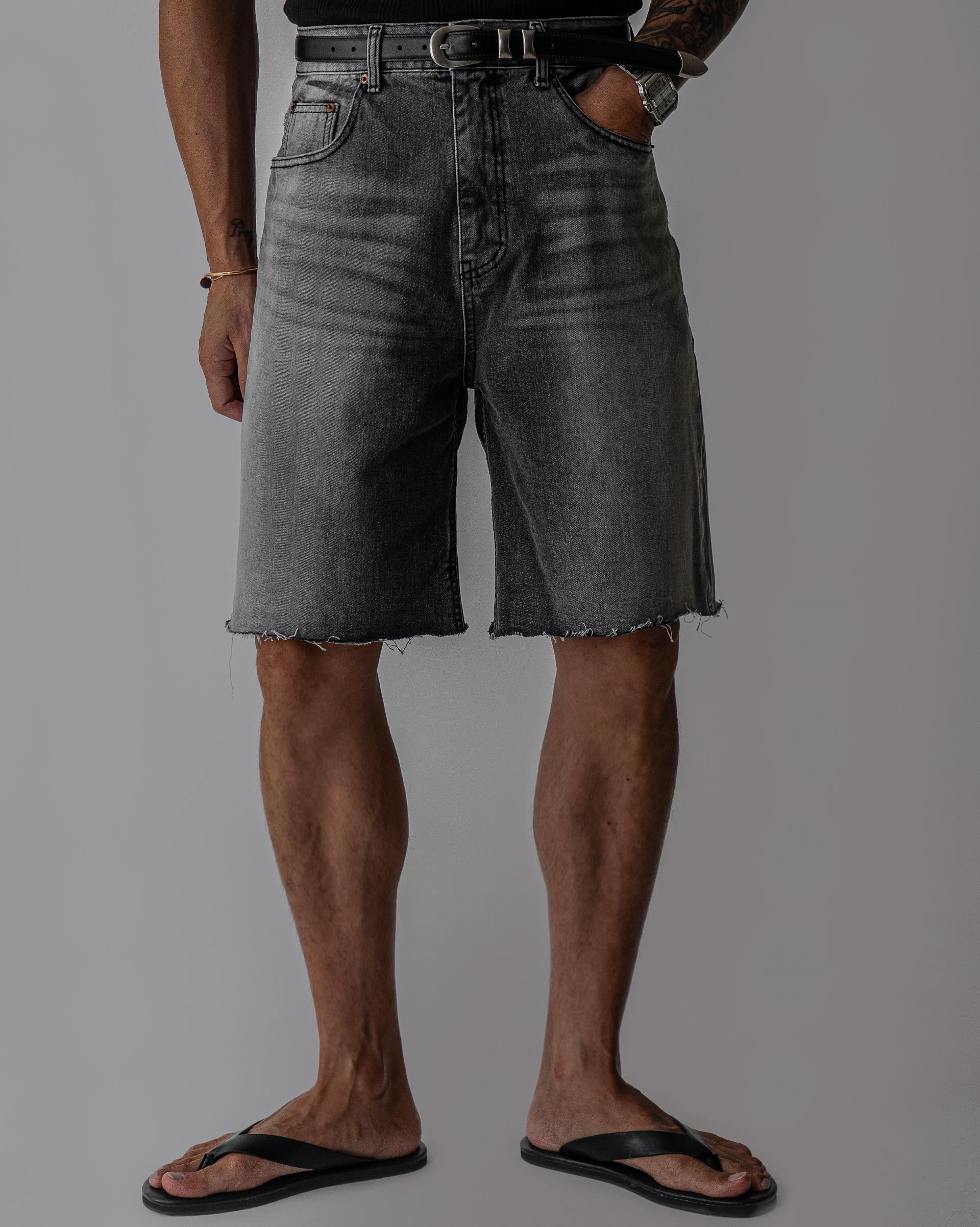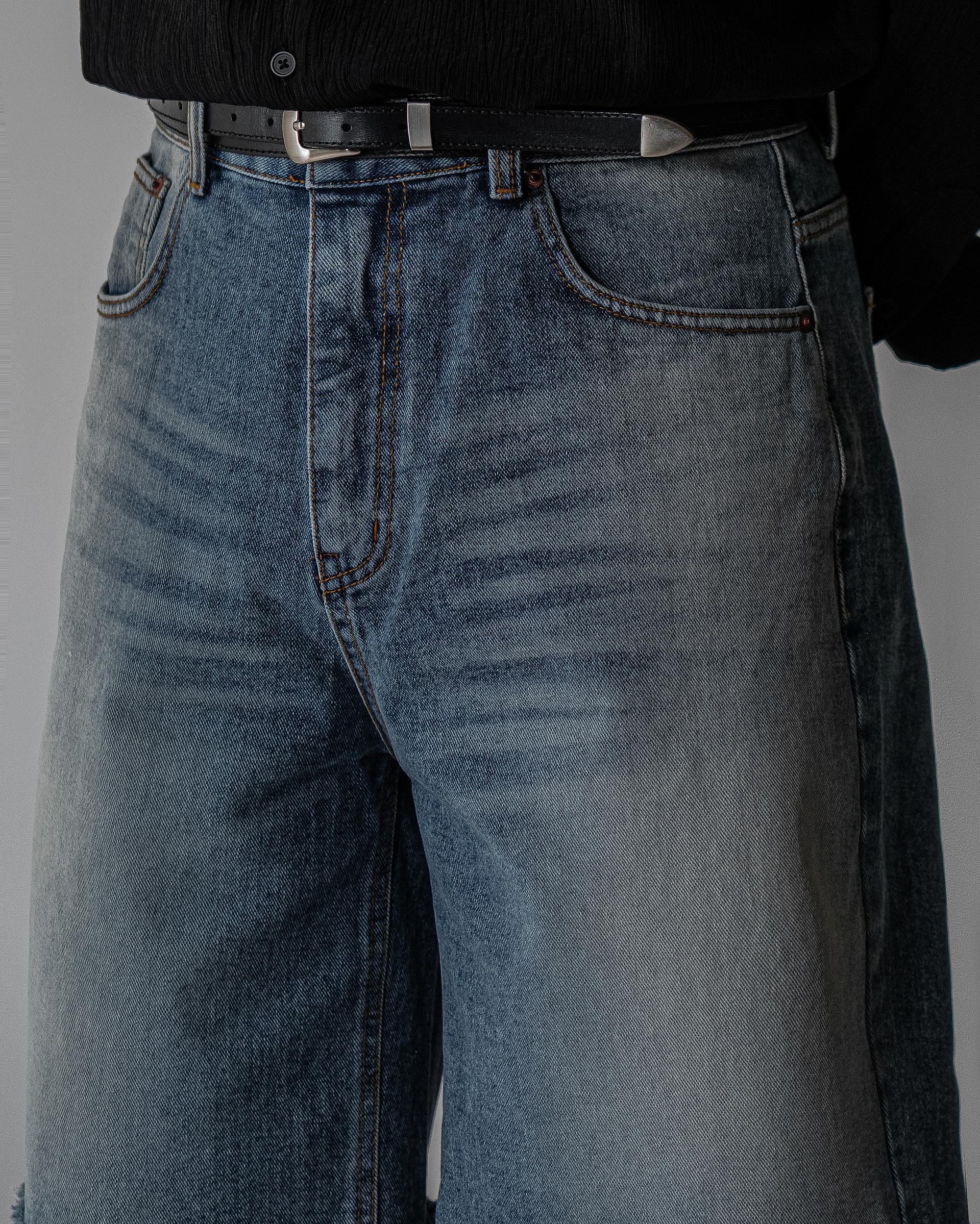 - 남성스러운 무드와 데미지 디테일이 돋보이는 하프 데님 팬츠