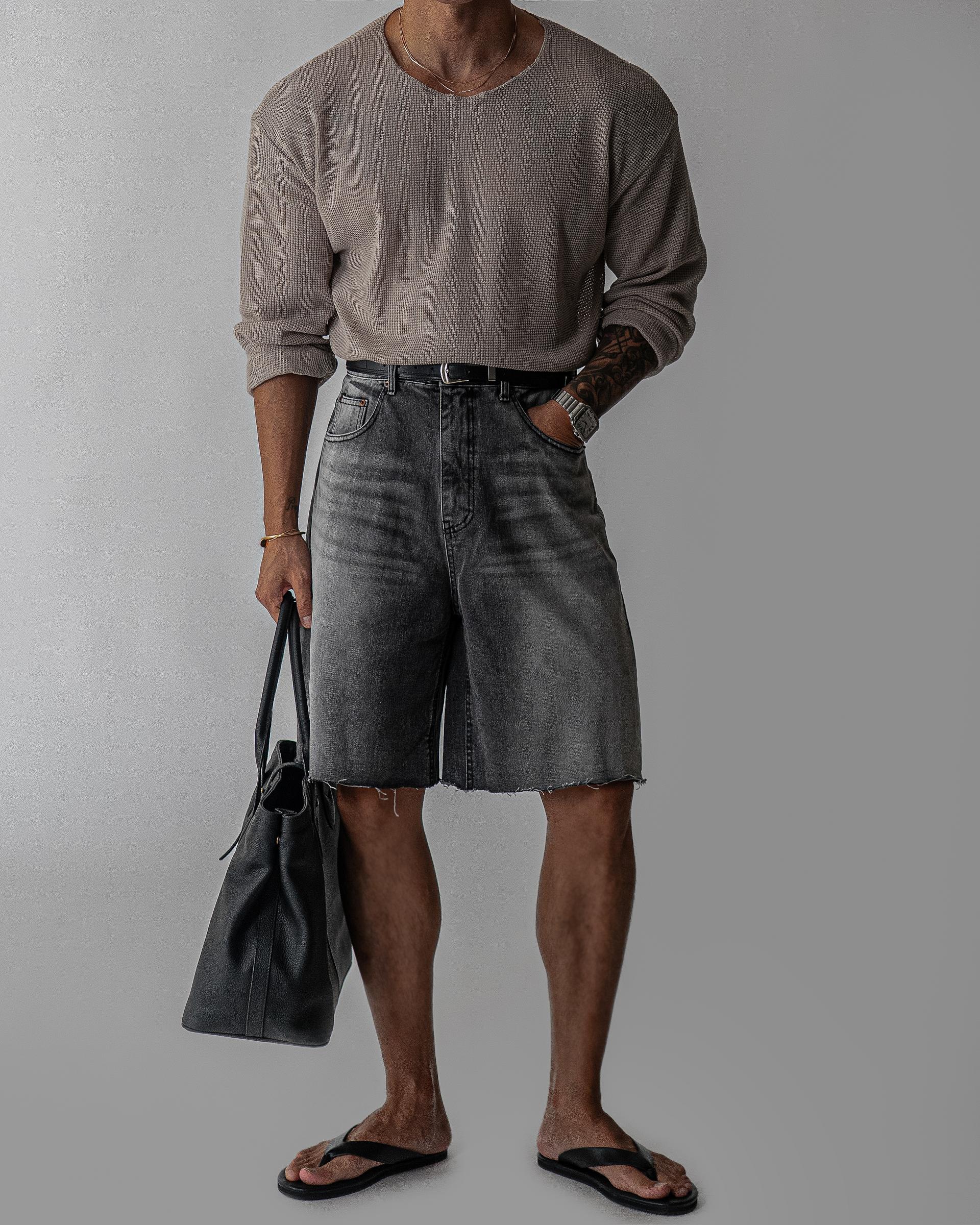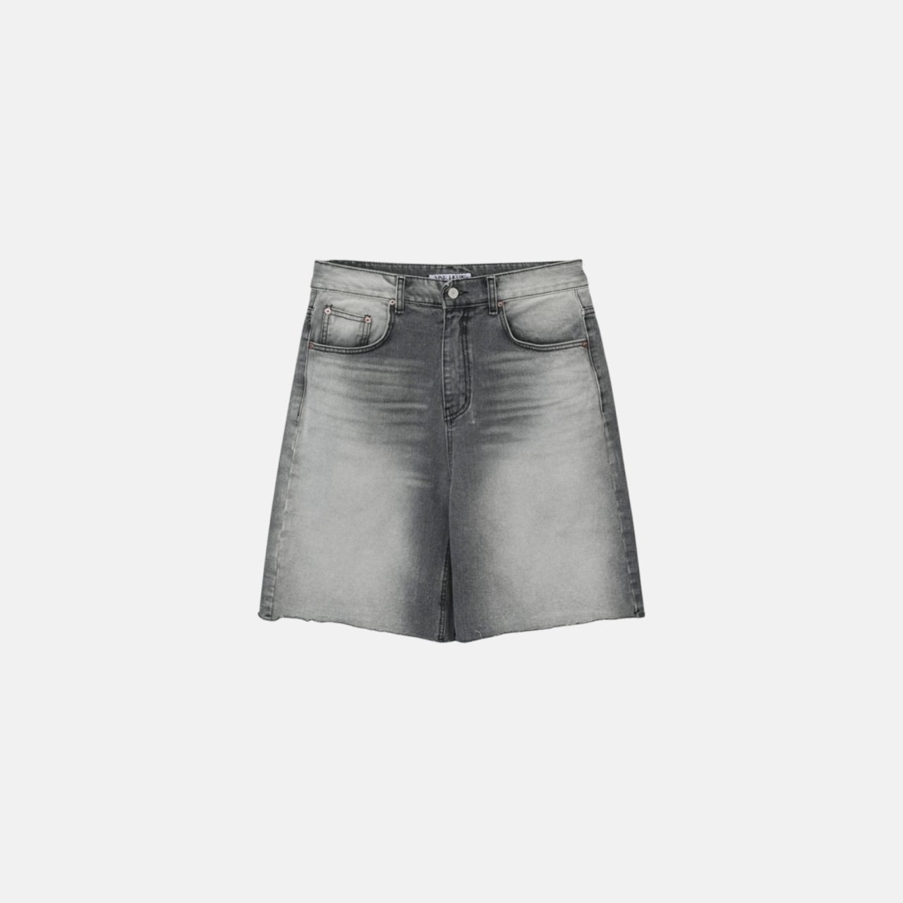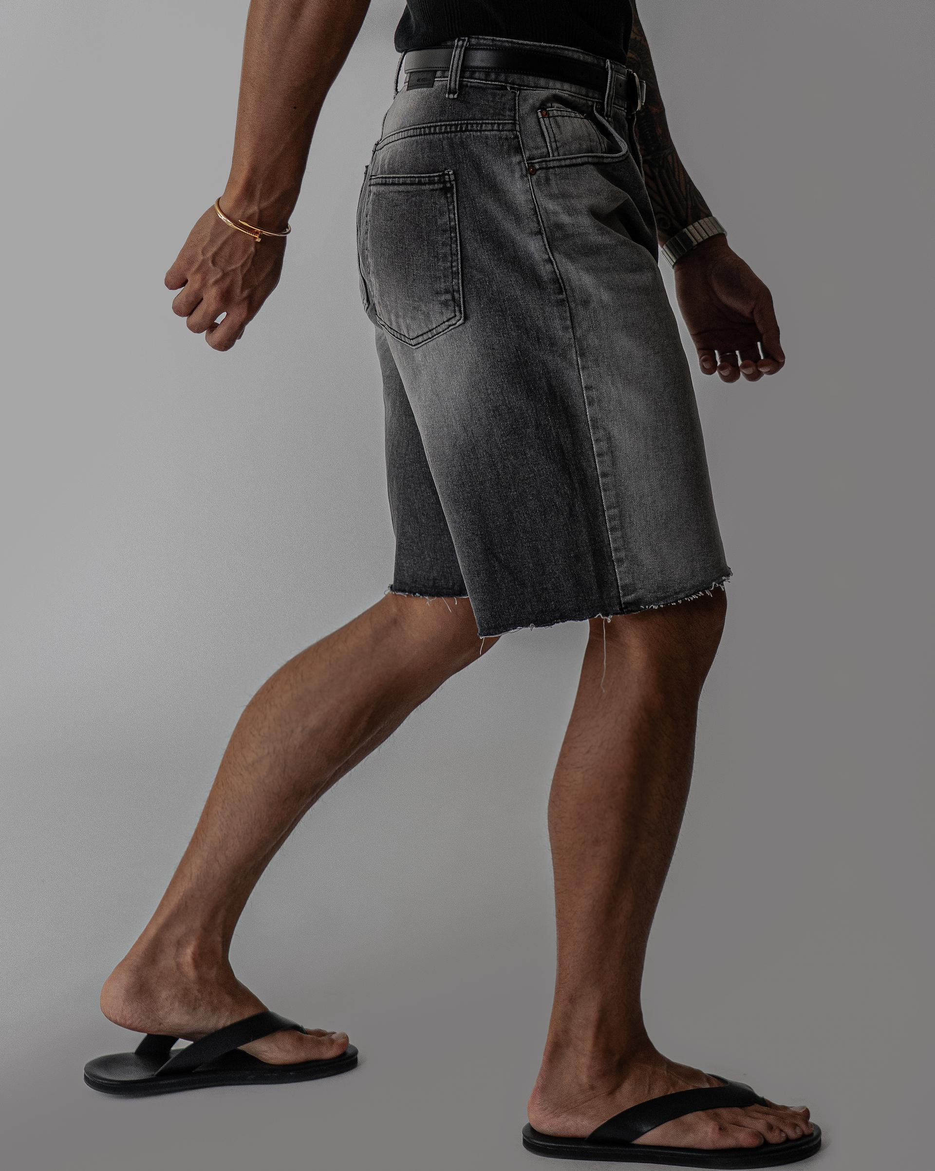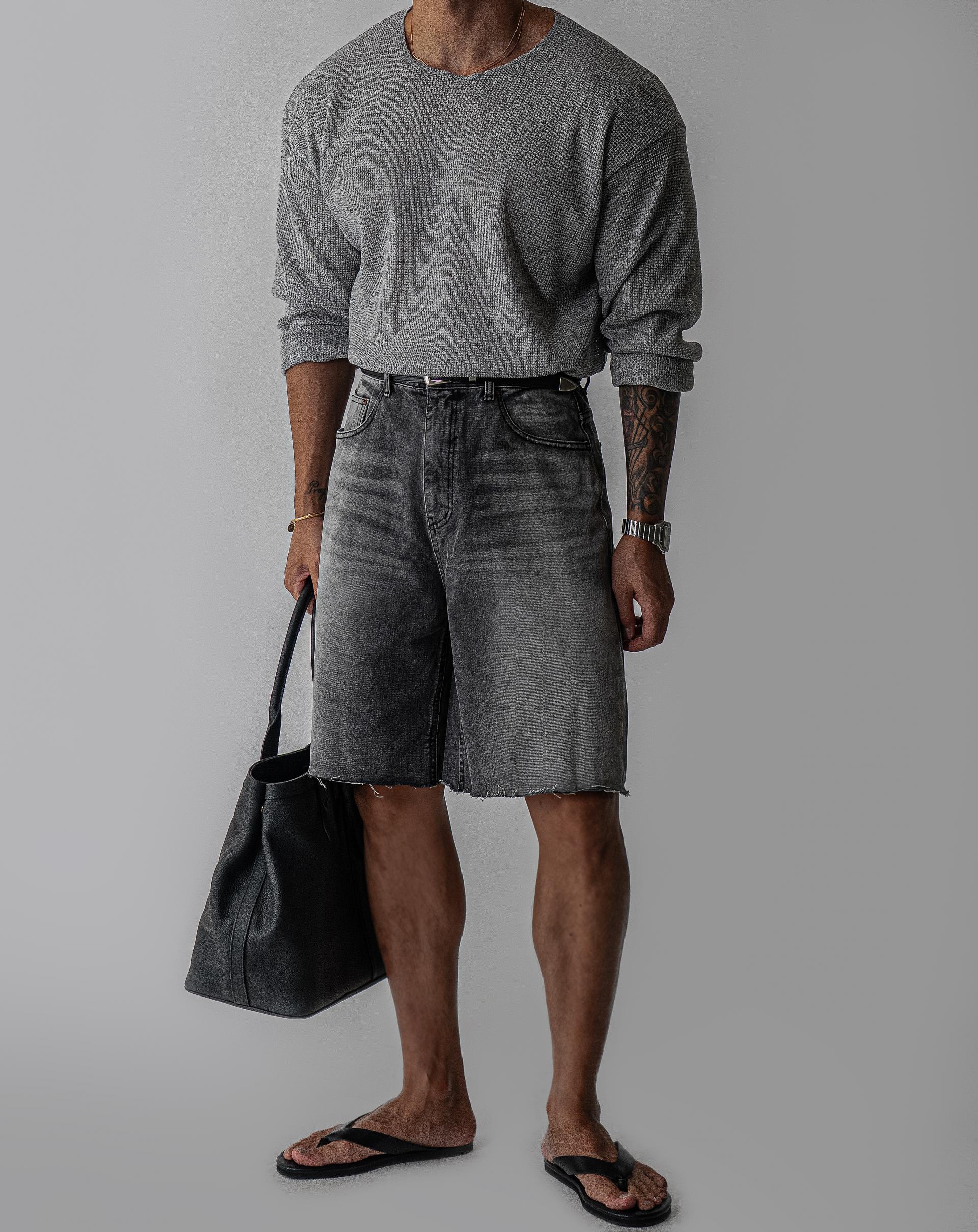 - 남성스러운 무드와 데미지 디테일이 돋보이는 하프 데님 팬츠
