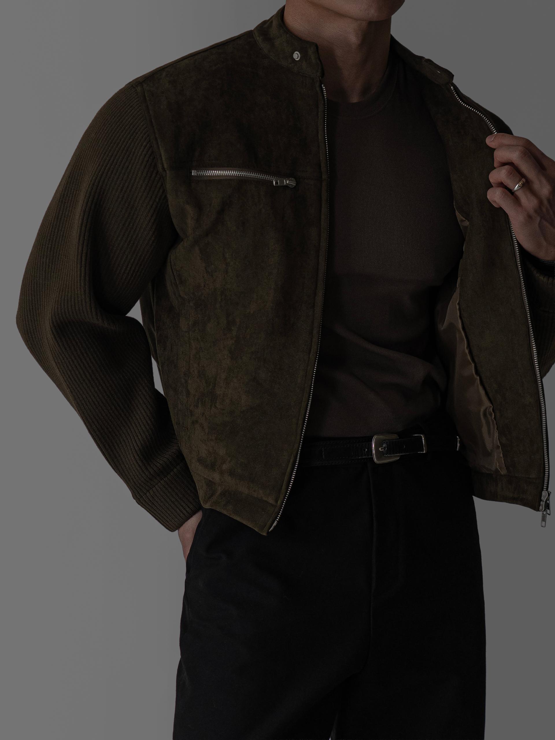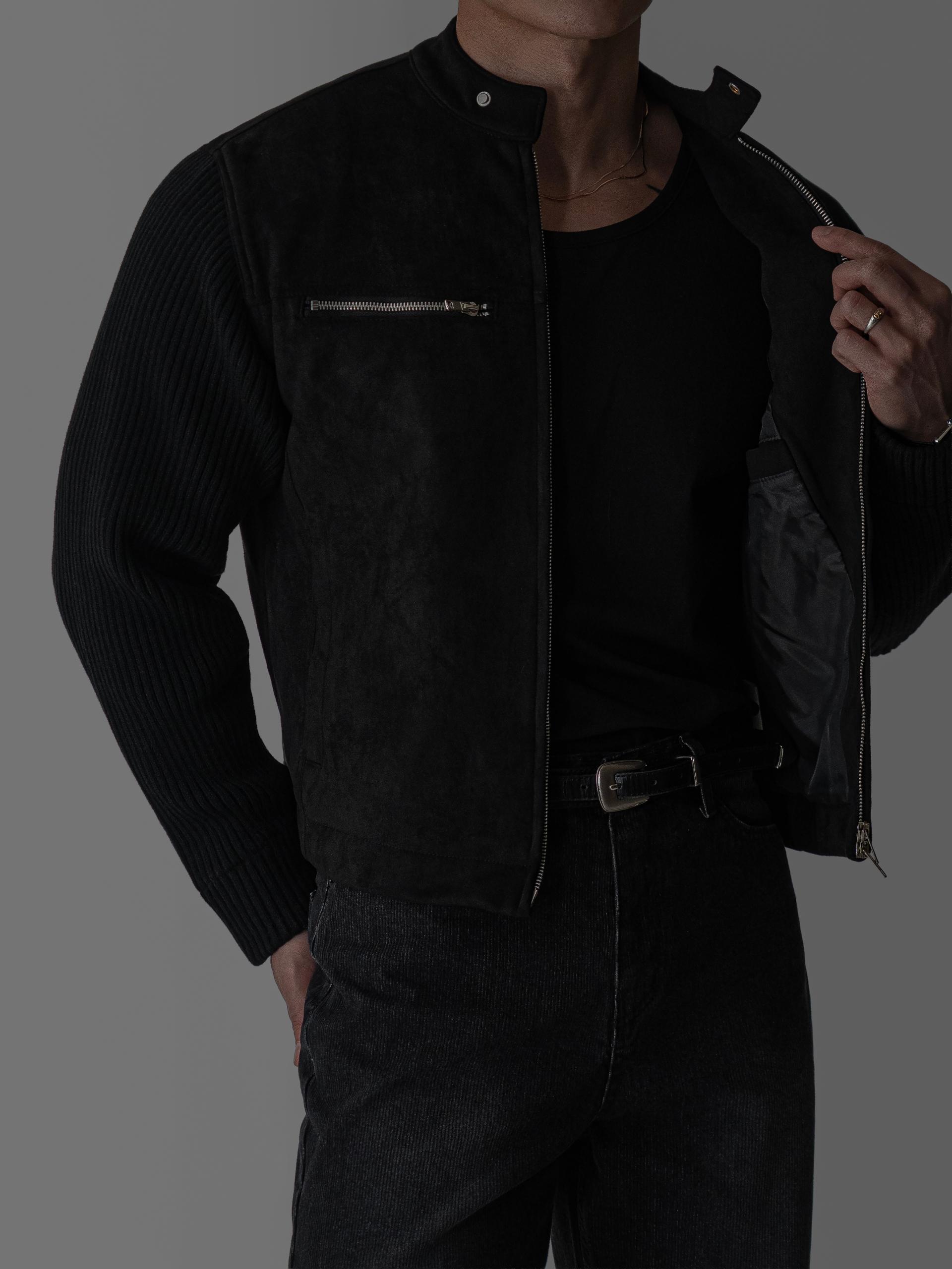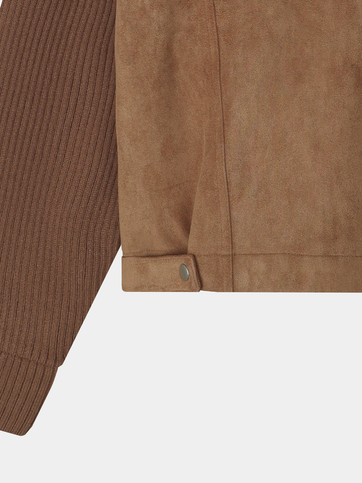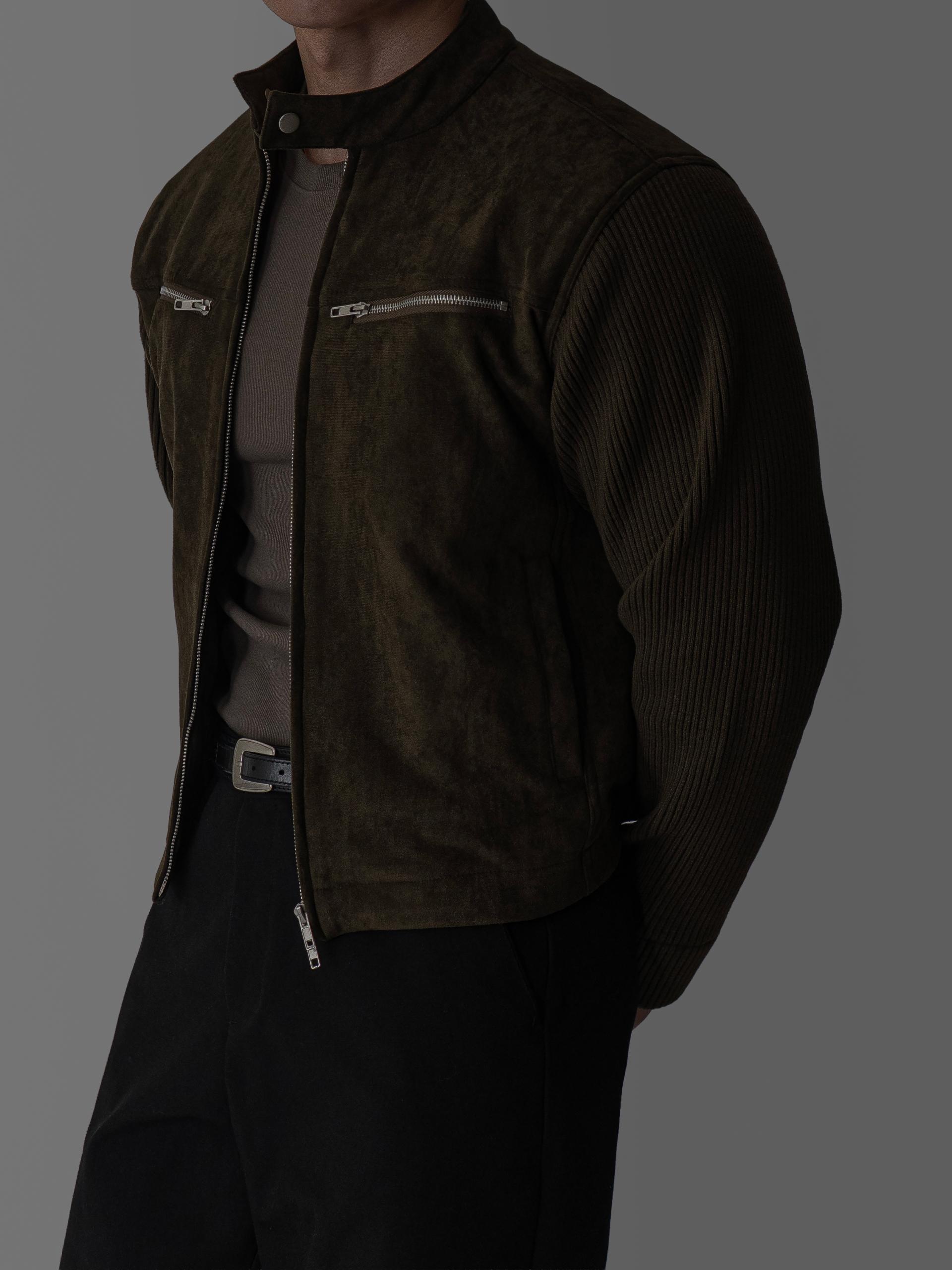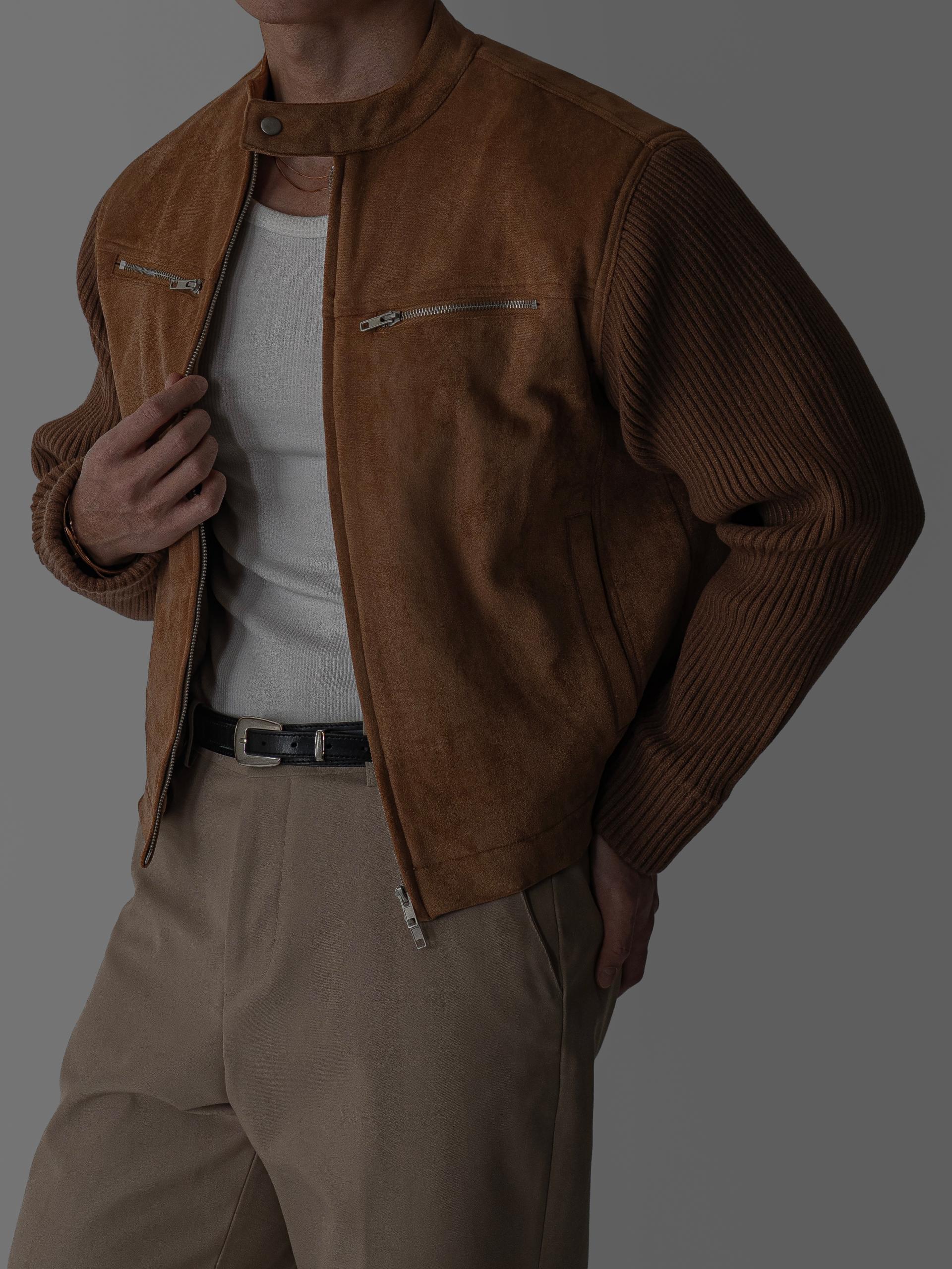 - 합성 스웨이드와 니트 리브 슬리브를 결합한 세련된 실루엣의 자켓