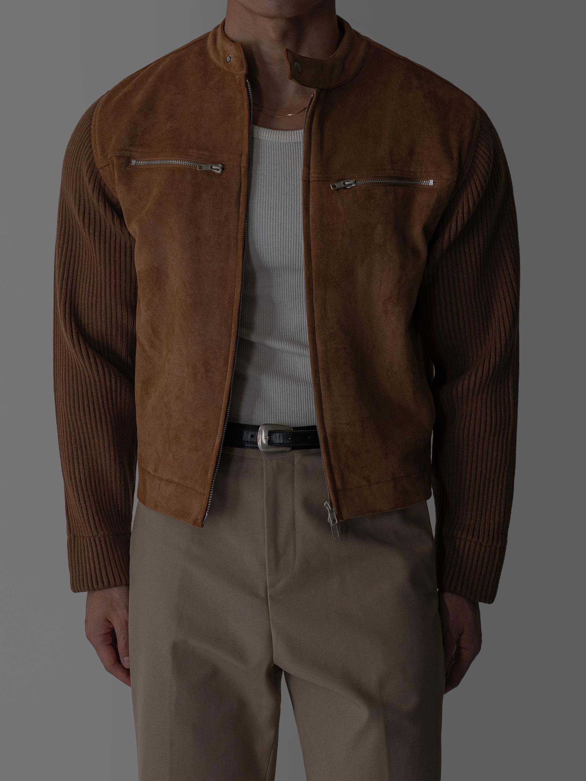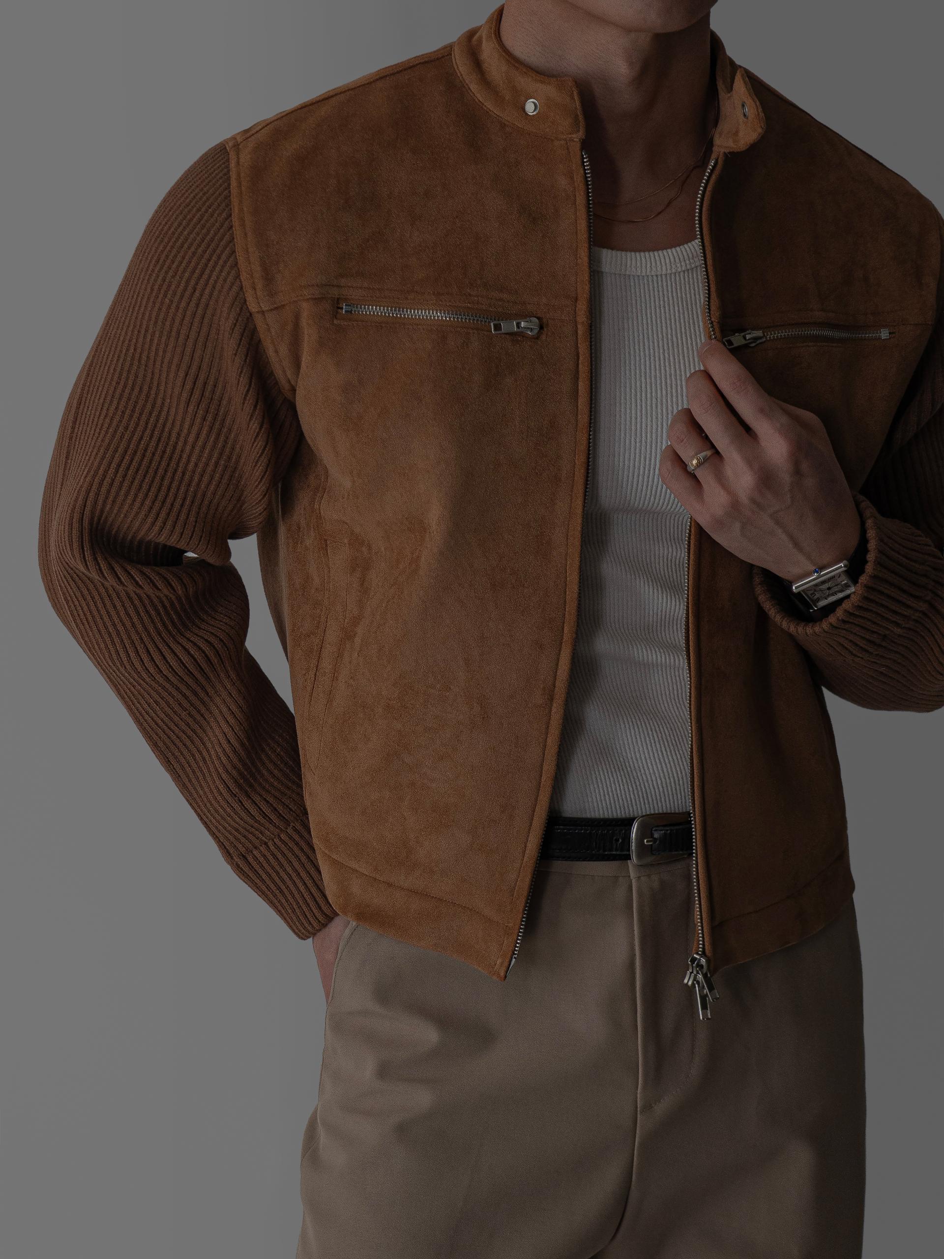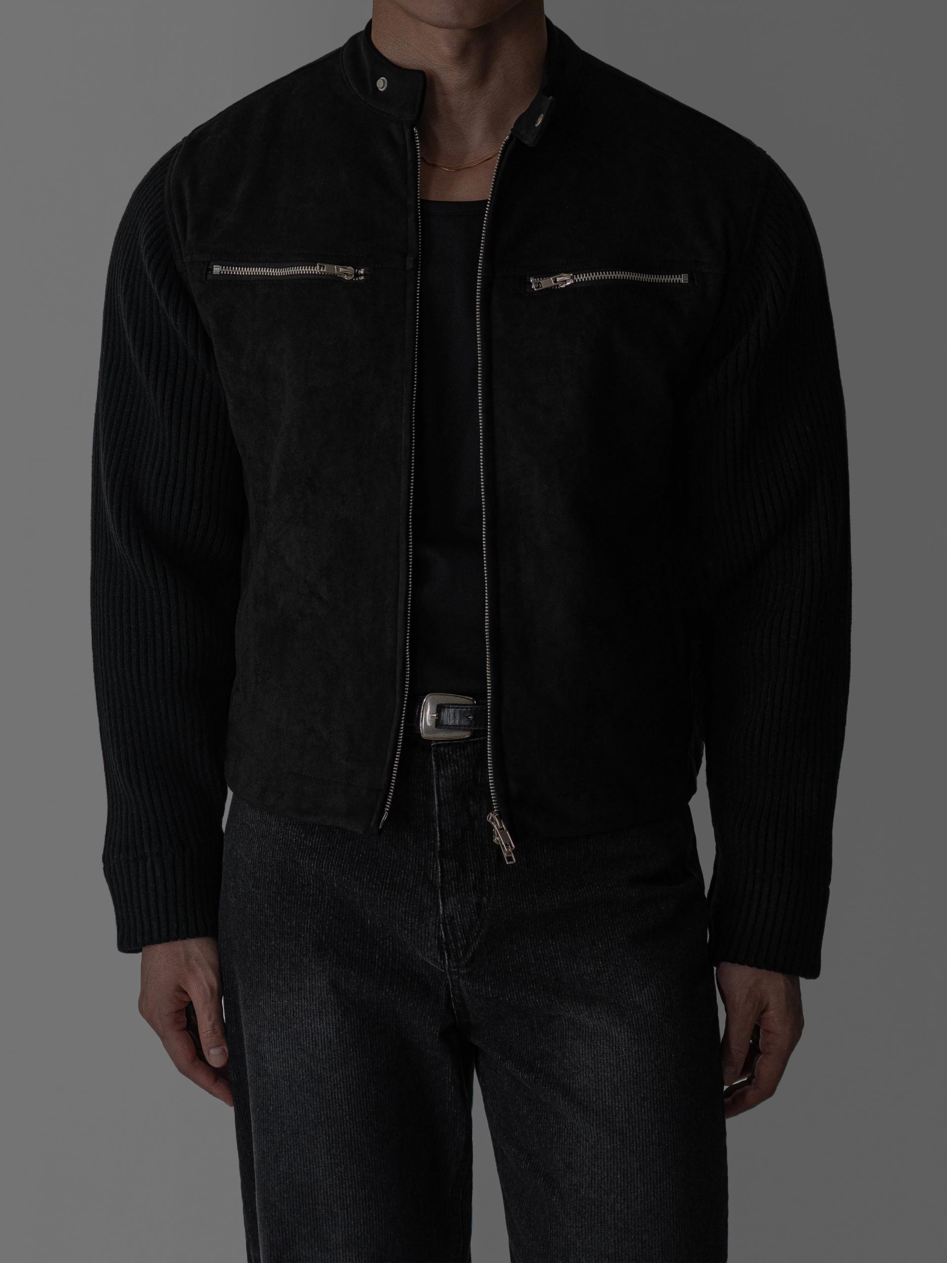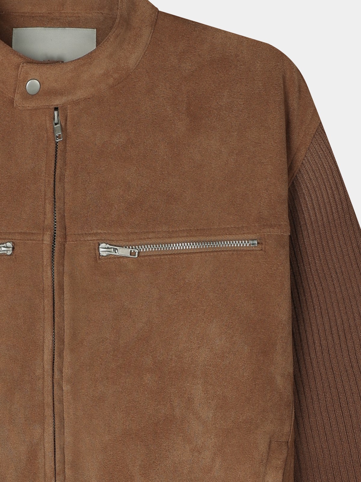 - 합성 스웨이드와 니트 리브 슬리브를 결합한 세련된 실루엣의 자켓