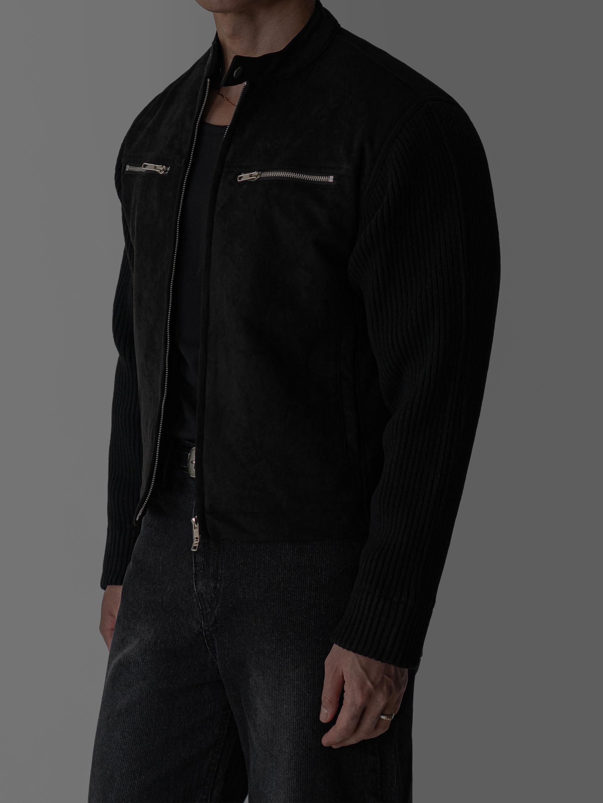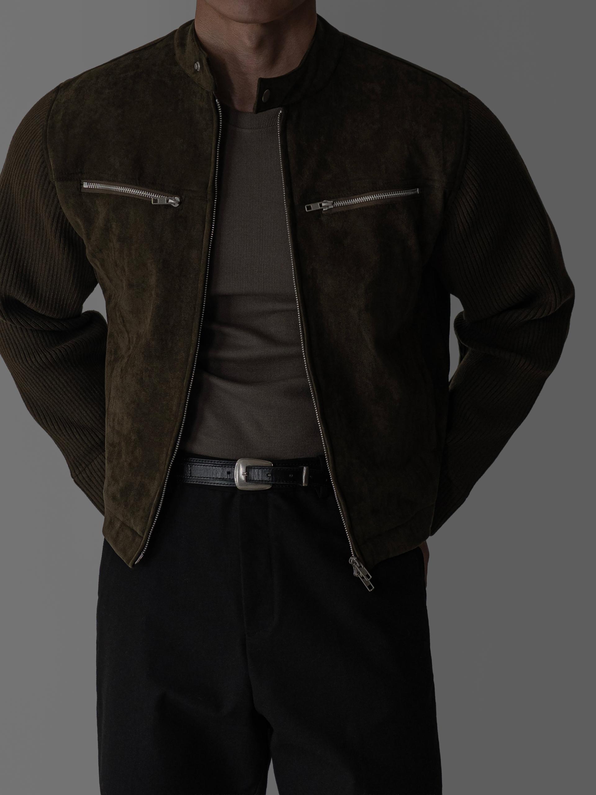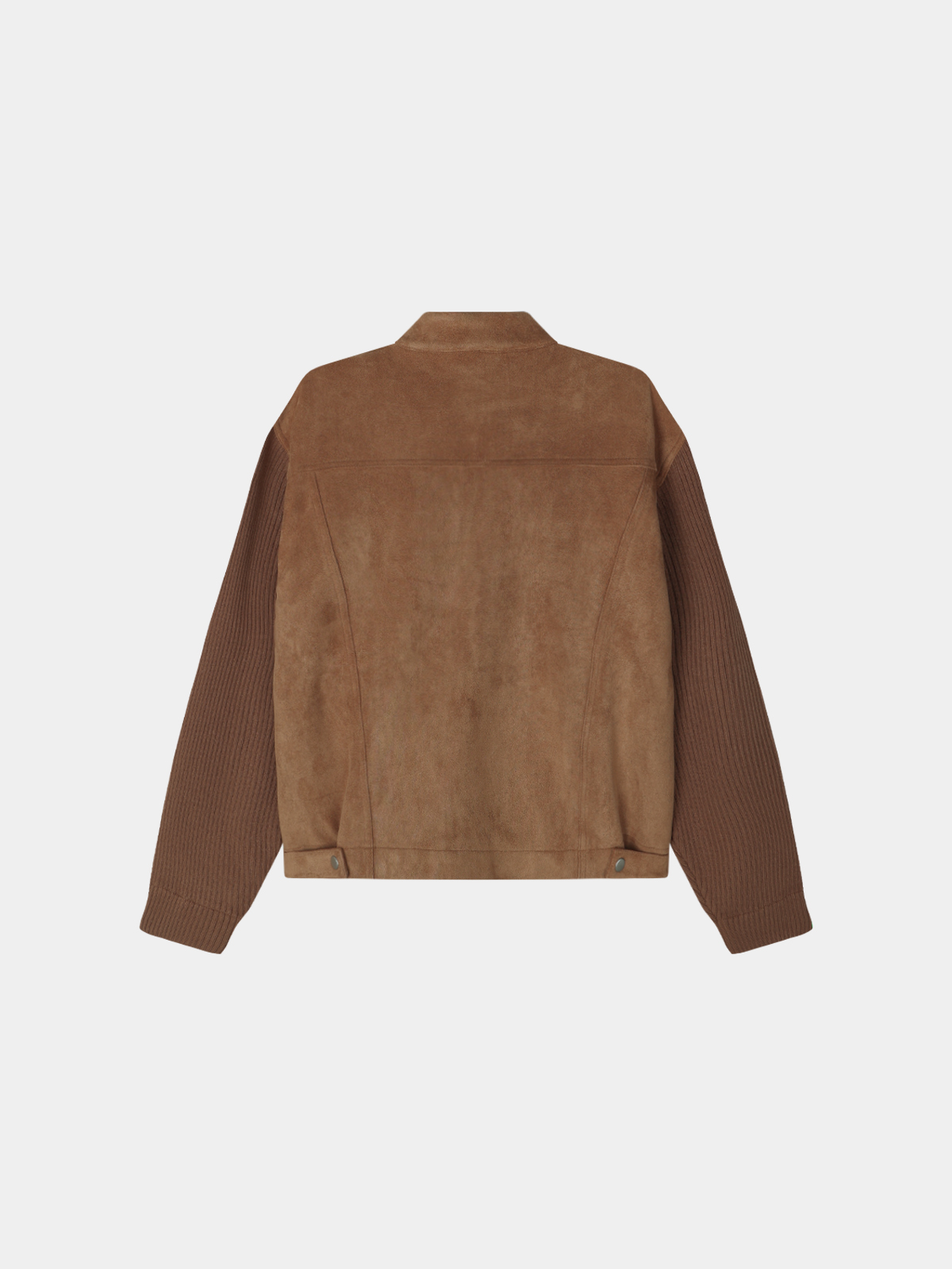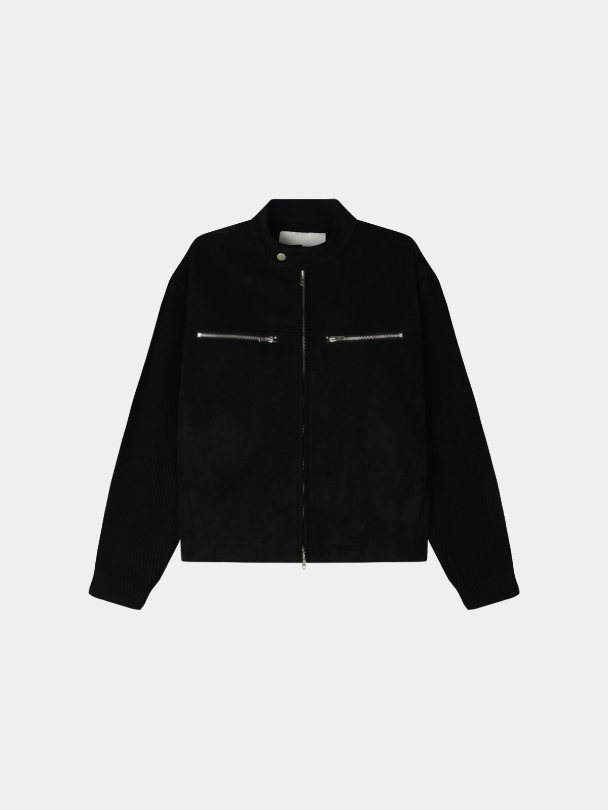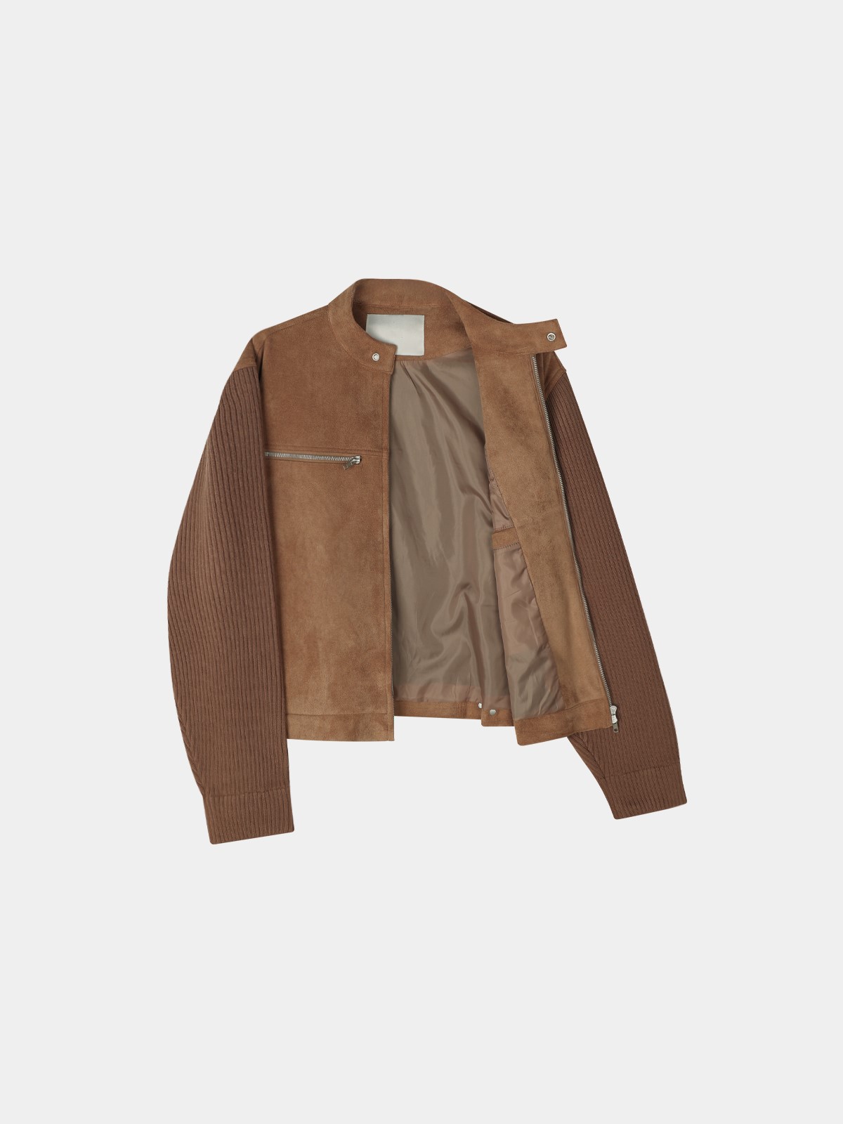 - 합성 스웨이드와 니트 리브 슬리브를 결합한 세련된 실루엣의 자켓