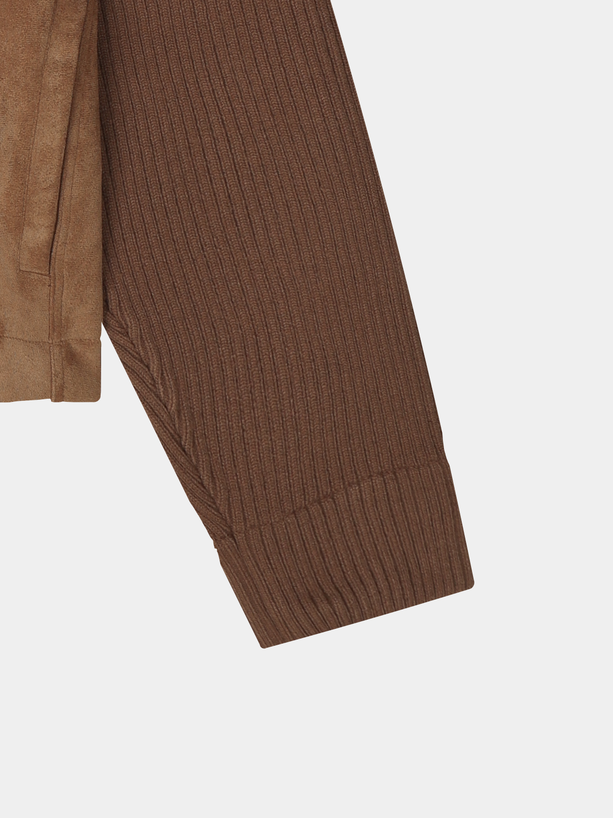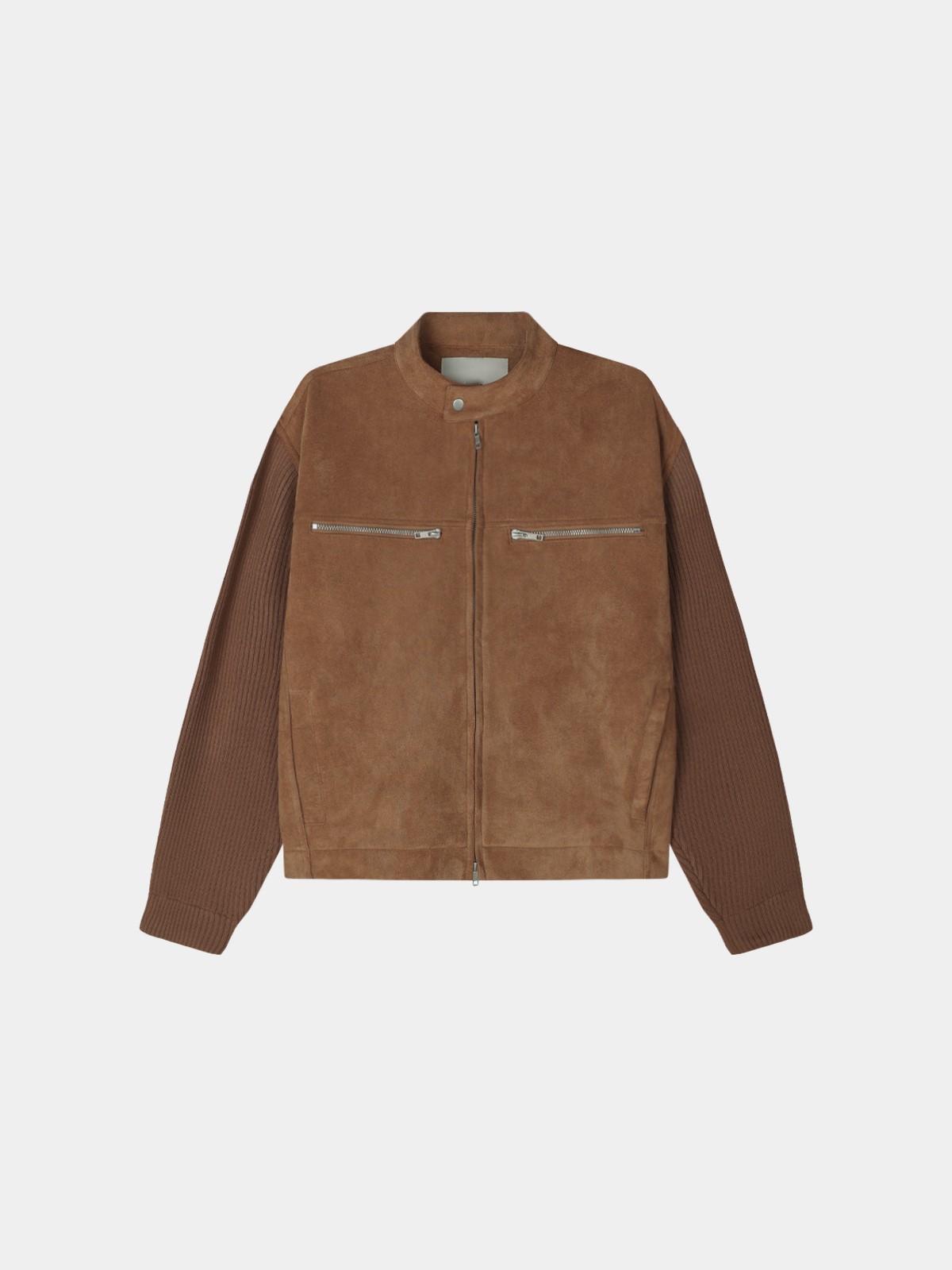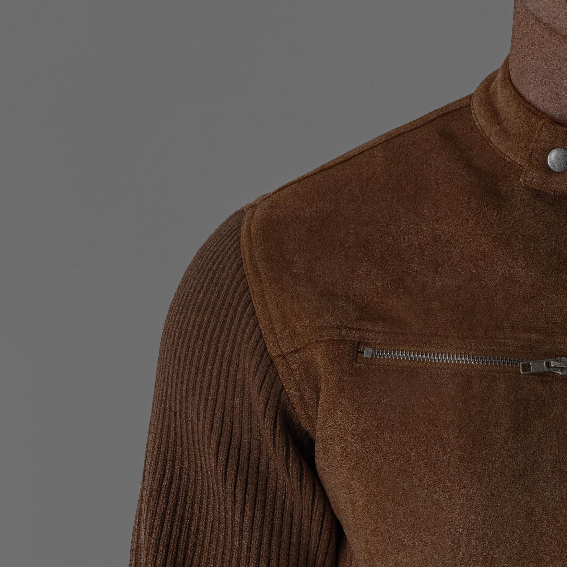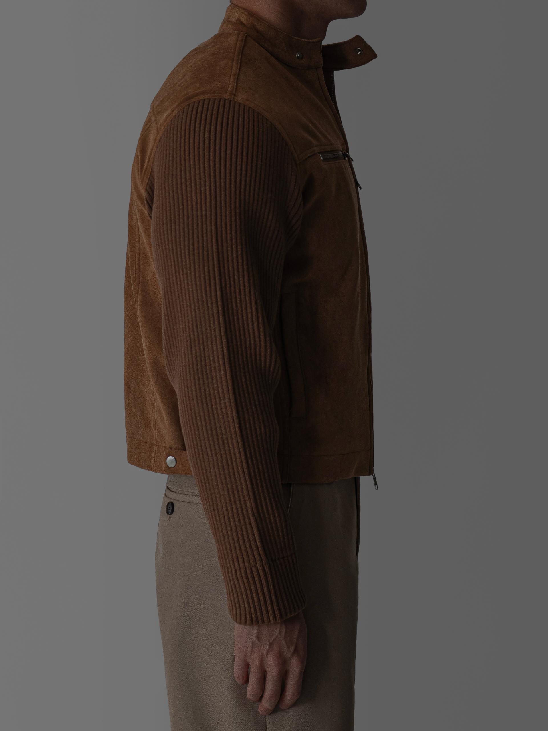- 합성 스웨이드와 니트 리브 슬리브를 결합한 세련된 실루엣의 자켓