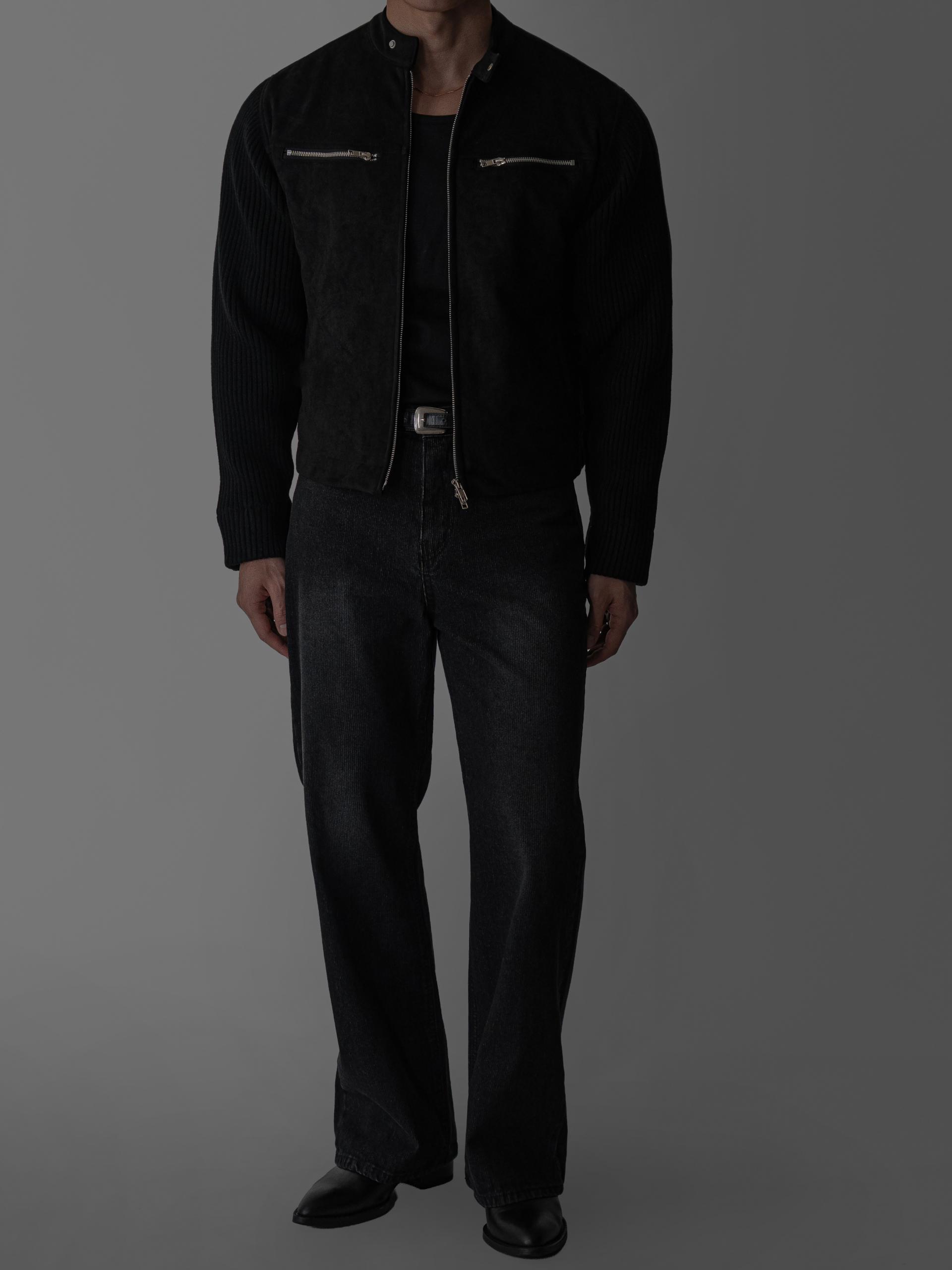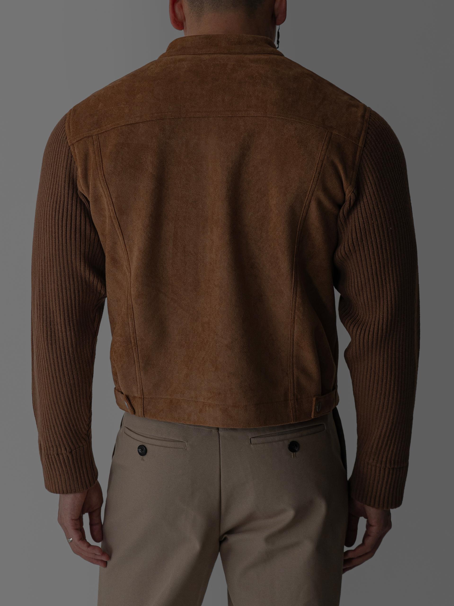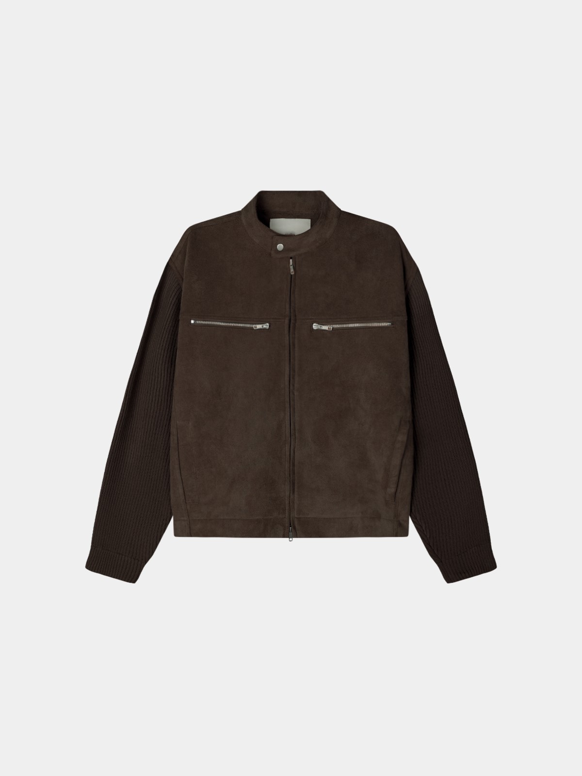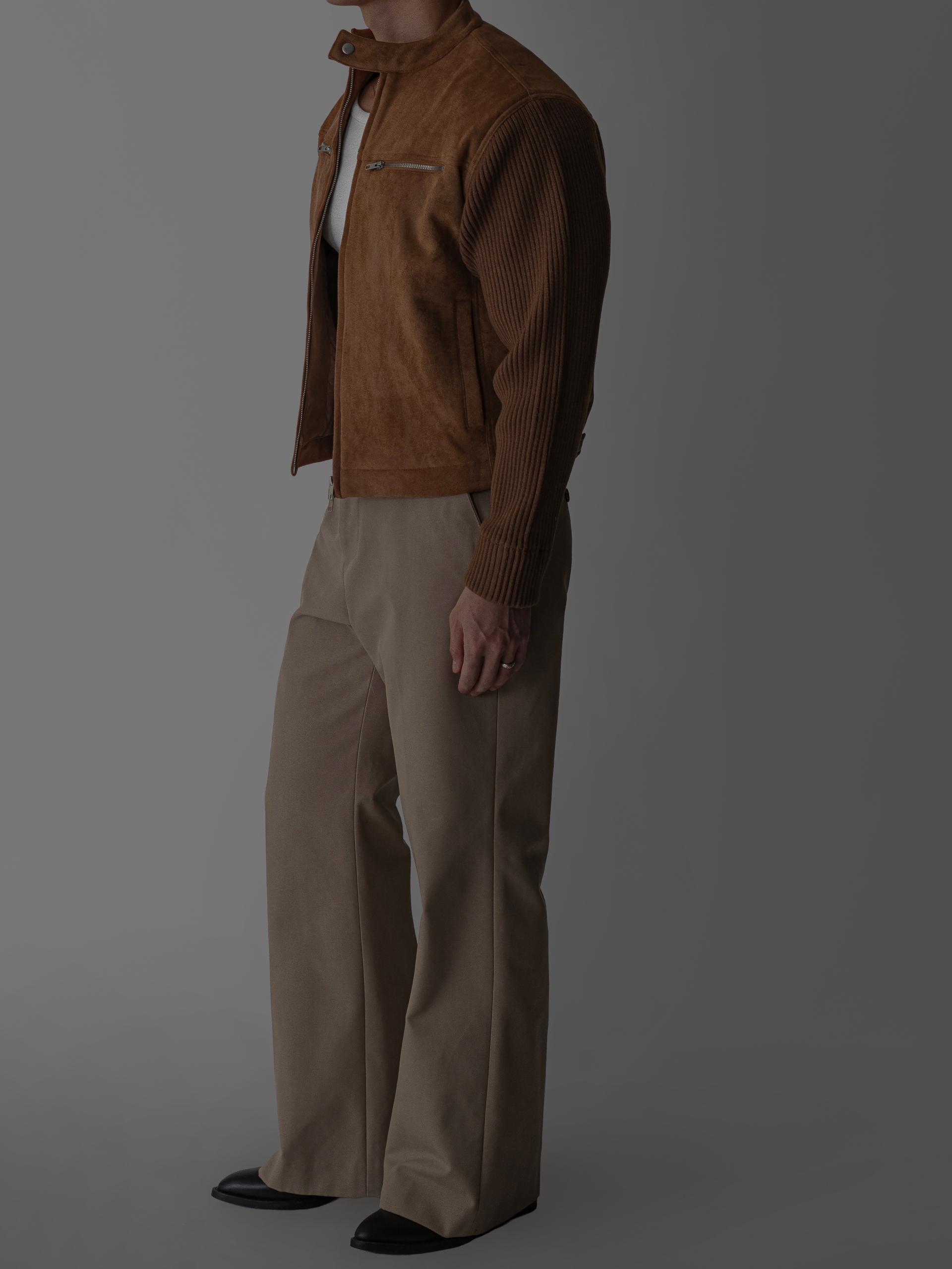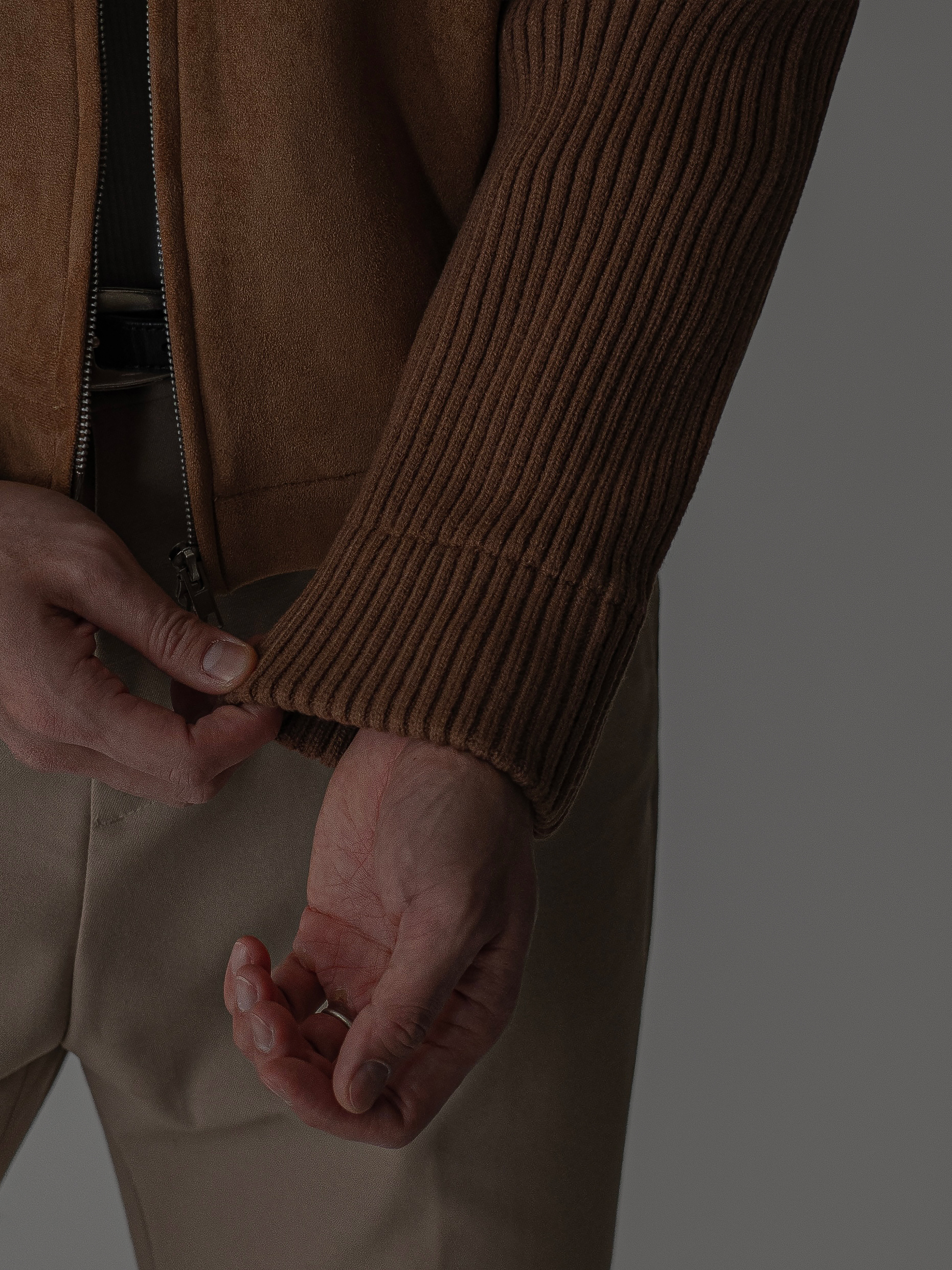 - 합성 스웨이드와 니트 리브 슬리브를 결합한 세련된 실루엣의 자켓