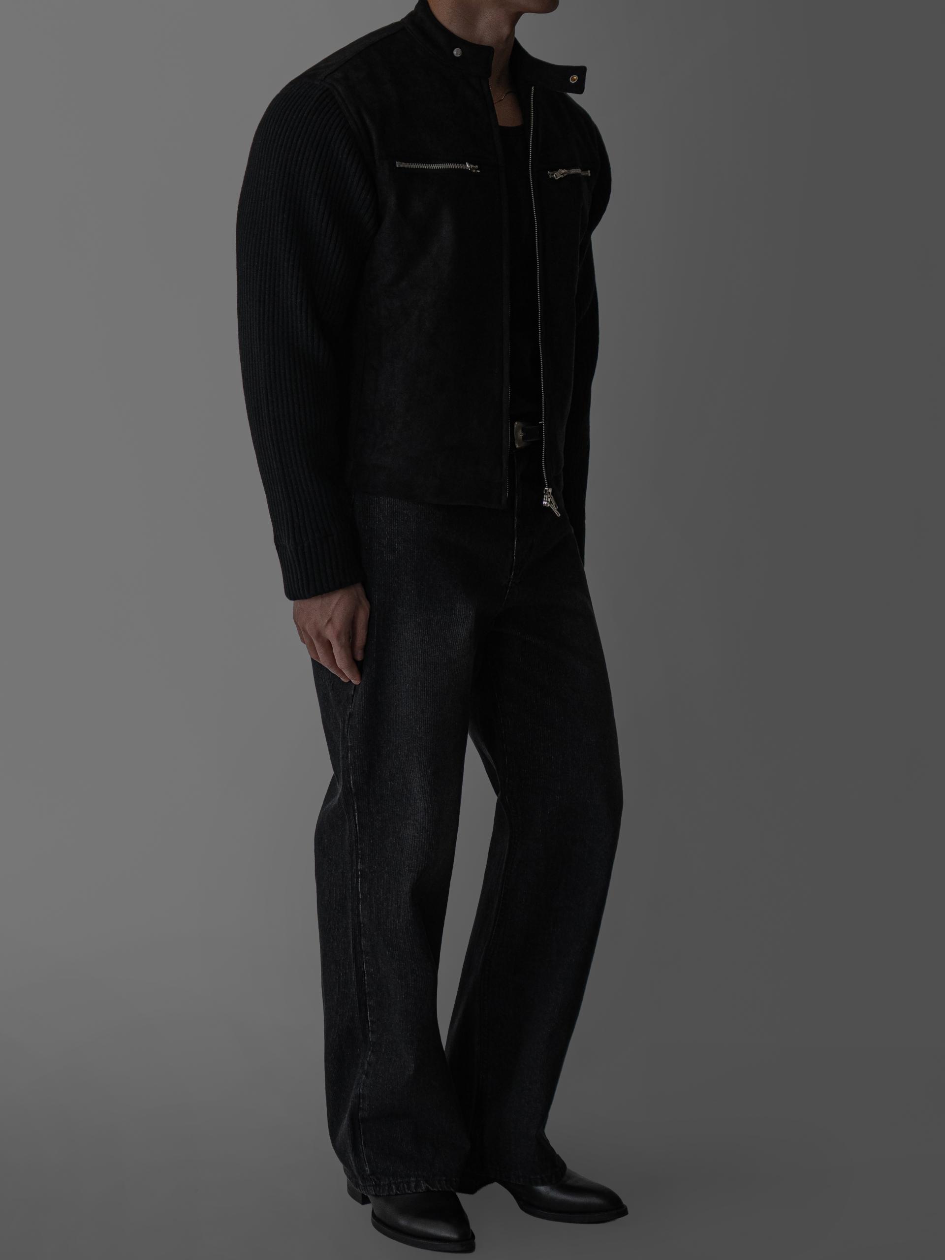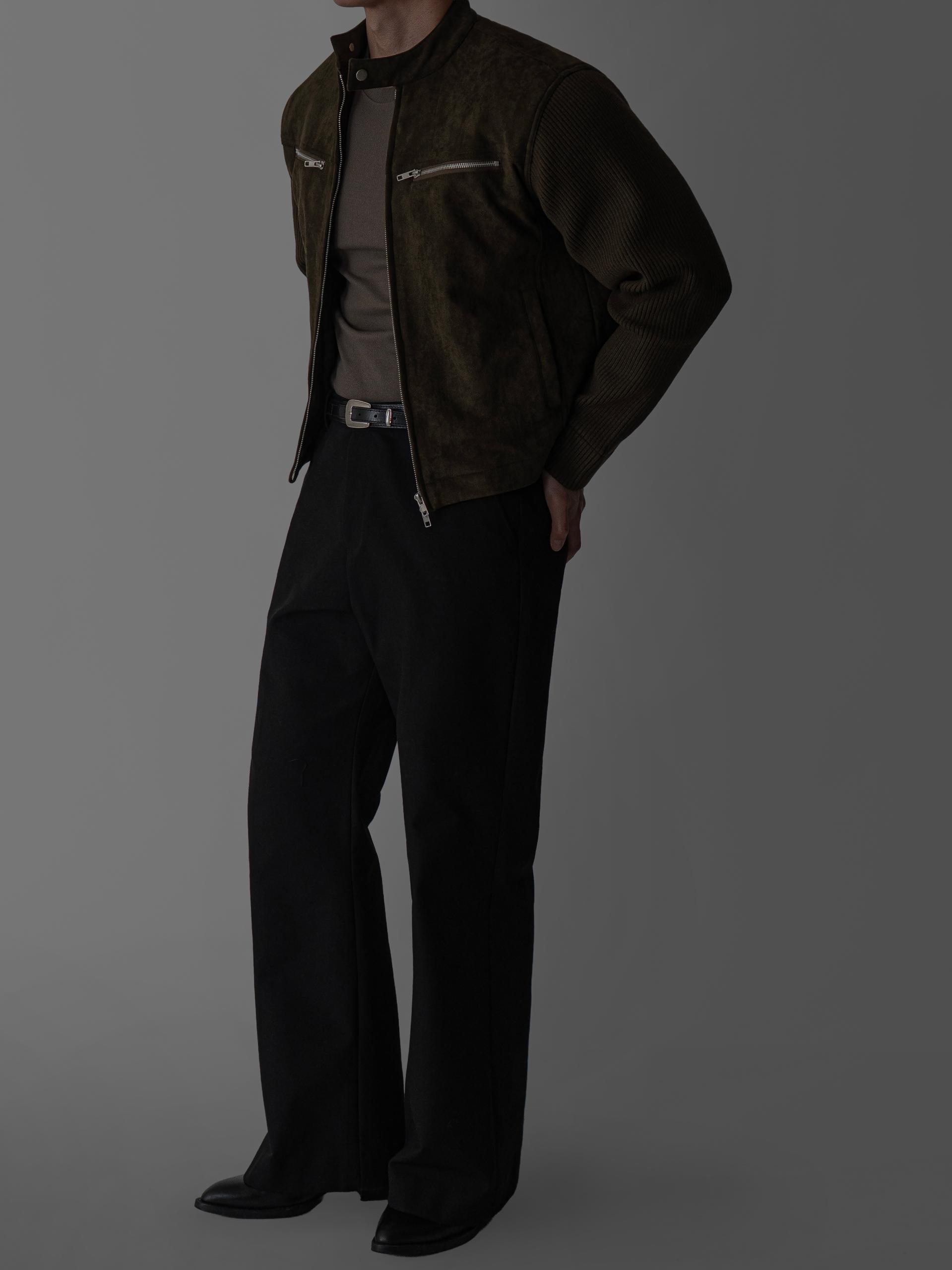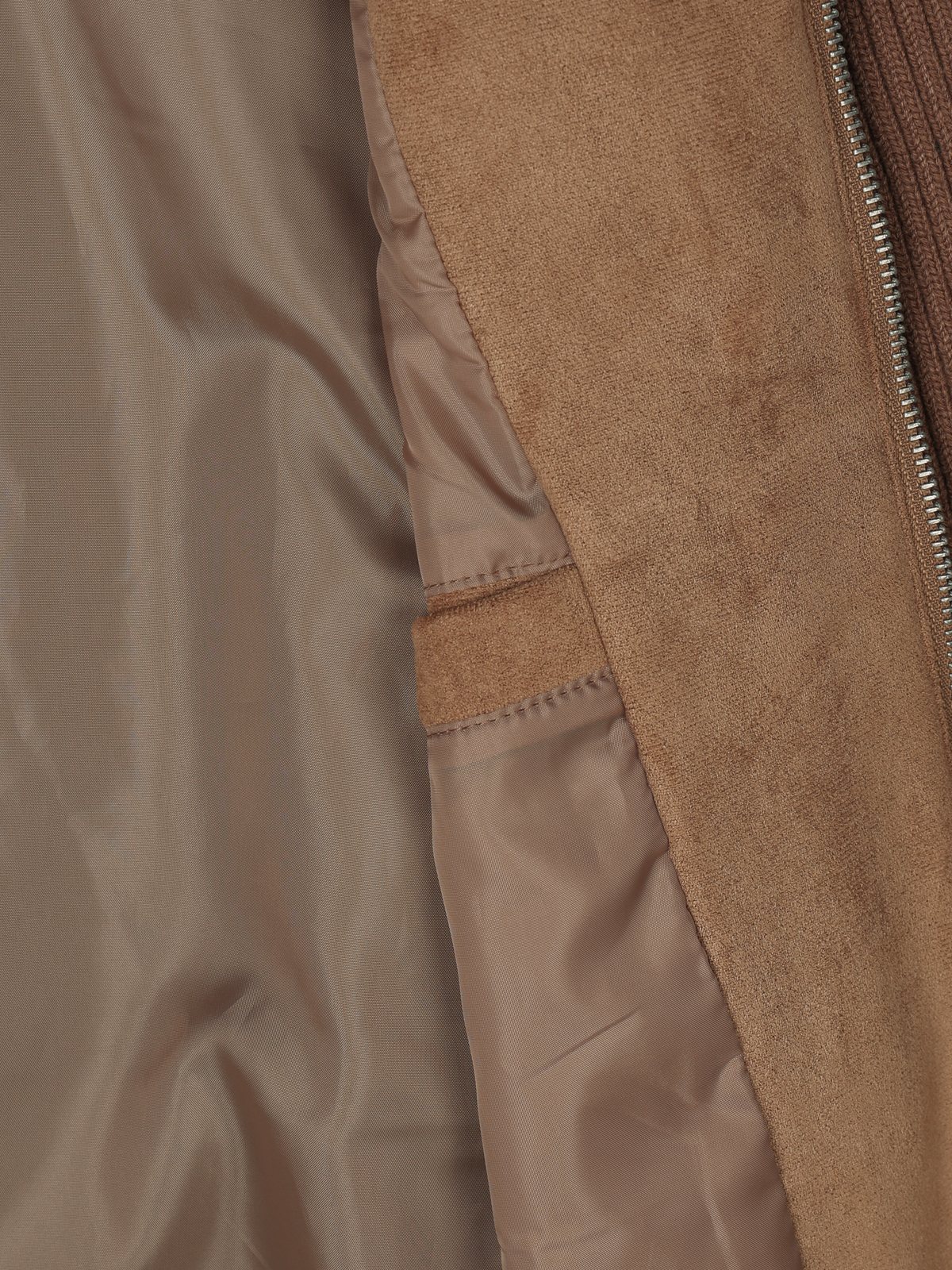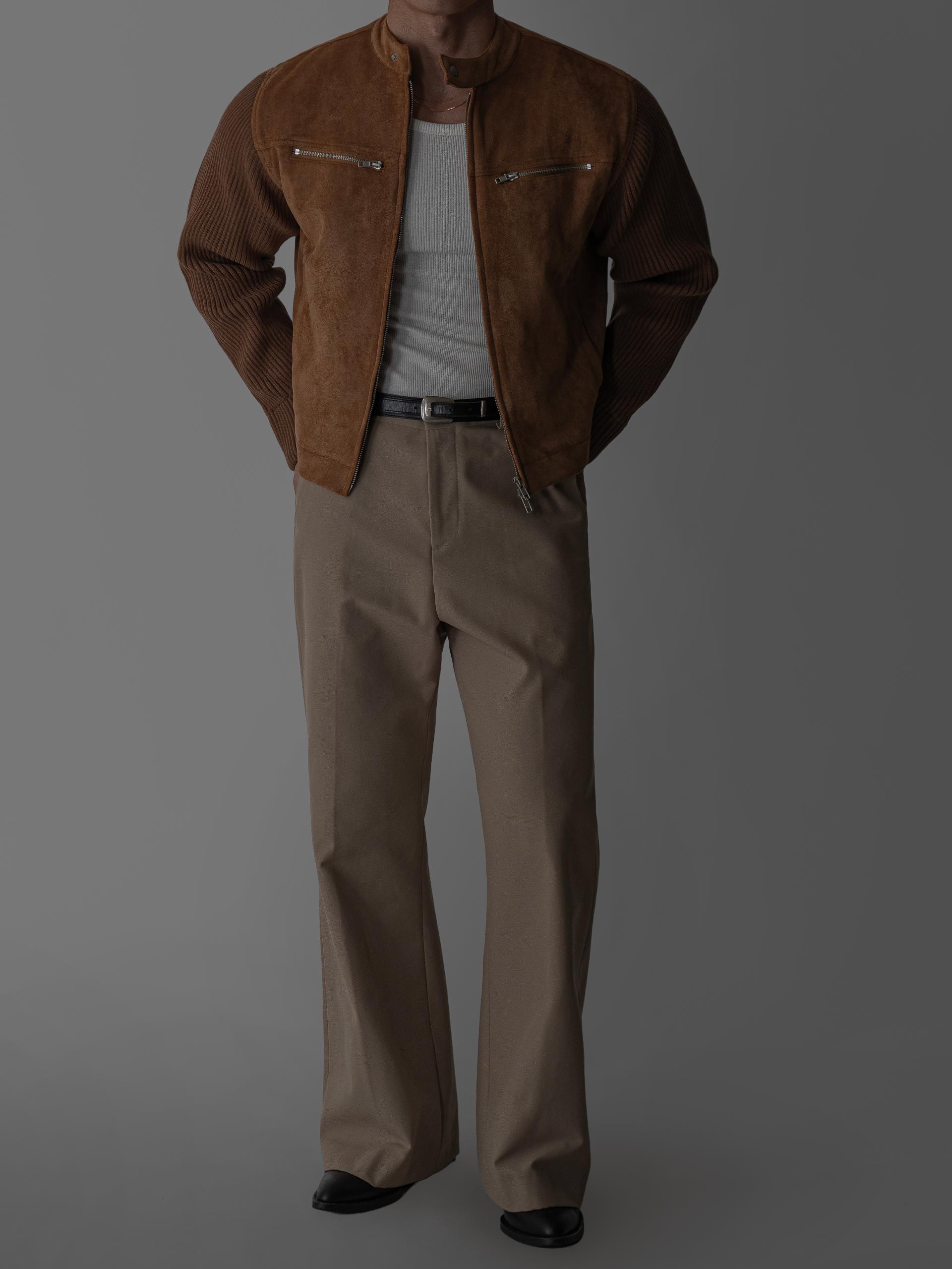 - 합성 스웨이드와 니트 리브 슬리브를 결합한 세련된 실루엣의 자켓