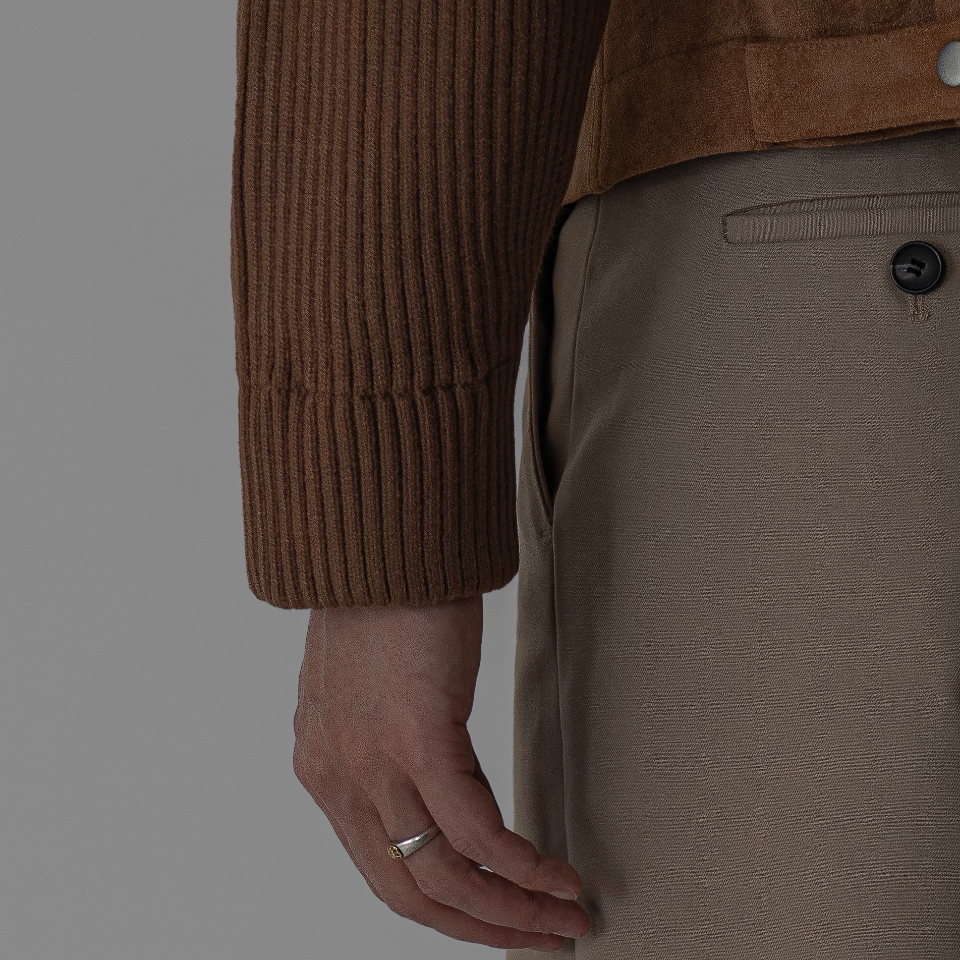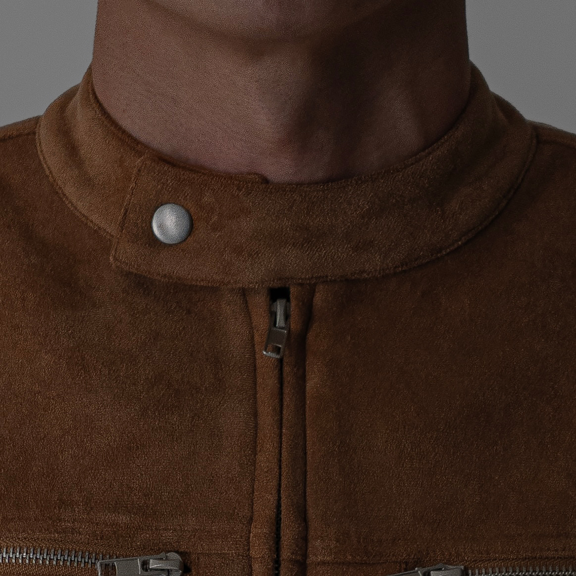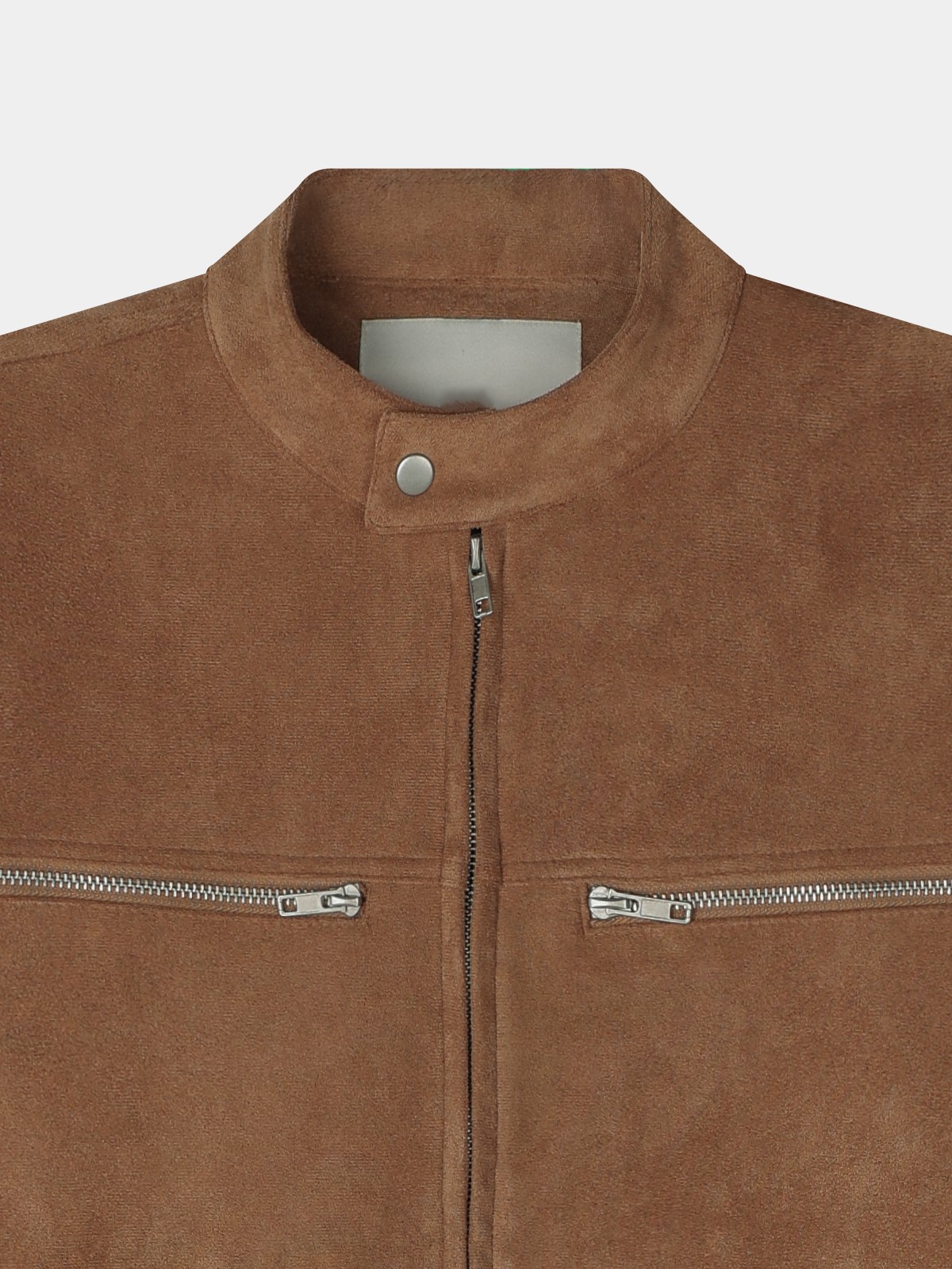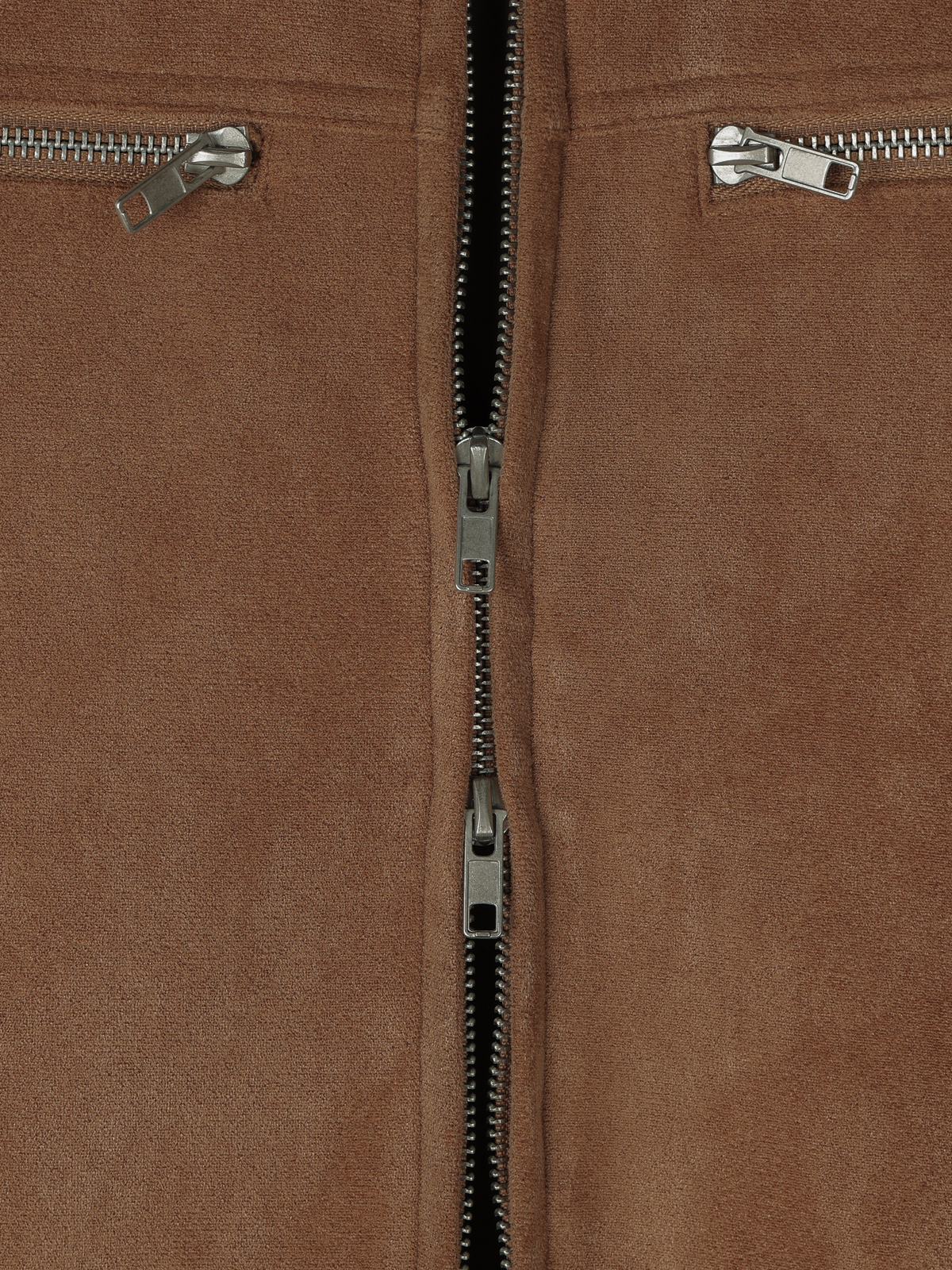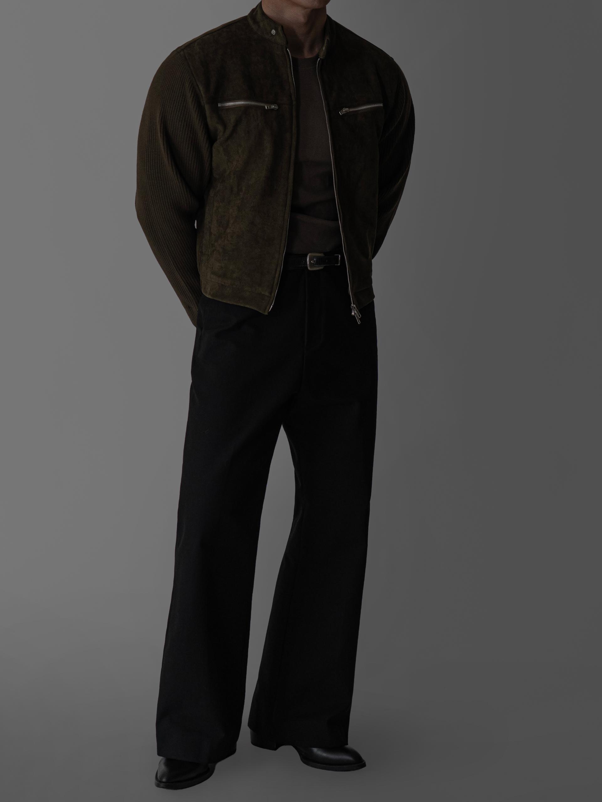 - 합성 스웨이드와 니트 리브 슬리브를 결합한 세련된 실루엣의 자켓