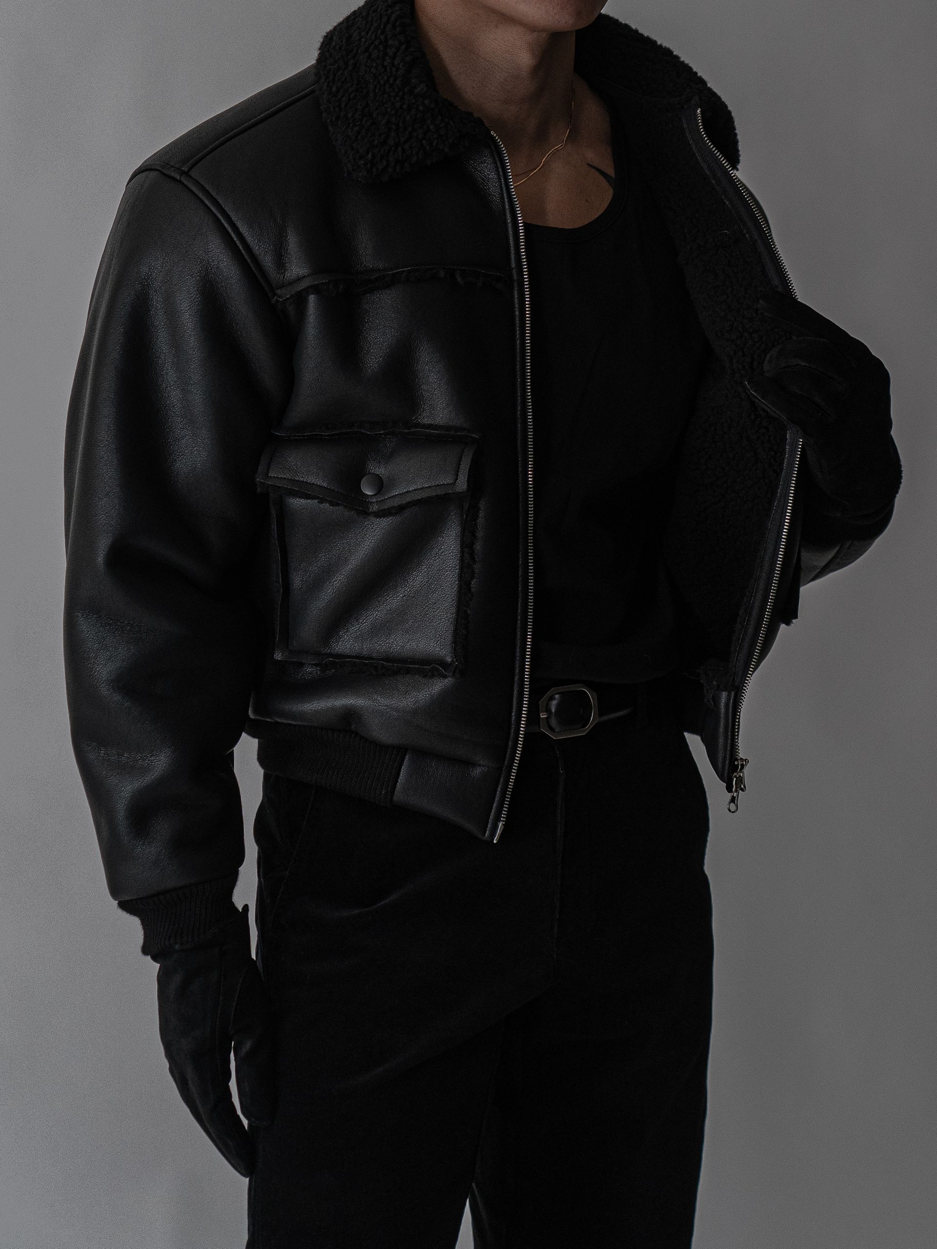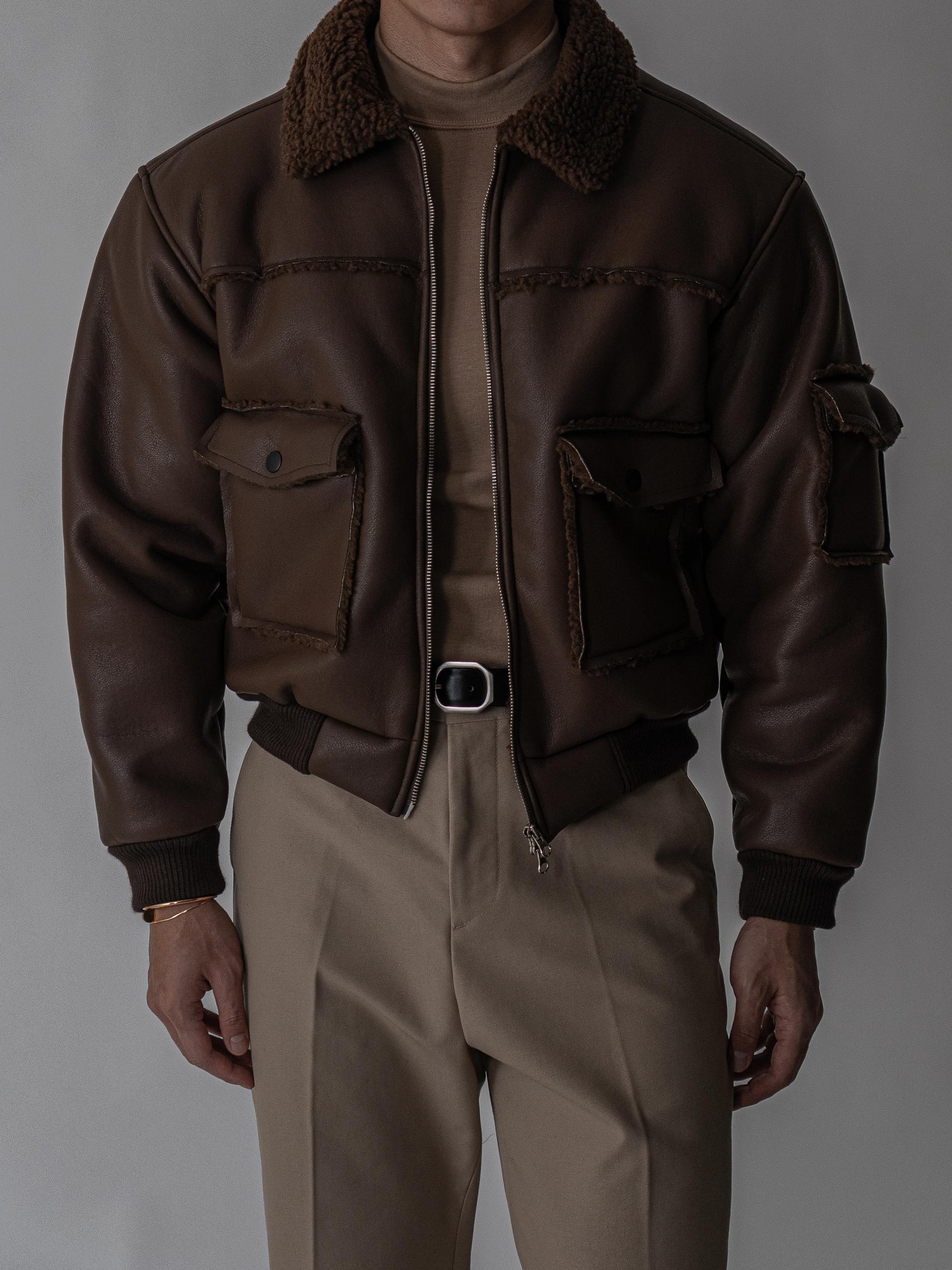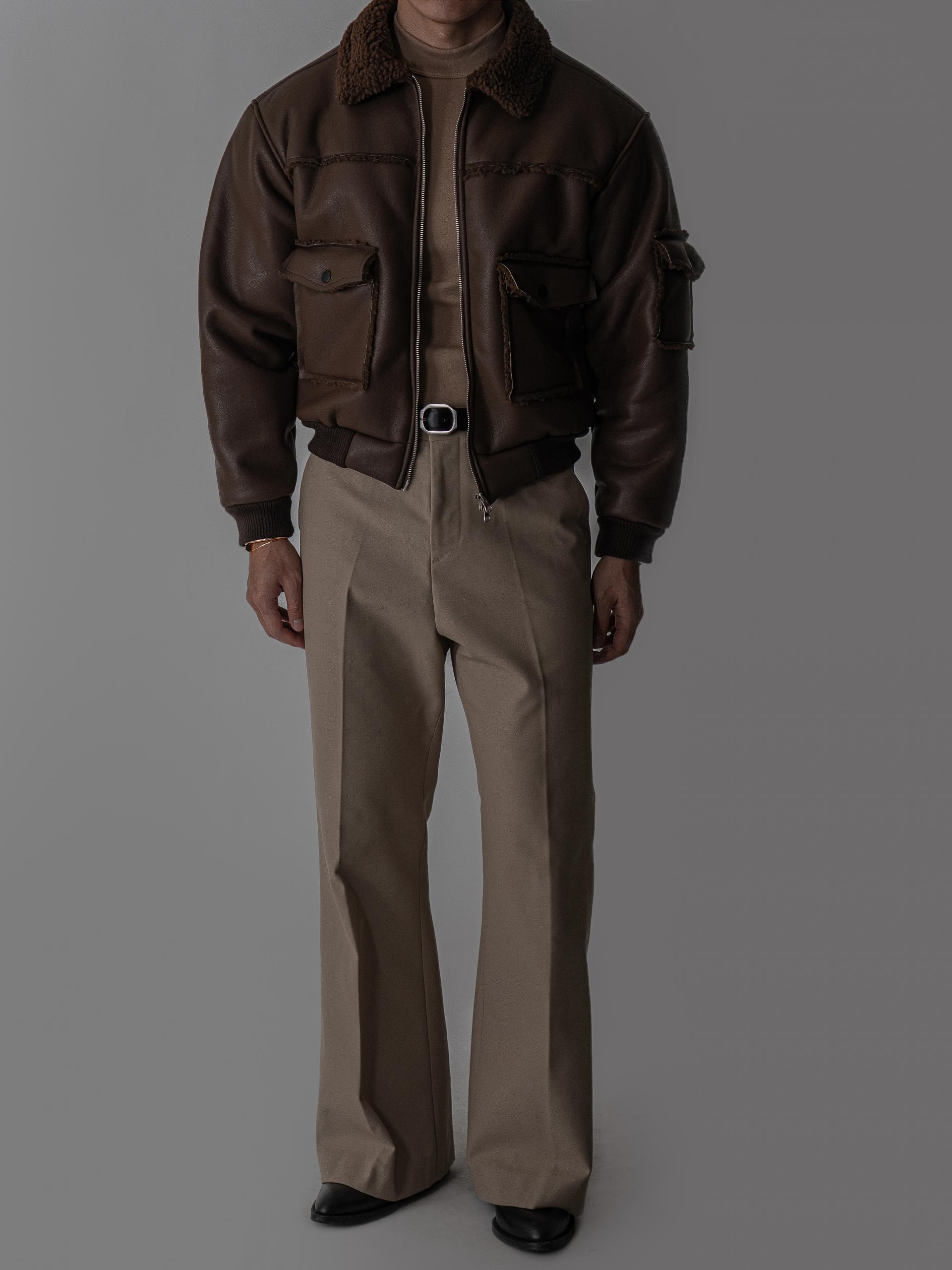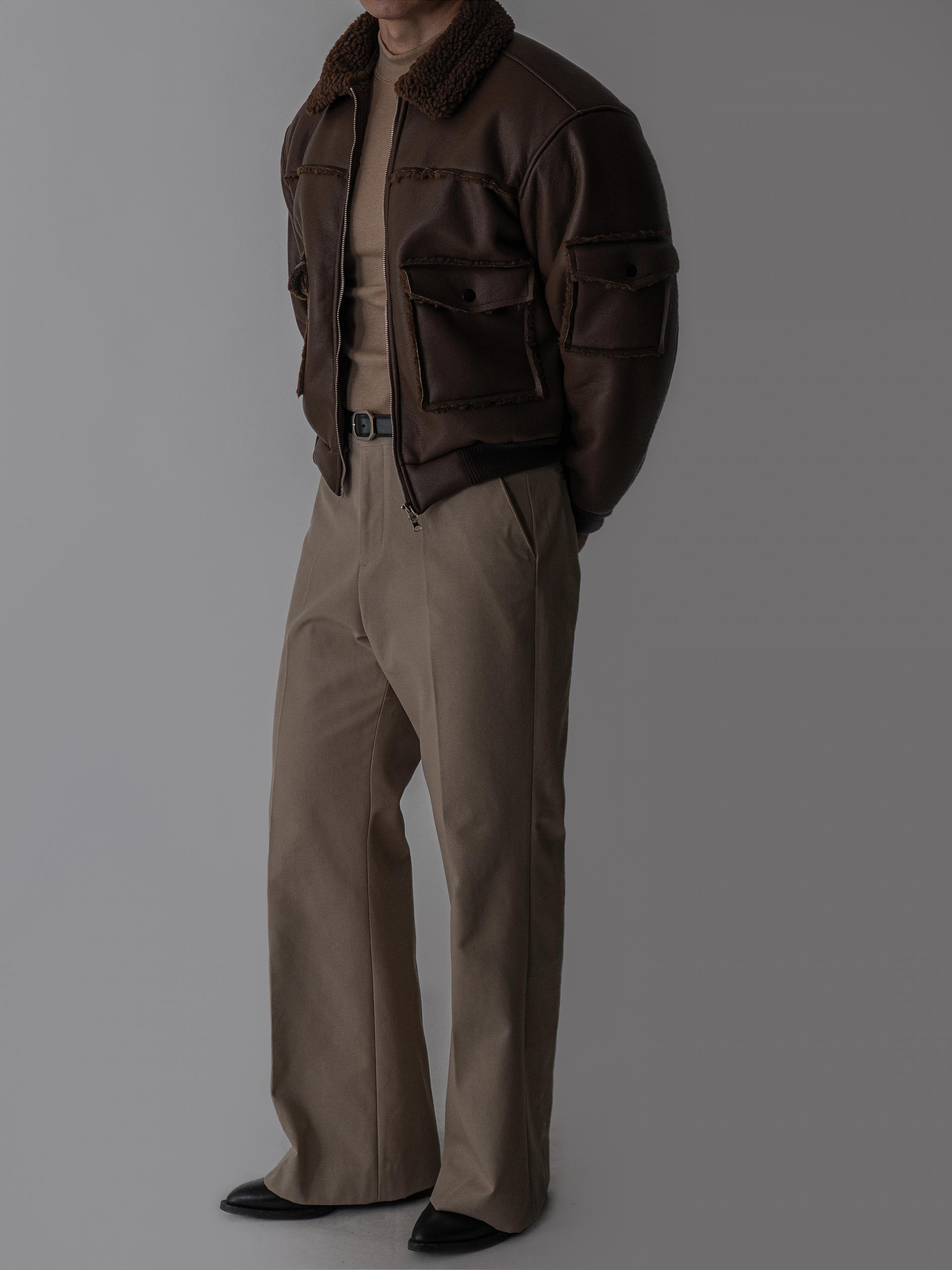 - 크롭 기장의 구조적인 실루엣으로 남성적인 라인을 강조한 아우터