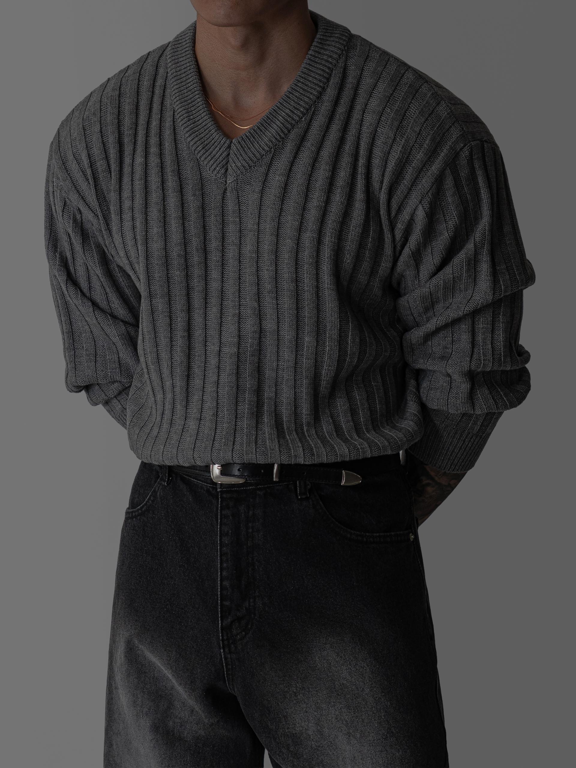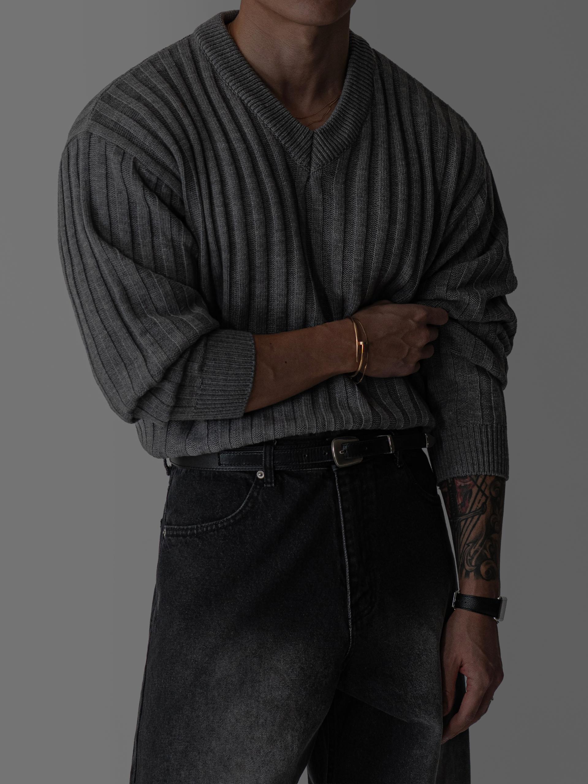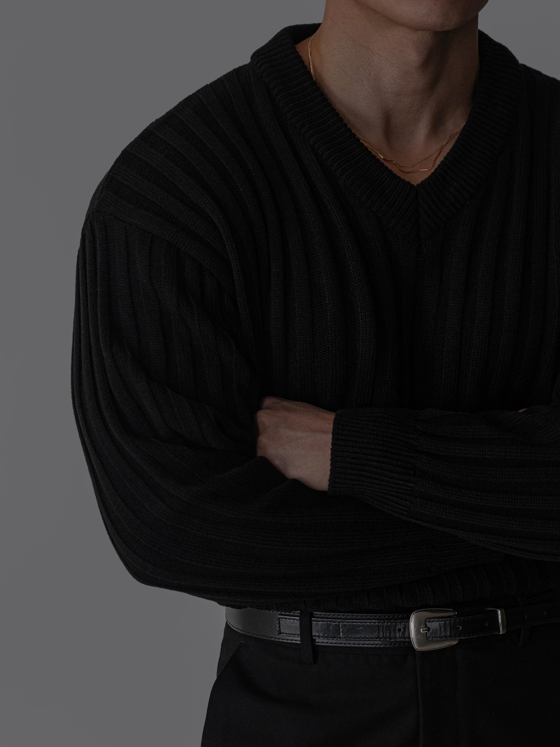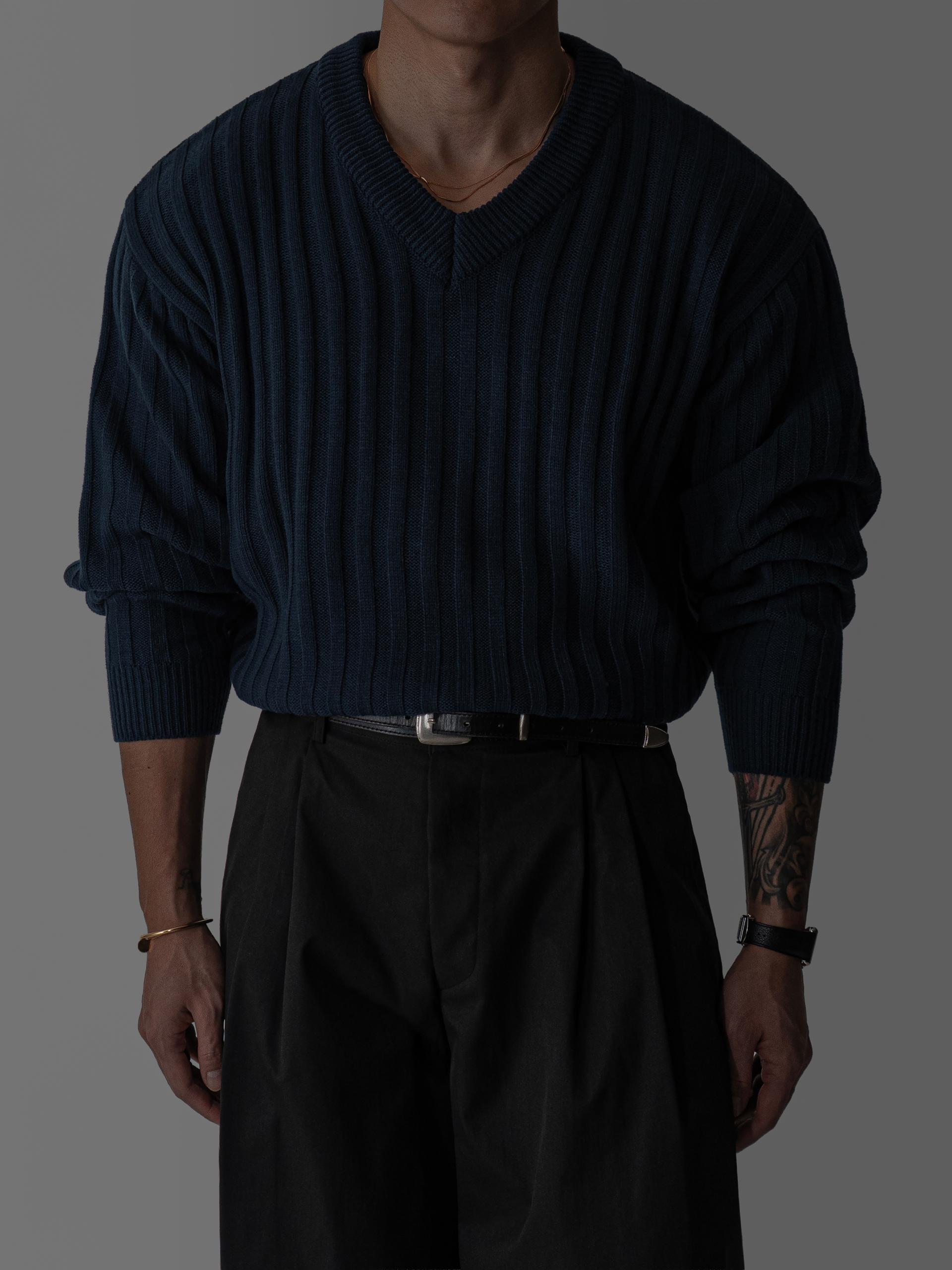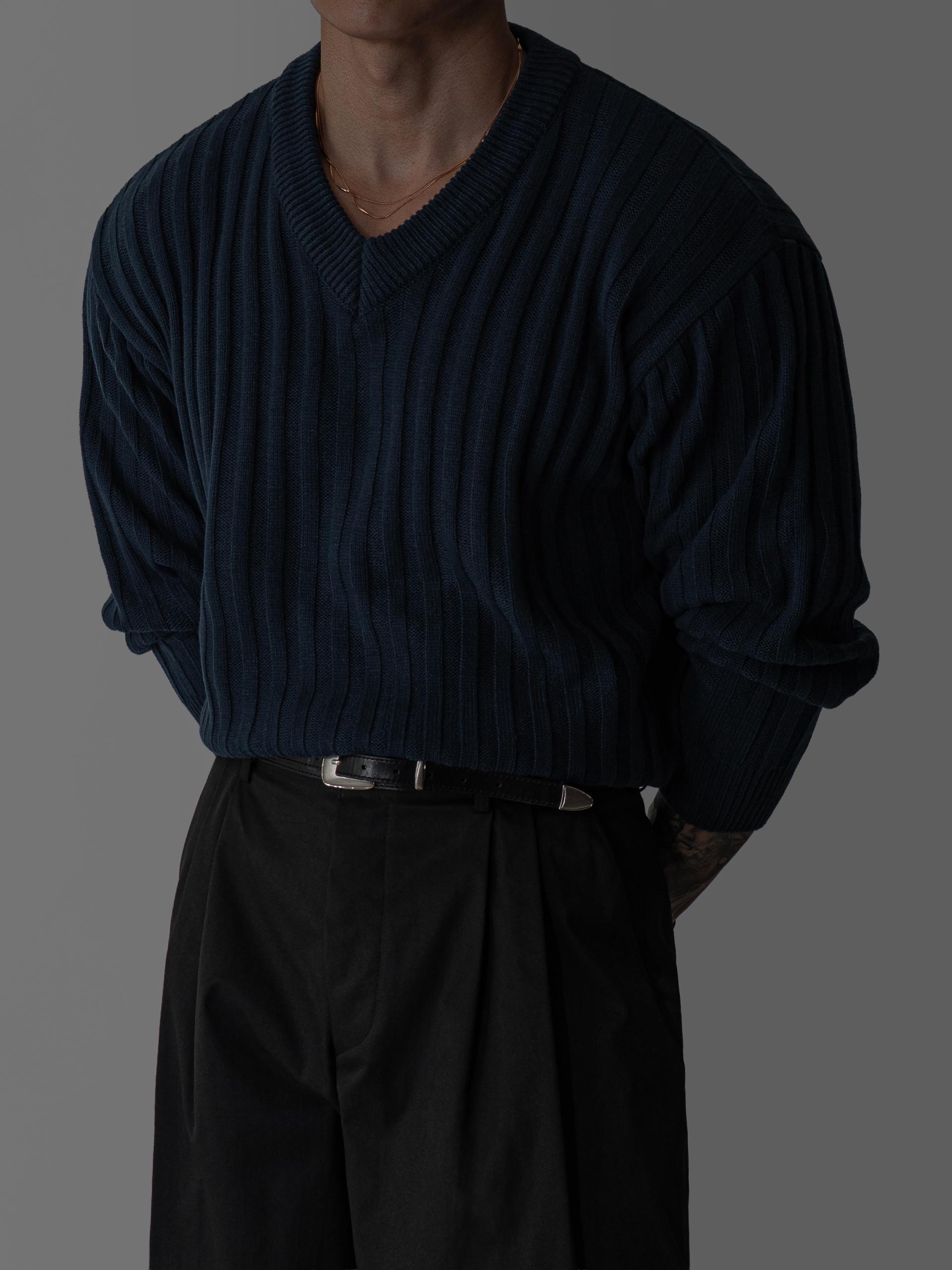 - 두꺼운 세로 골지 조직으로 상체 라인을 확실하게 부각시키는 브이넥 니트