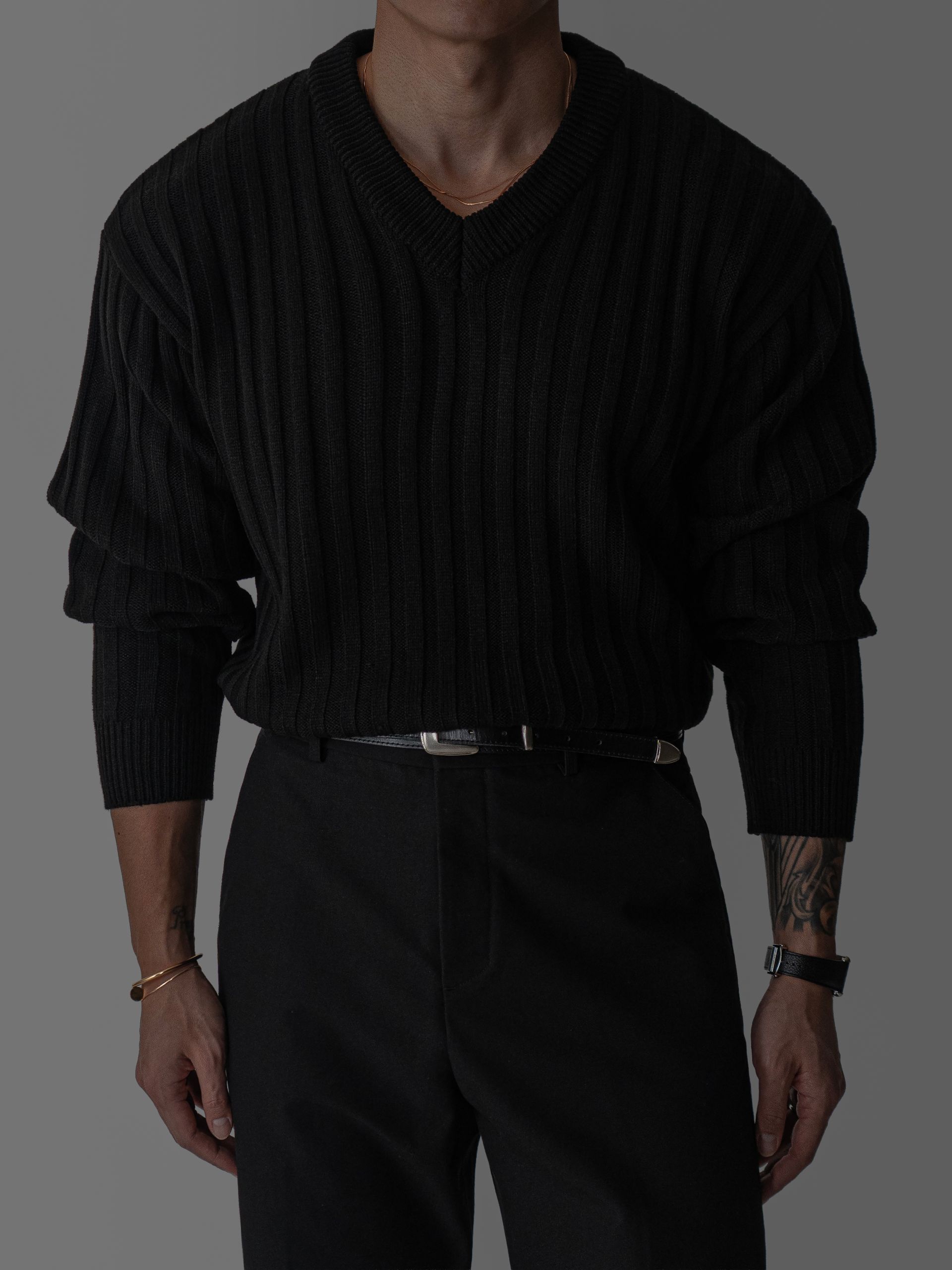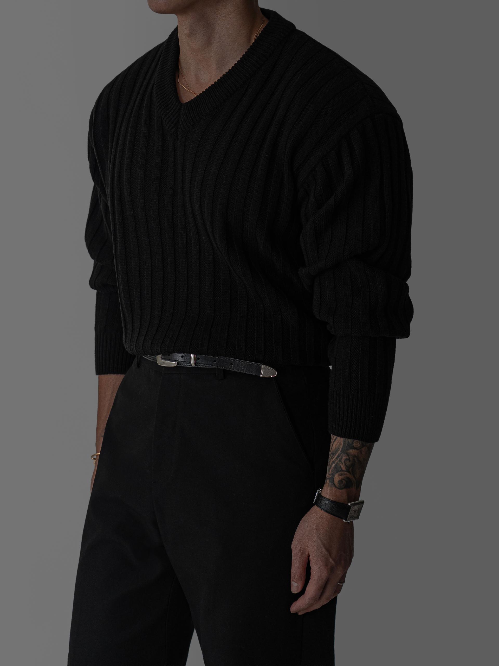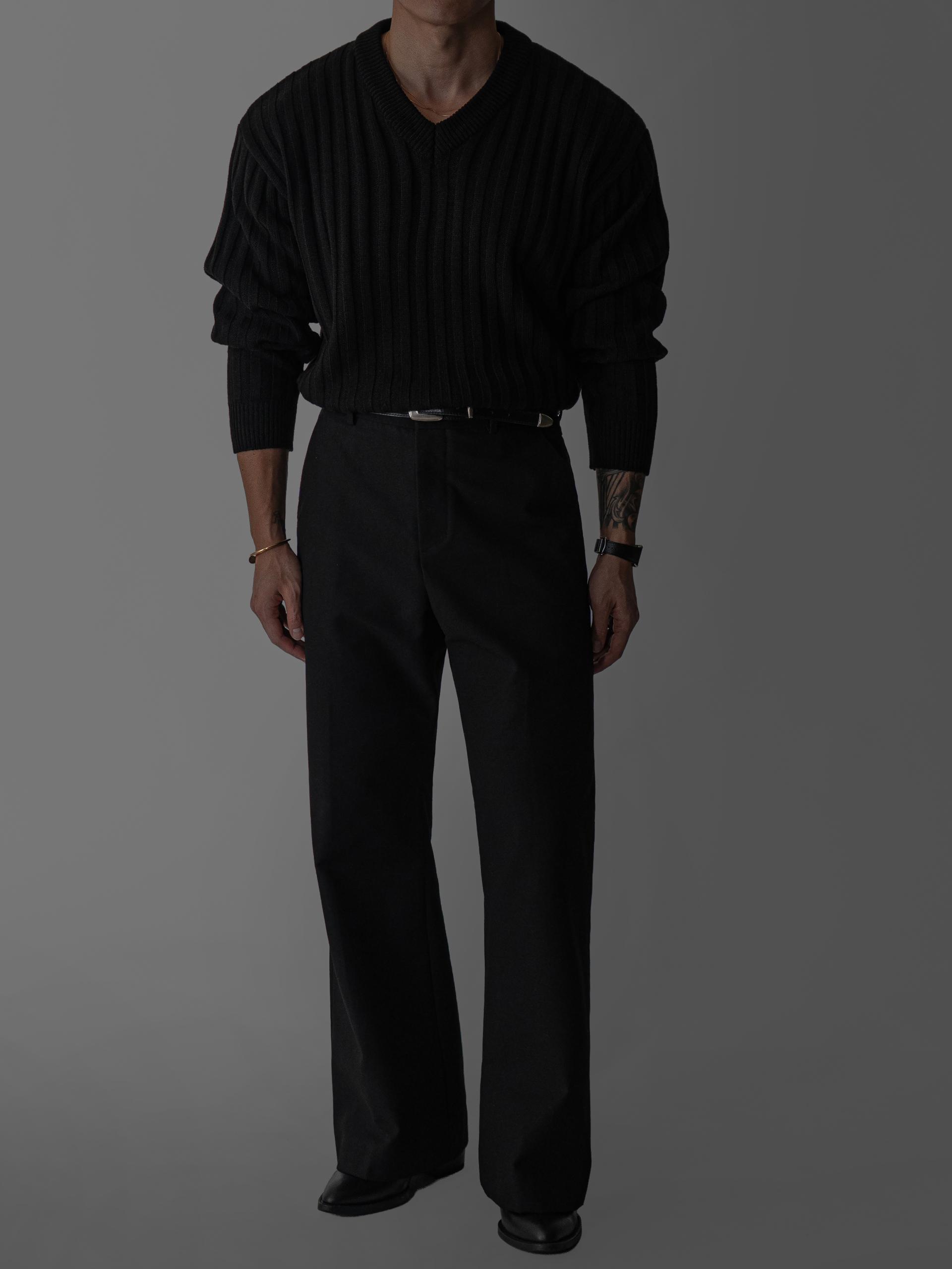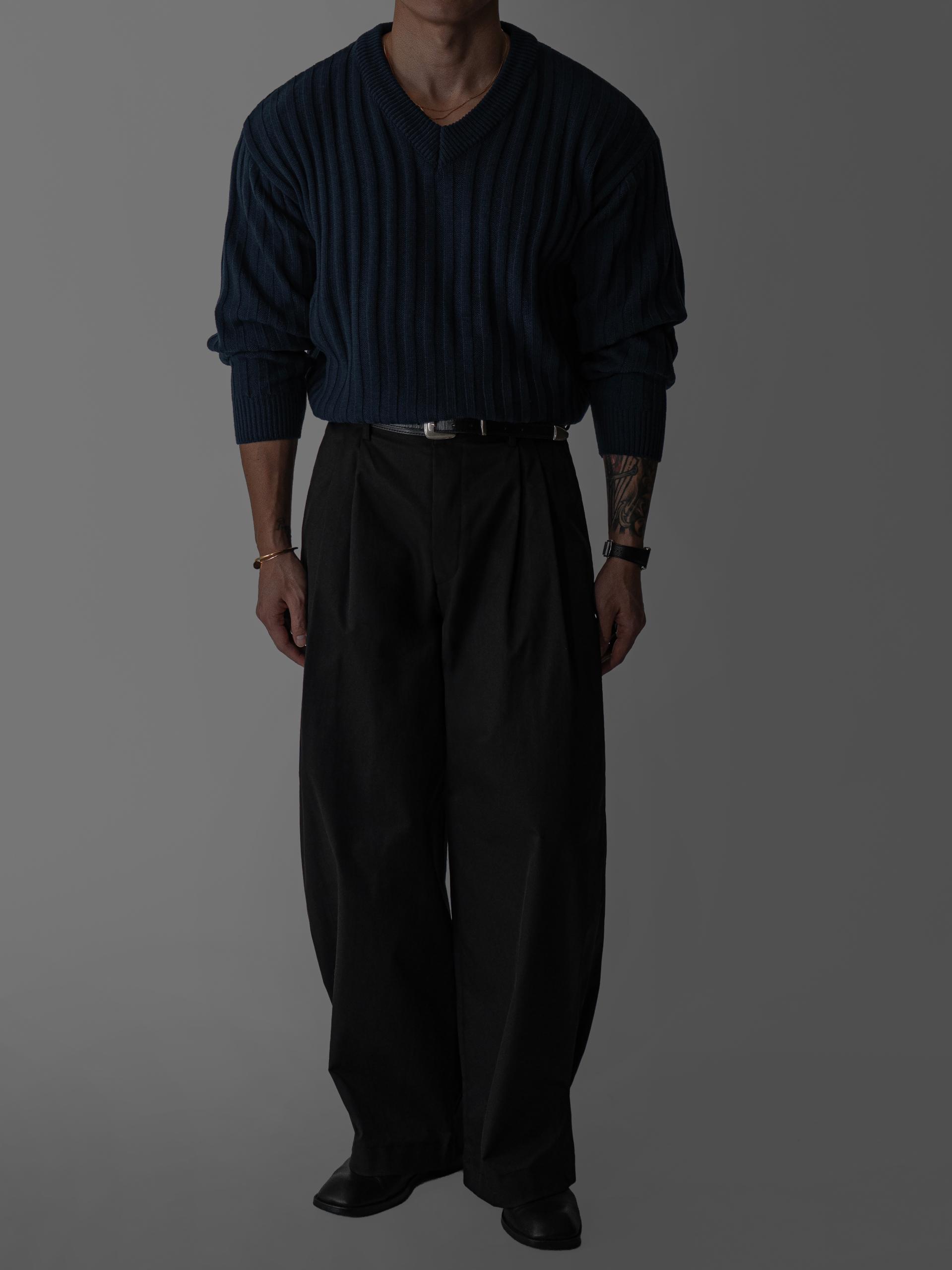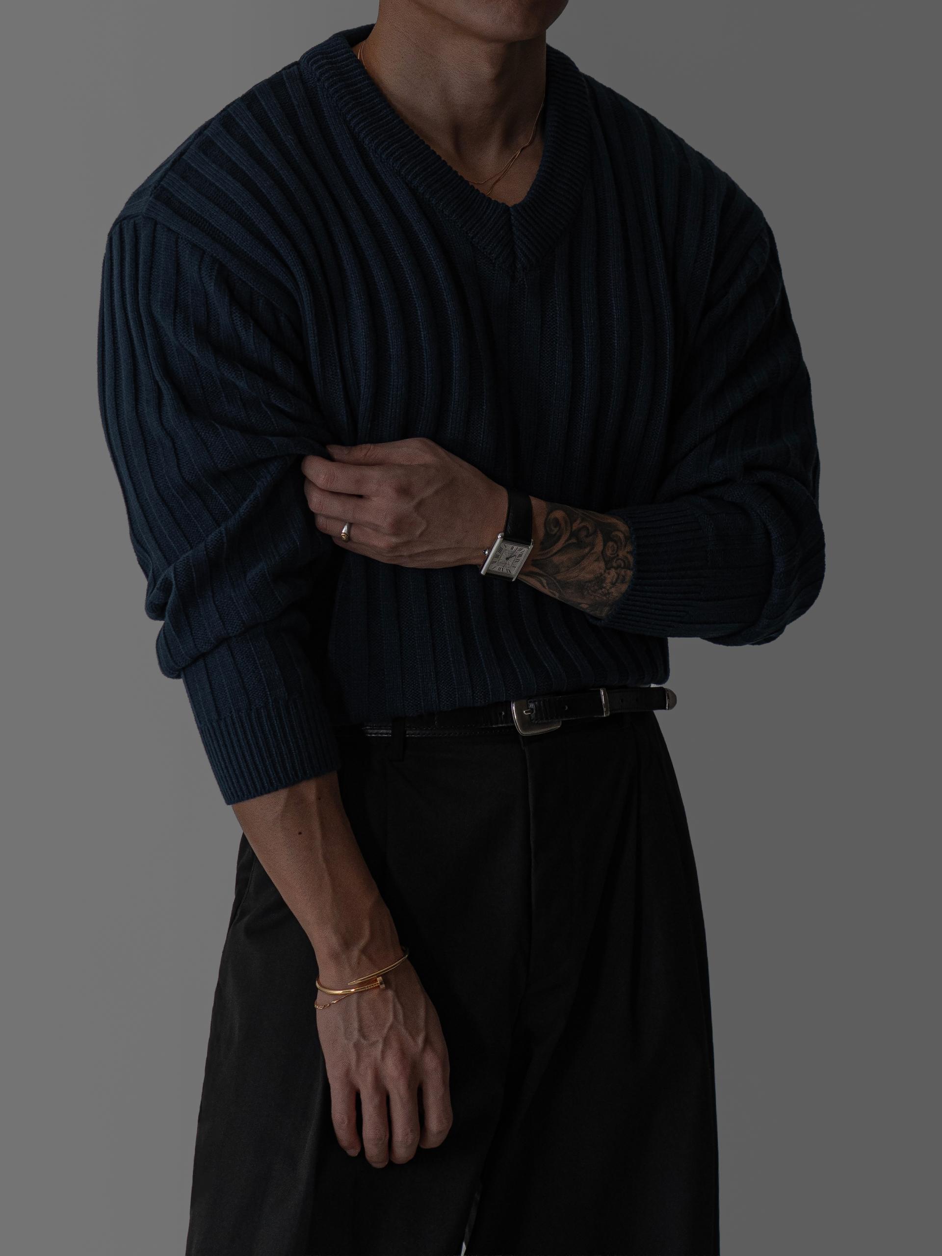 - 두꺼운 세로 골지 조직으로 상체 라인을 확실하게 부각시키는 브이넥 니트