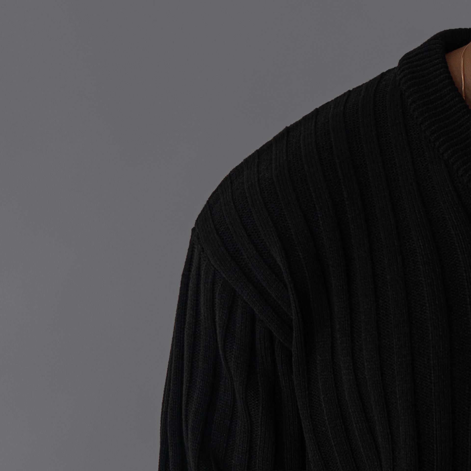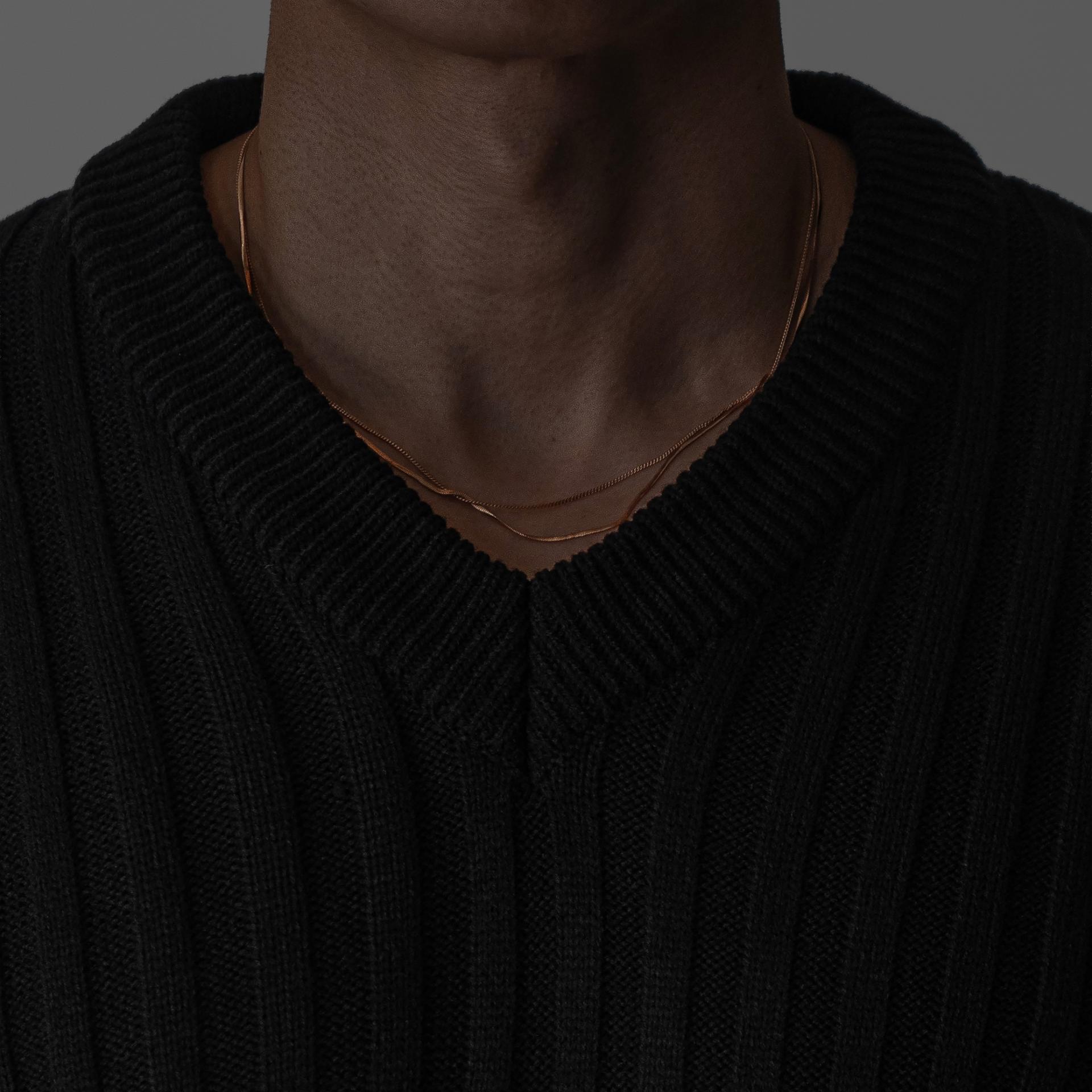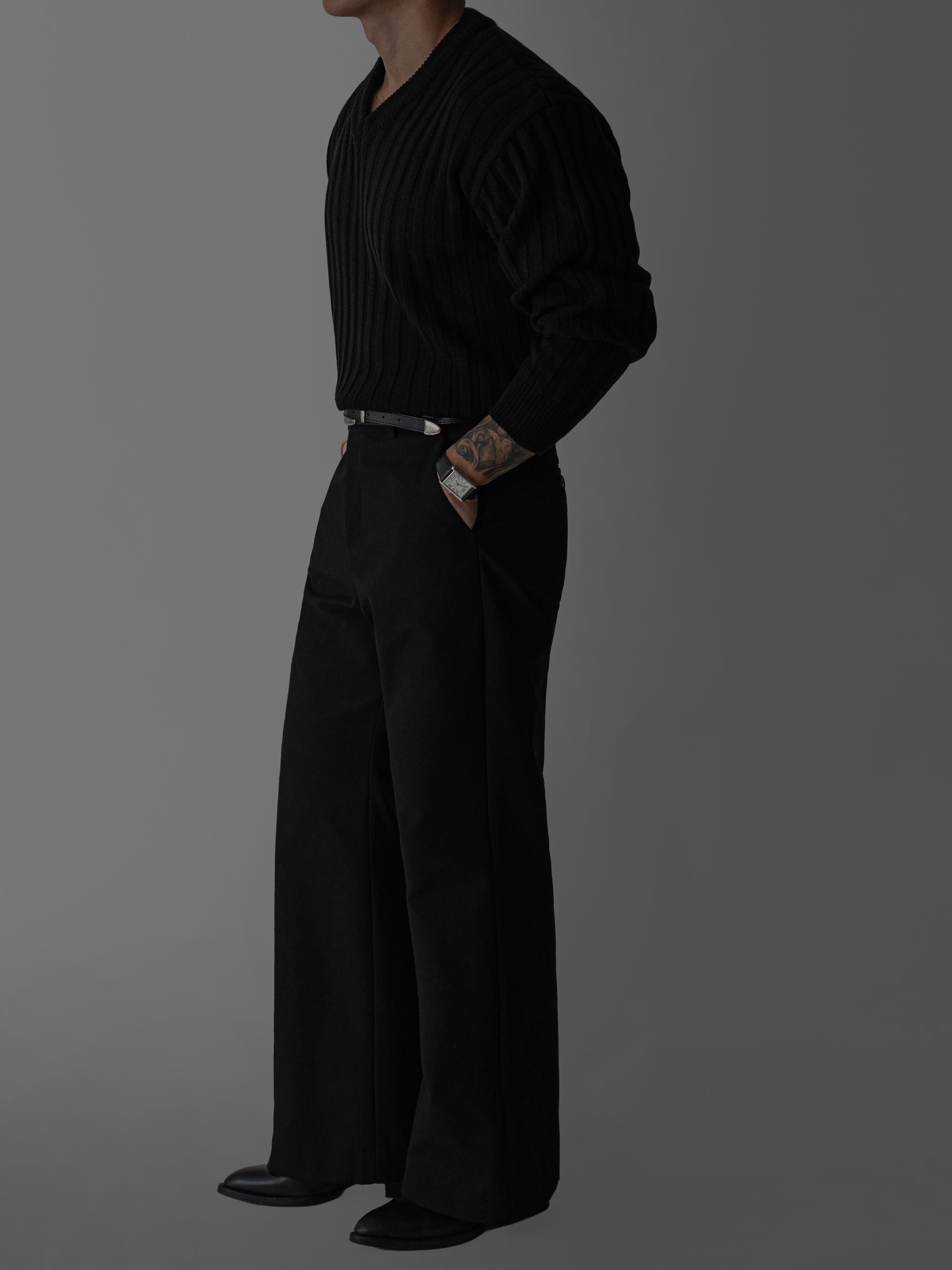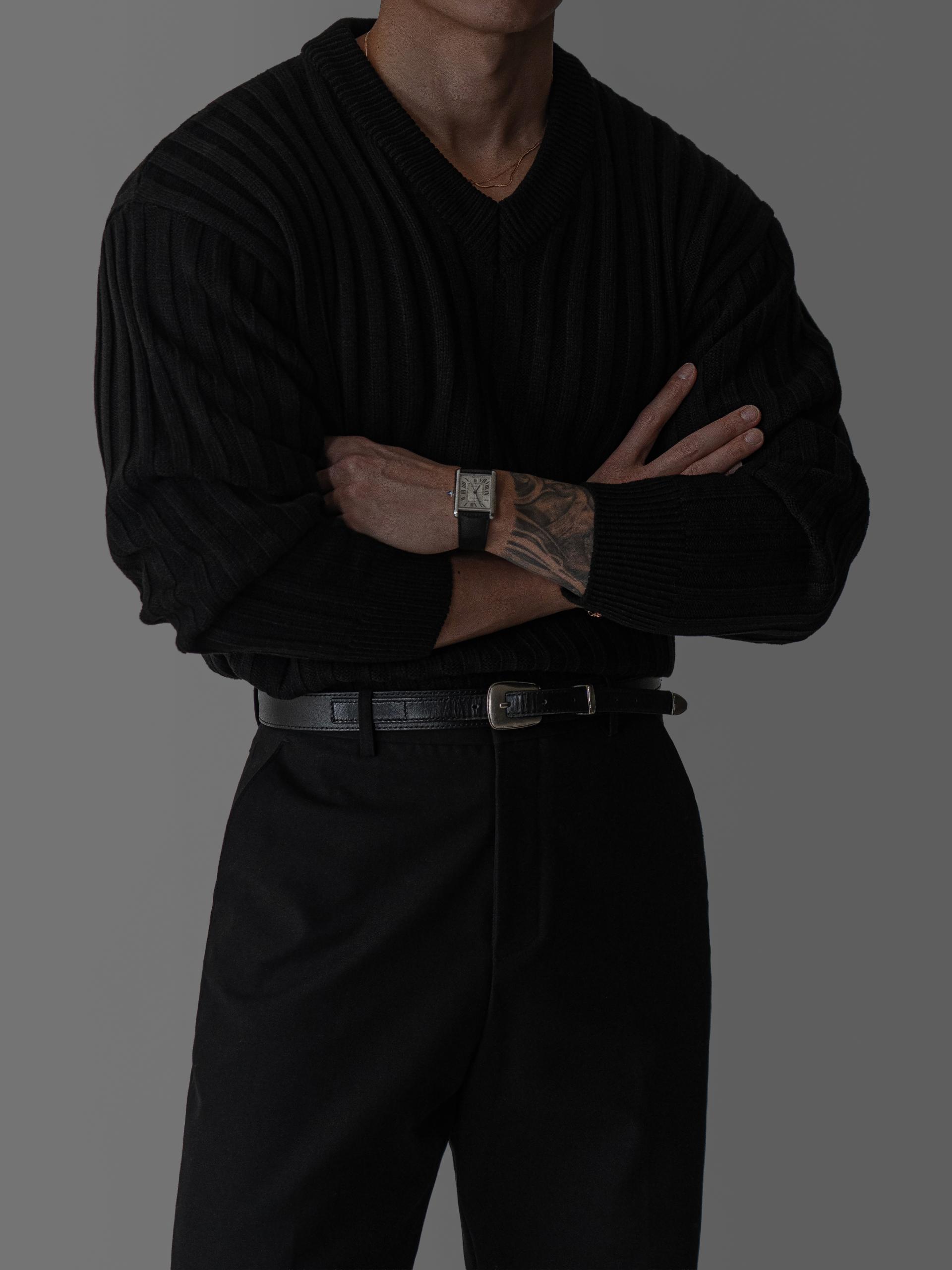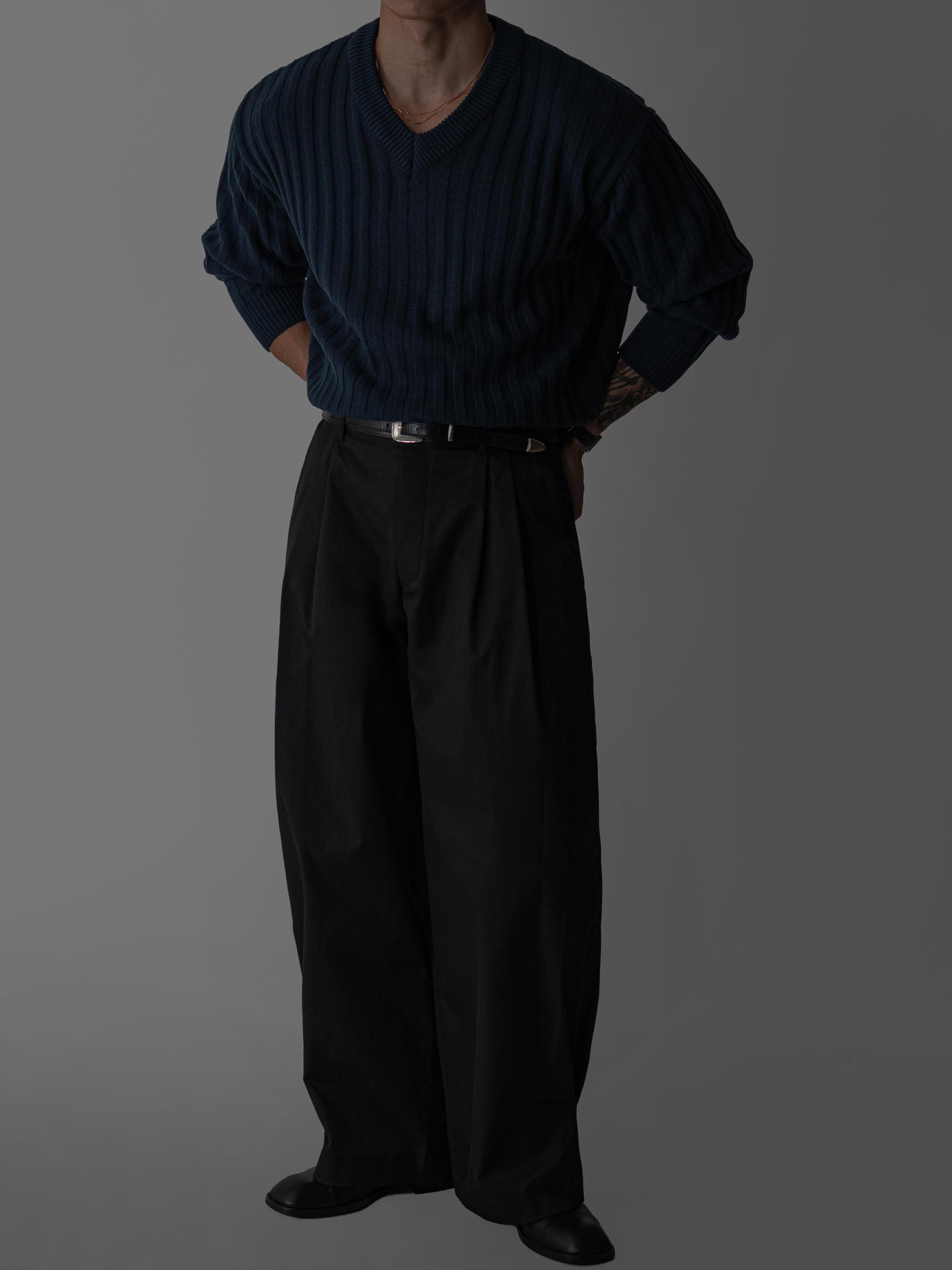- 두꺼운 세로 골지 조직으로 상체 라인을 확실하게 부각시키는 브이넥 니트