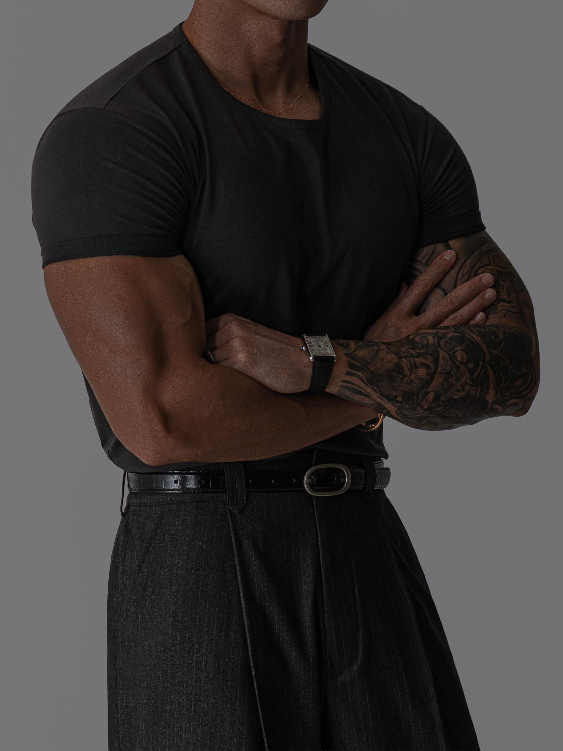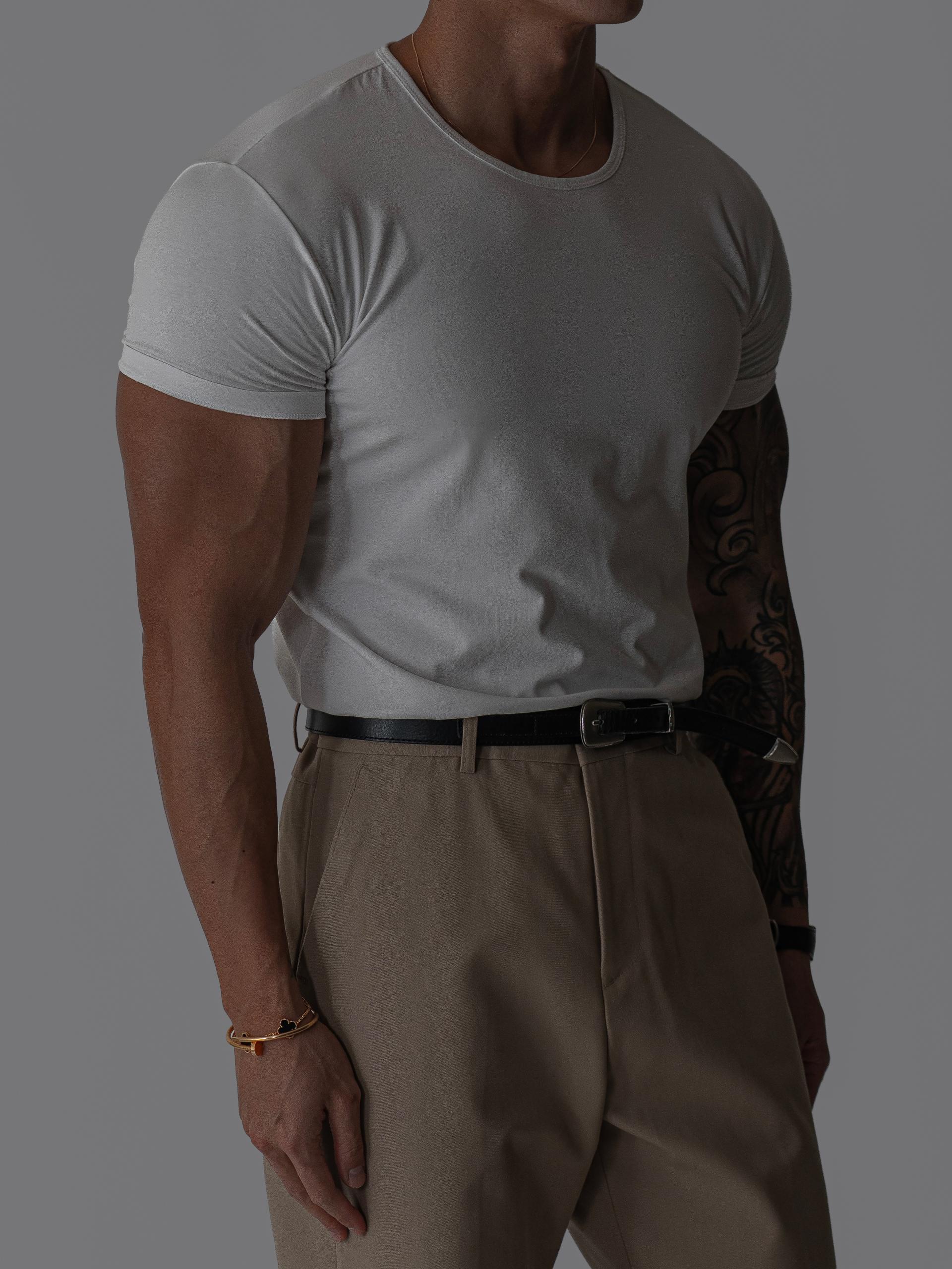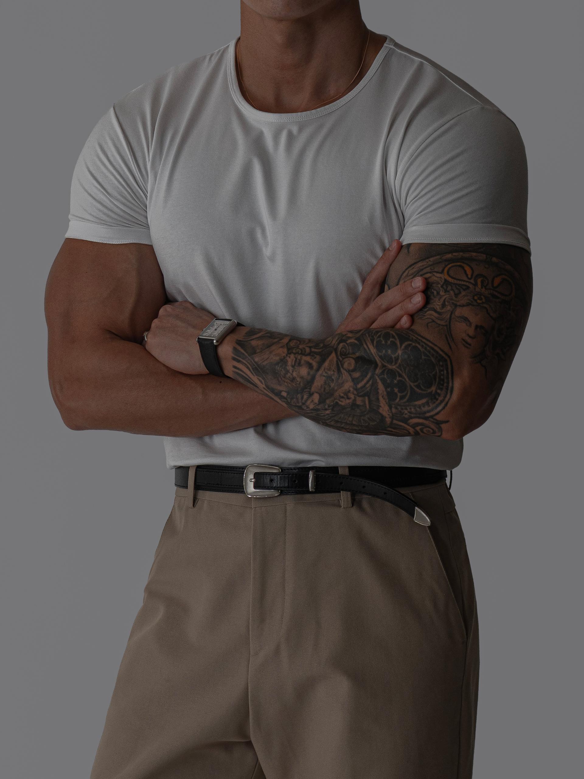 - 입체 패턴 설계로 자연스럽게 떨어지는 머슬핏 실루엣 연출