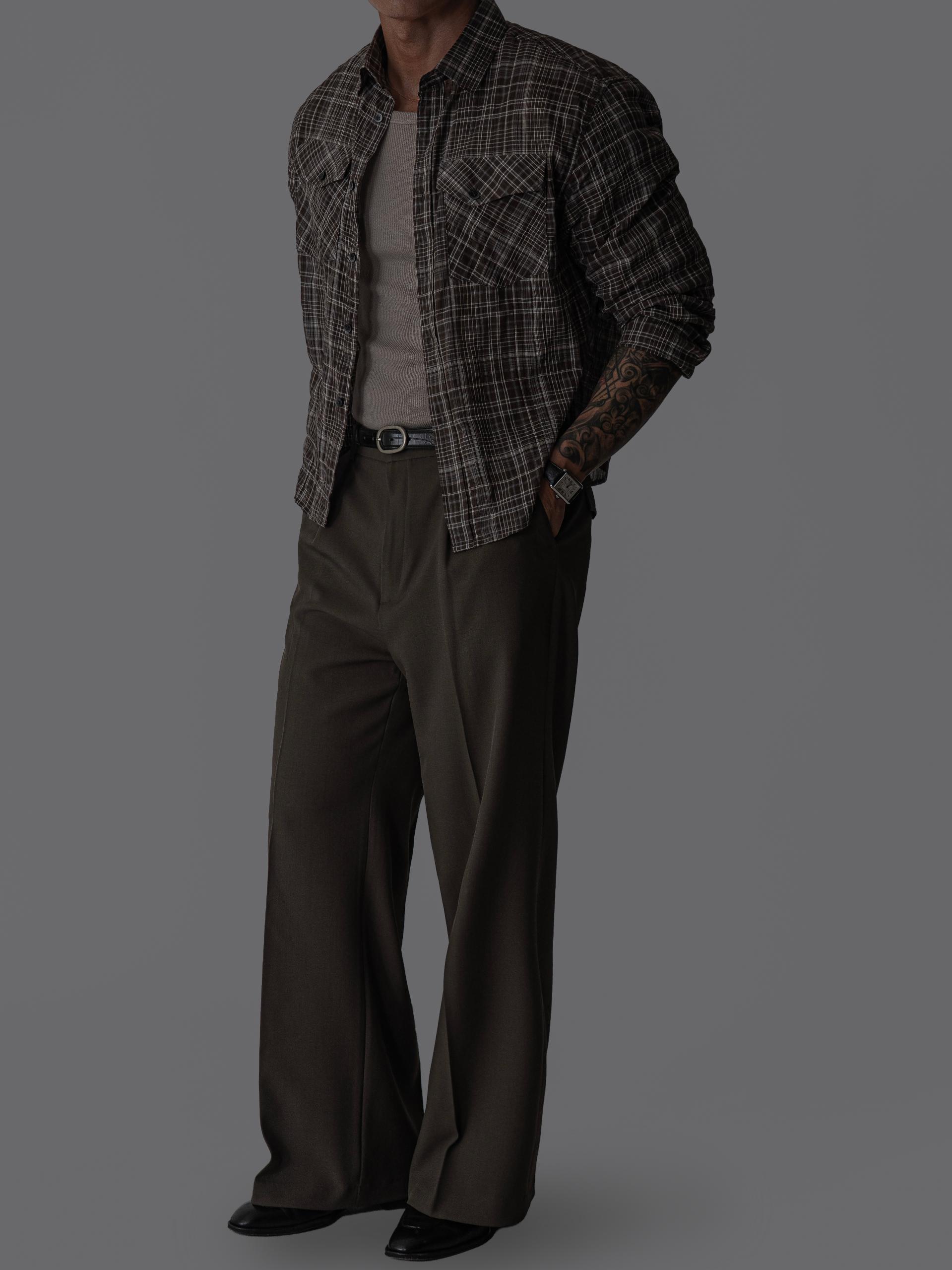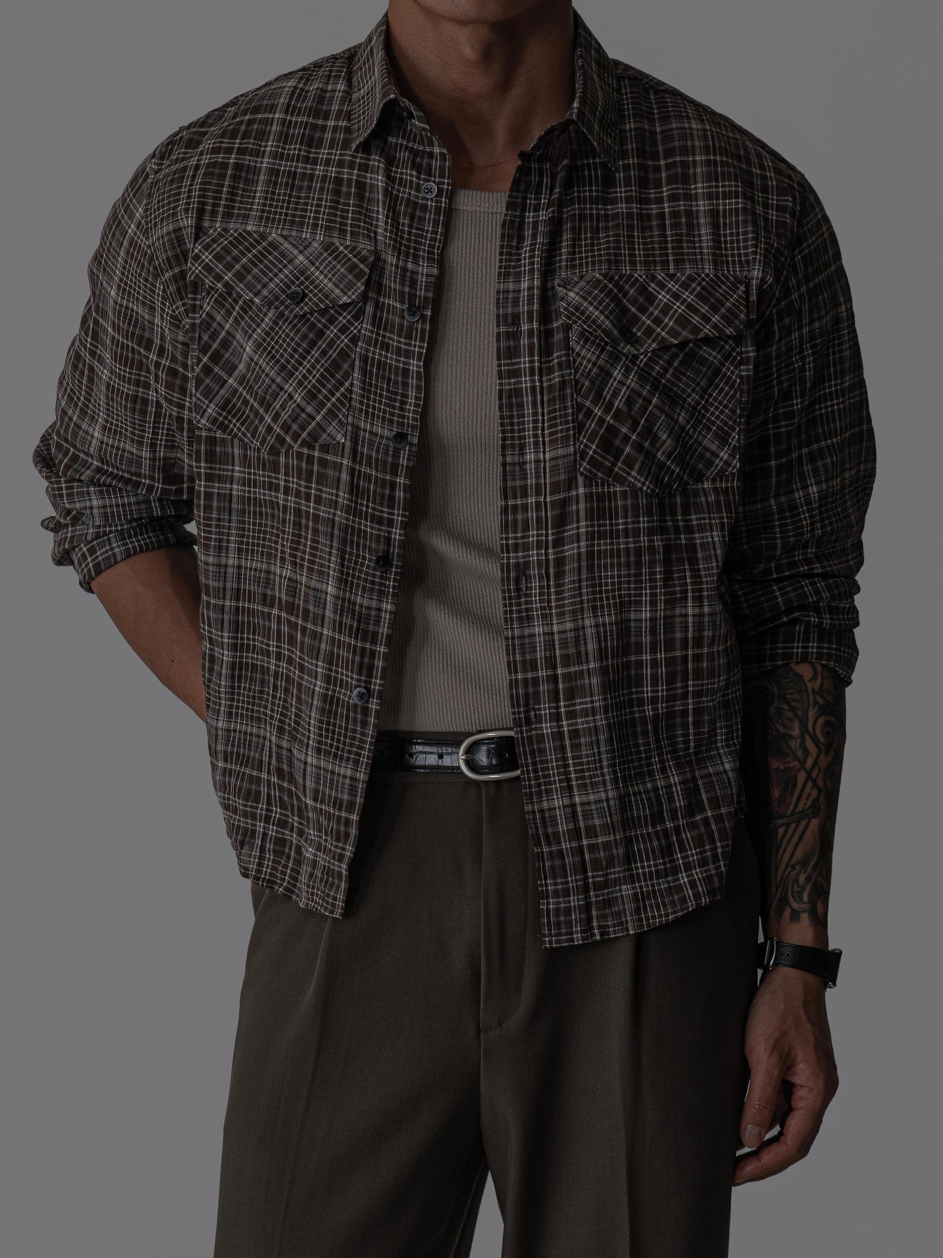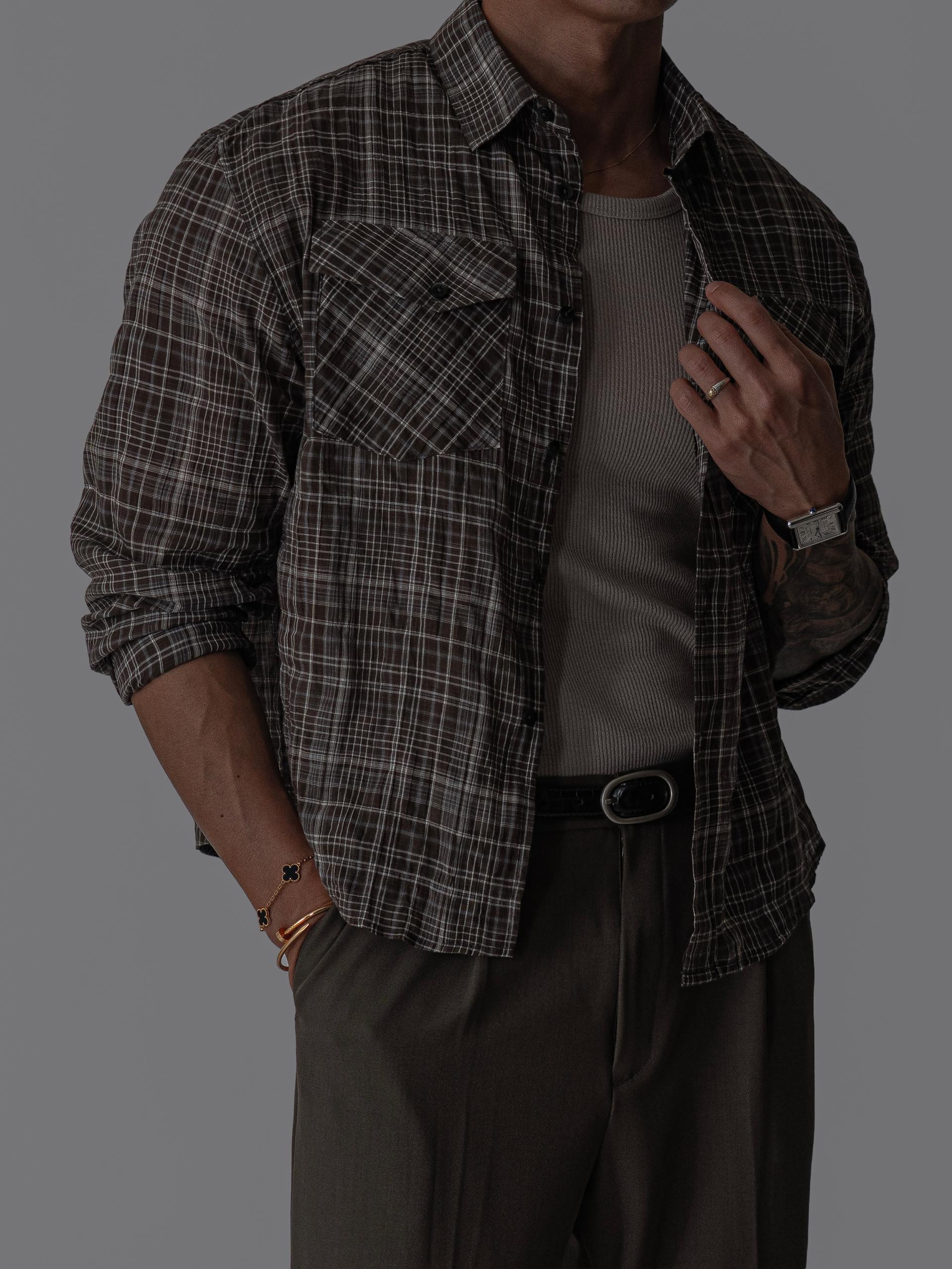 - 빈티지한 체크 패턴과 브라운 컬러감으로 남성적인 무드 연출