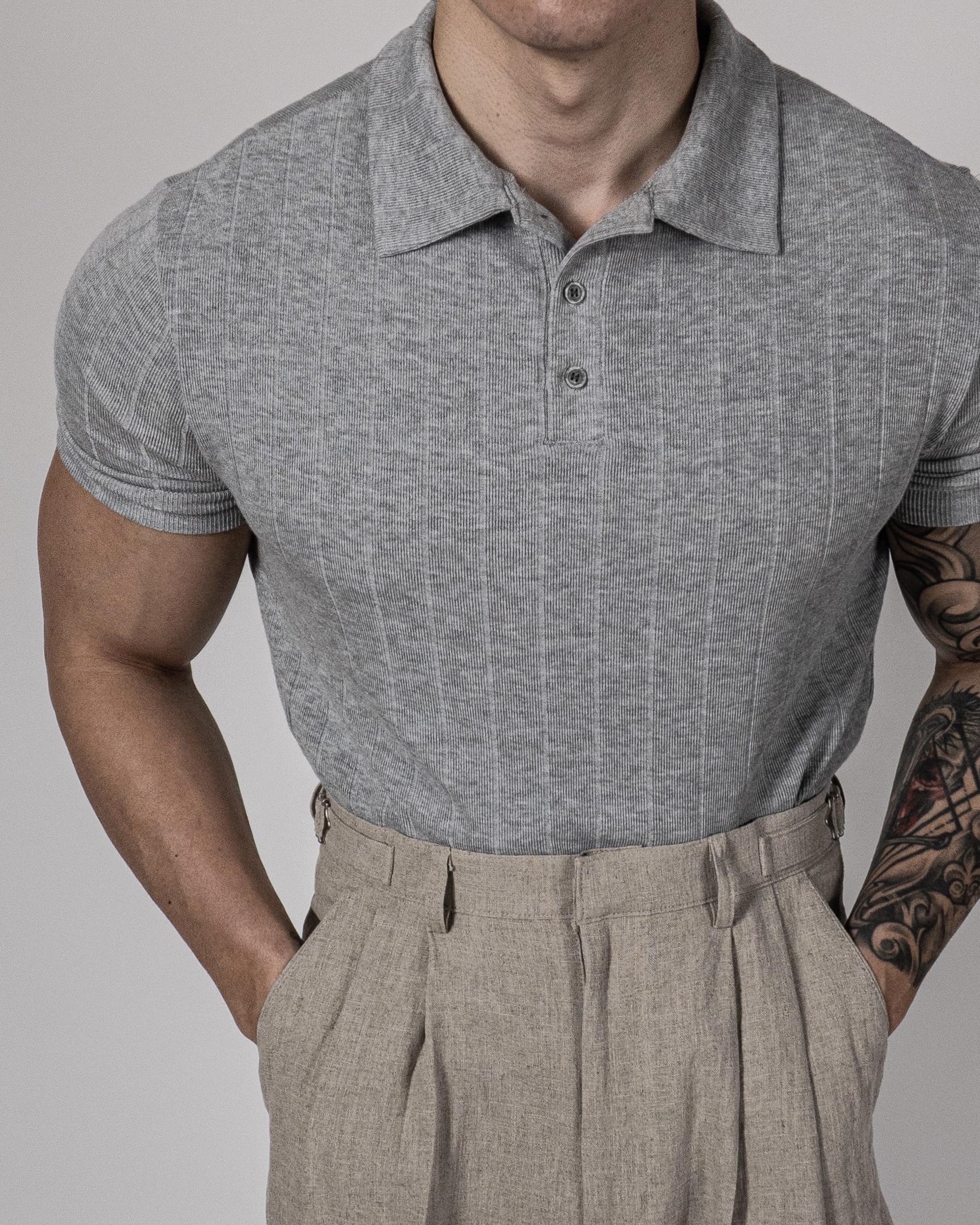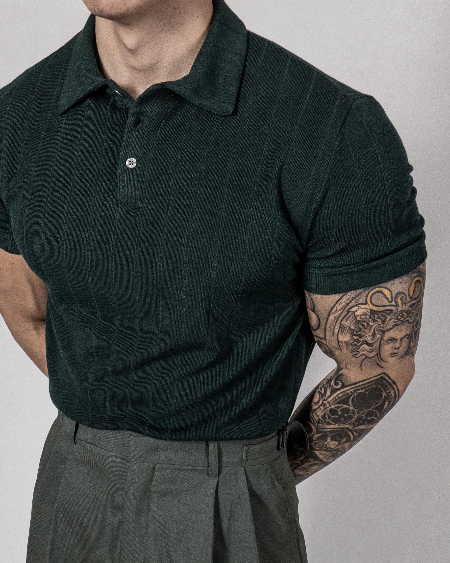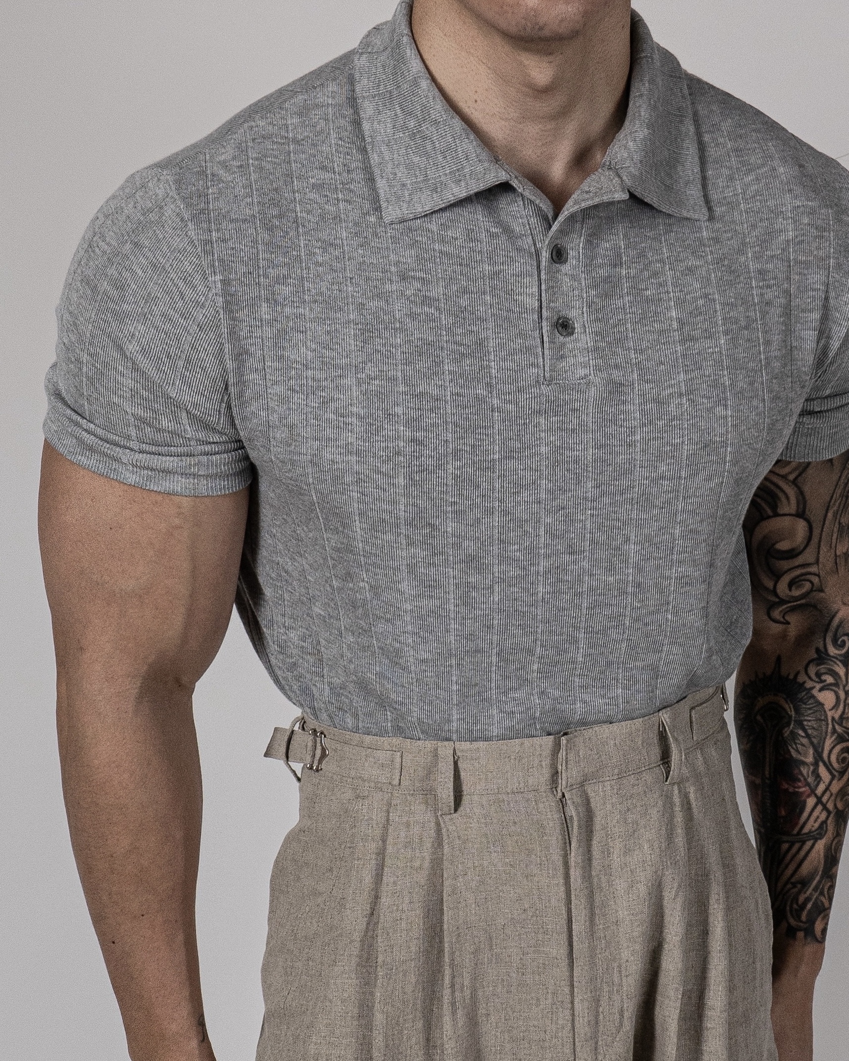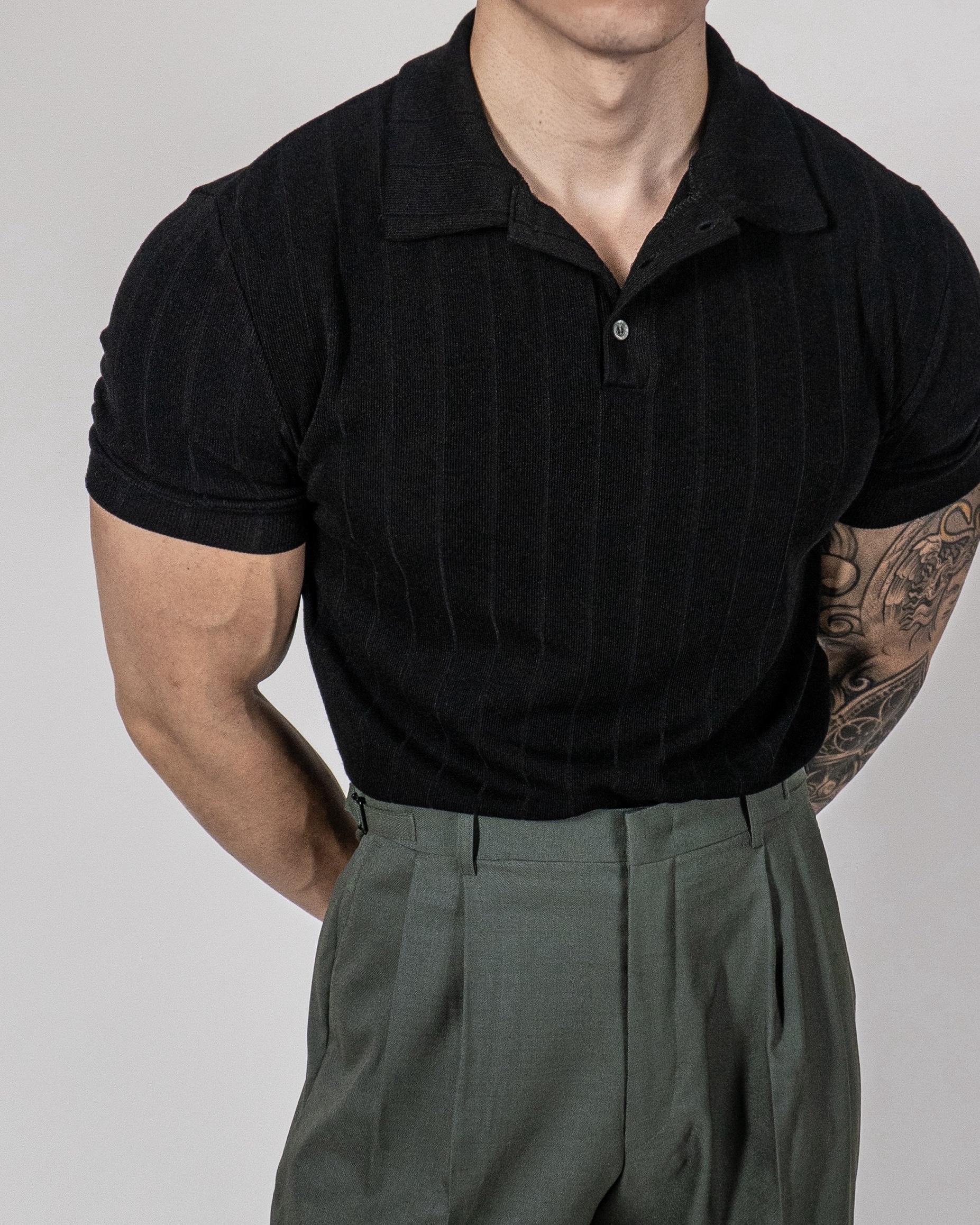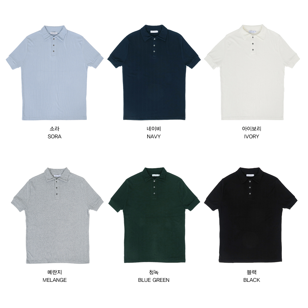 - 탄탄한 팔 립 조직과 짧은 팔길이의 머슬핏 카라 티셔츠