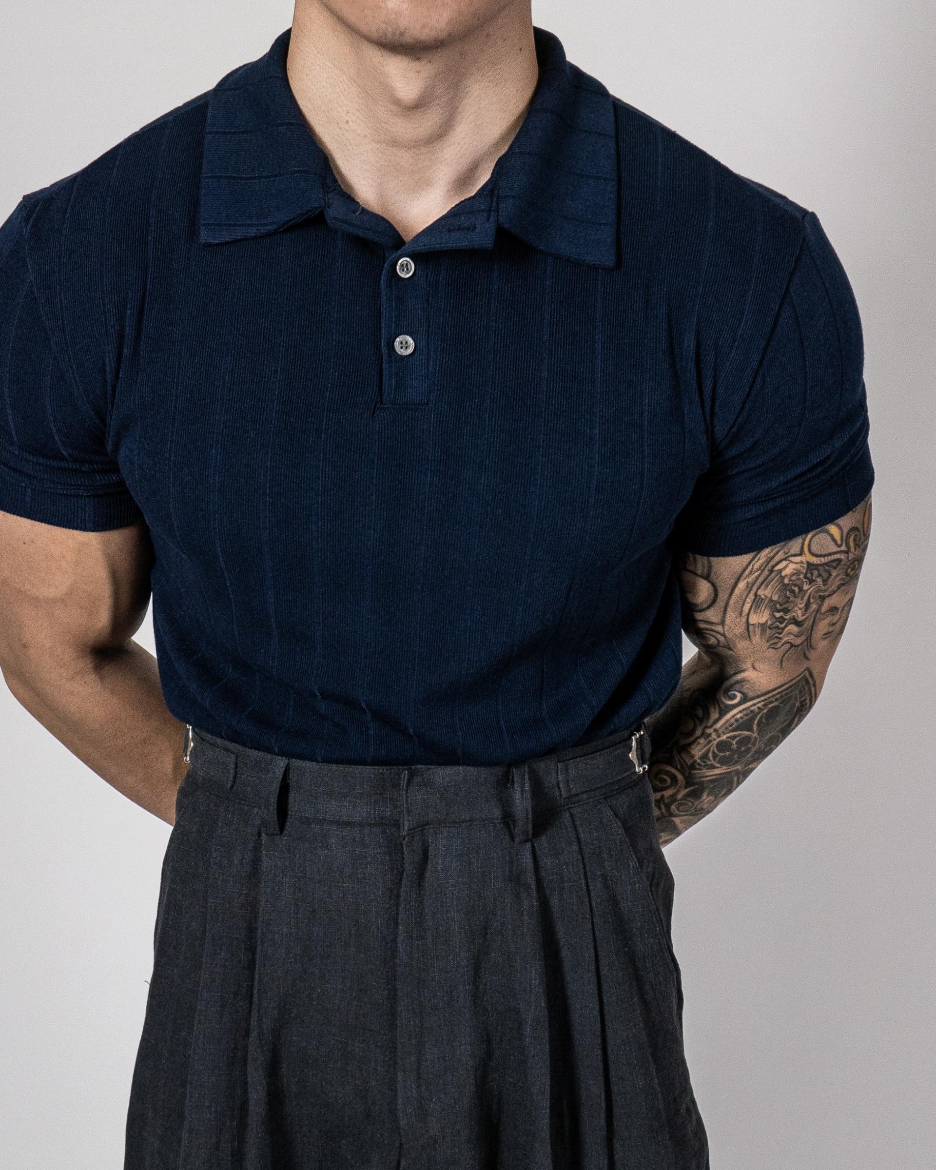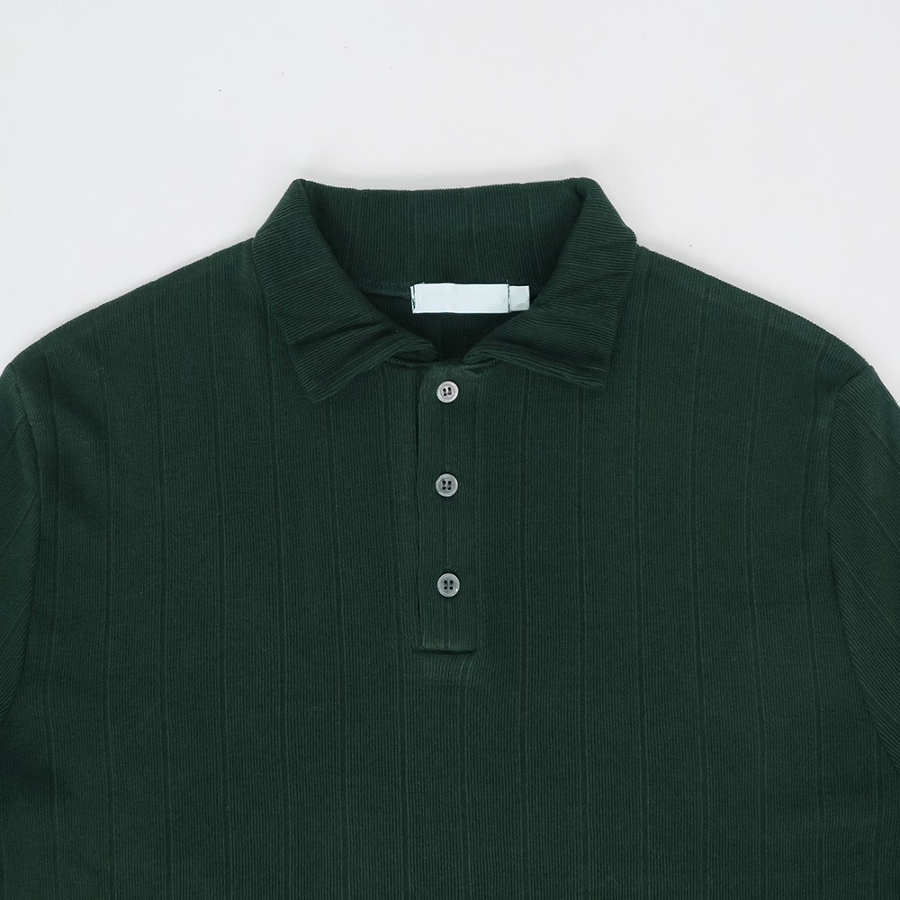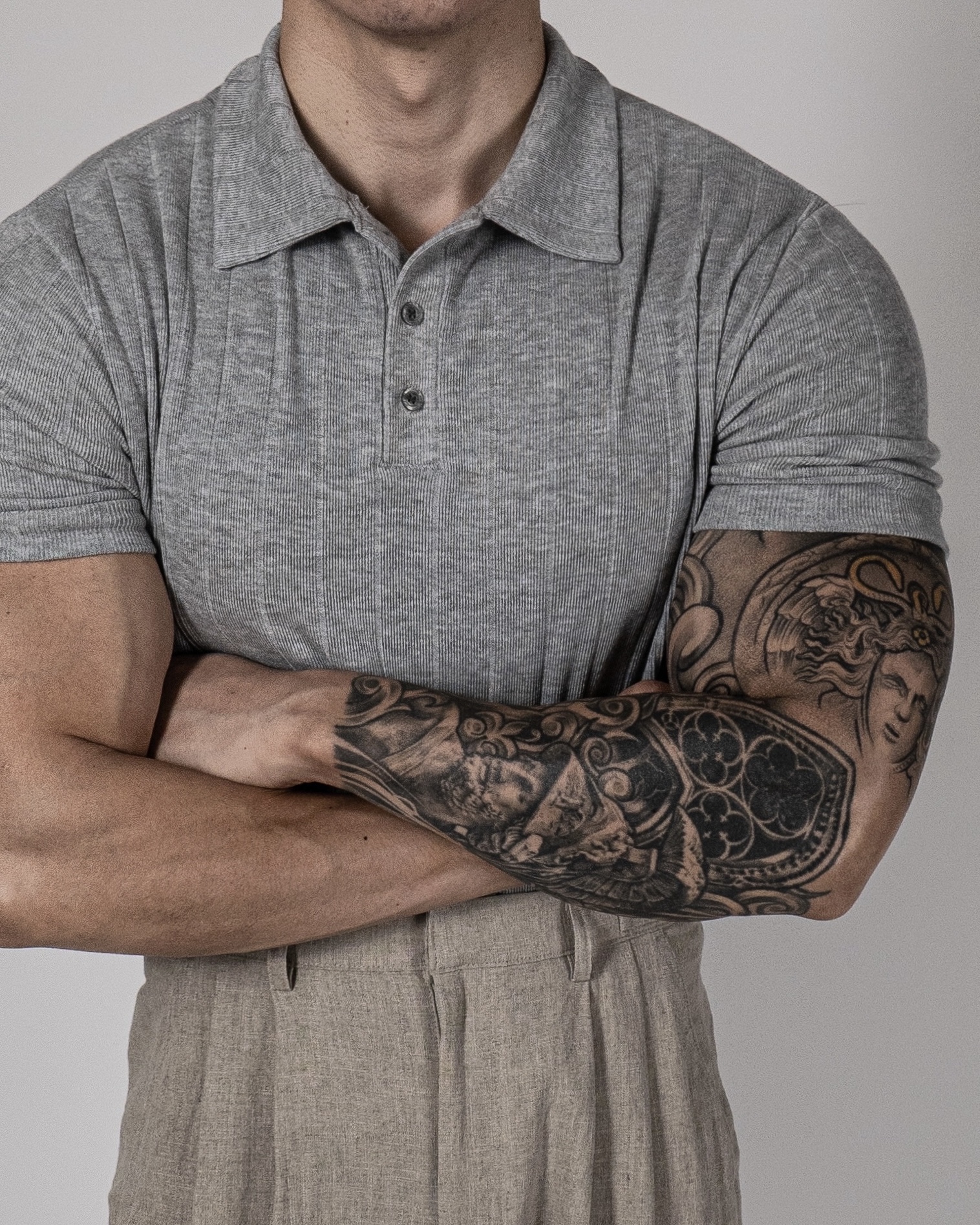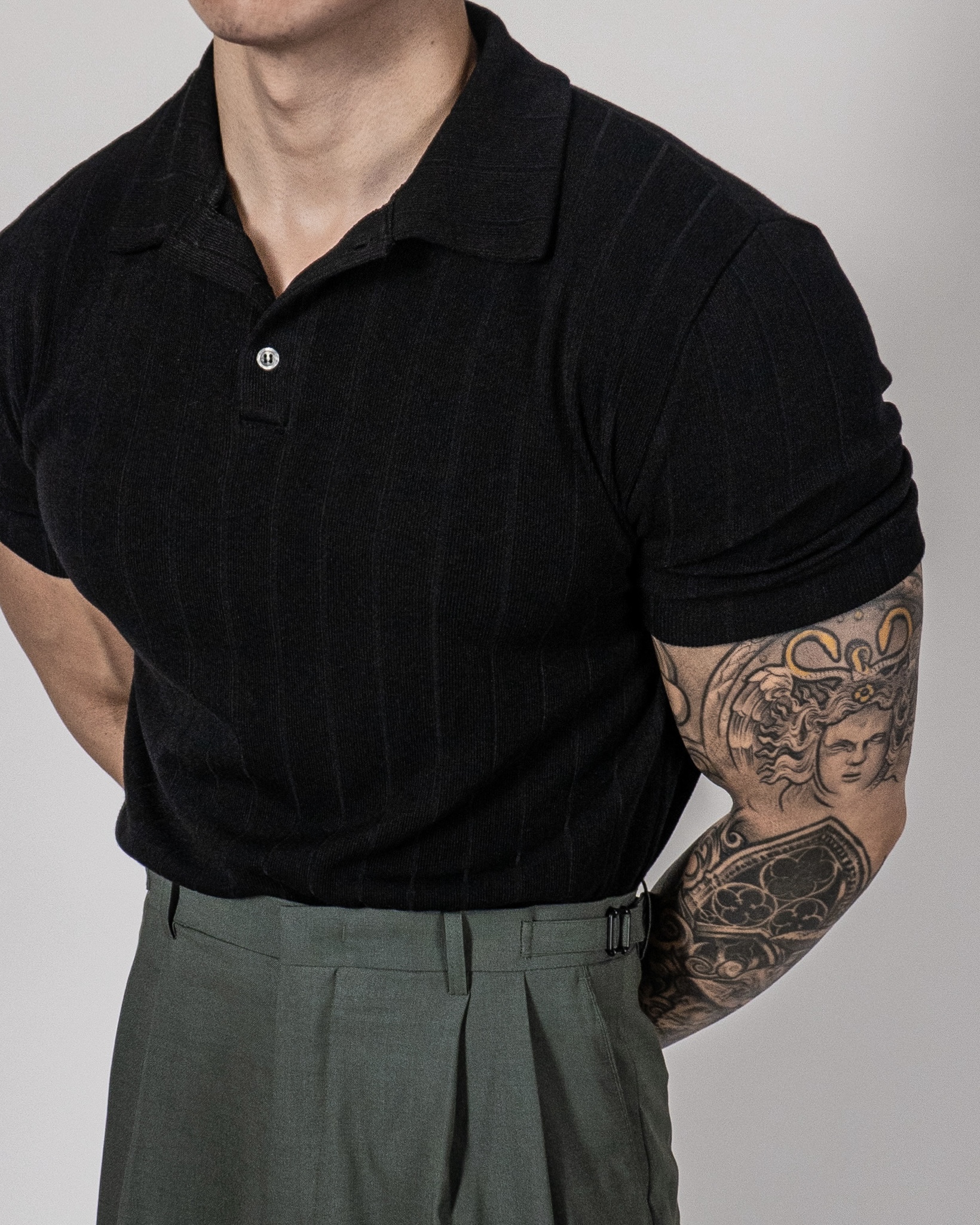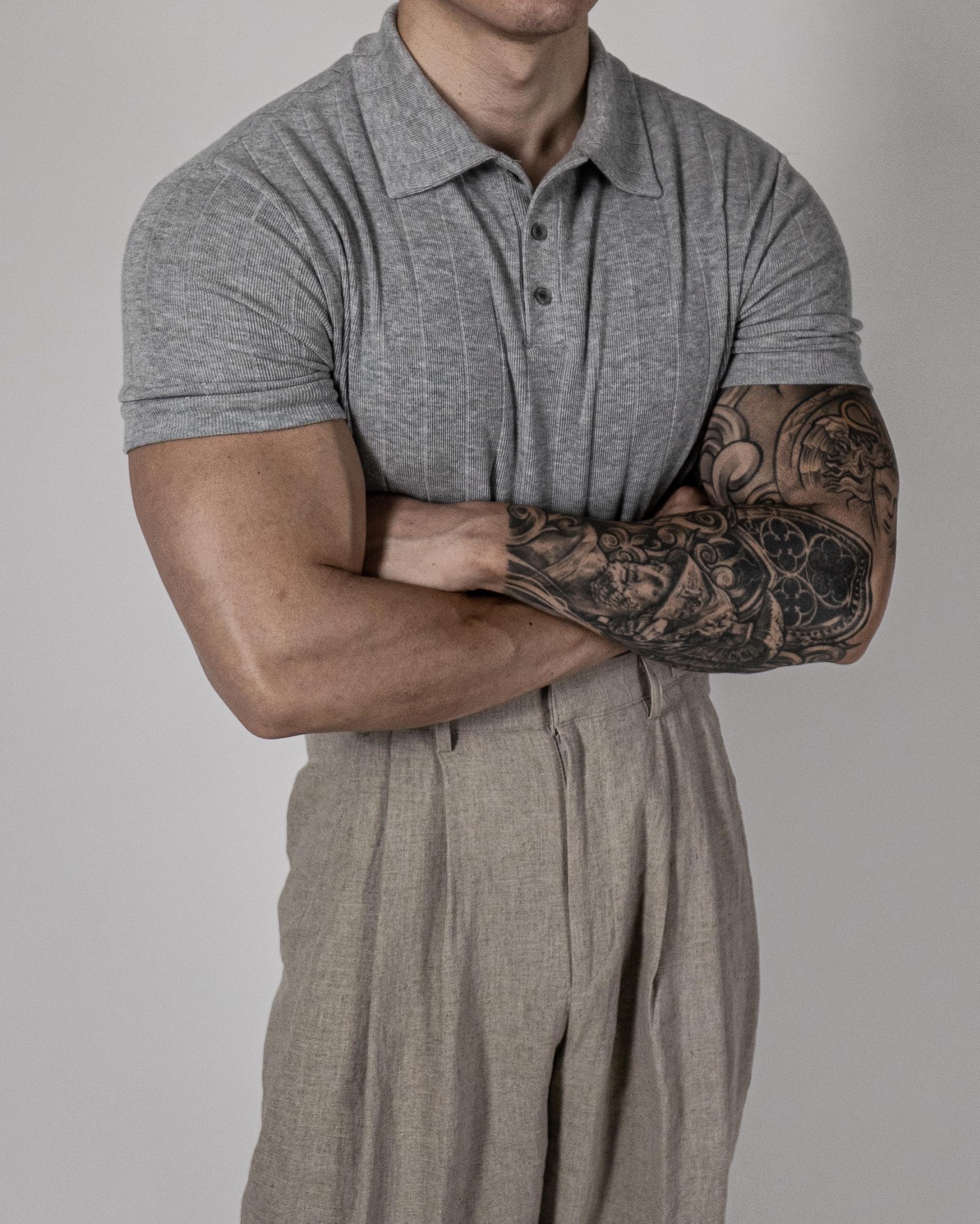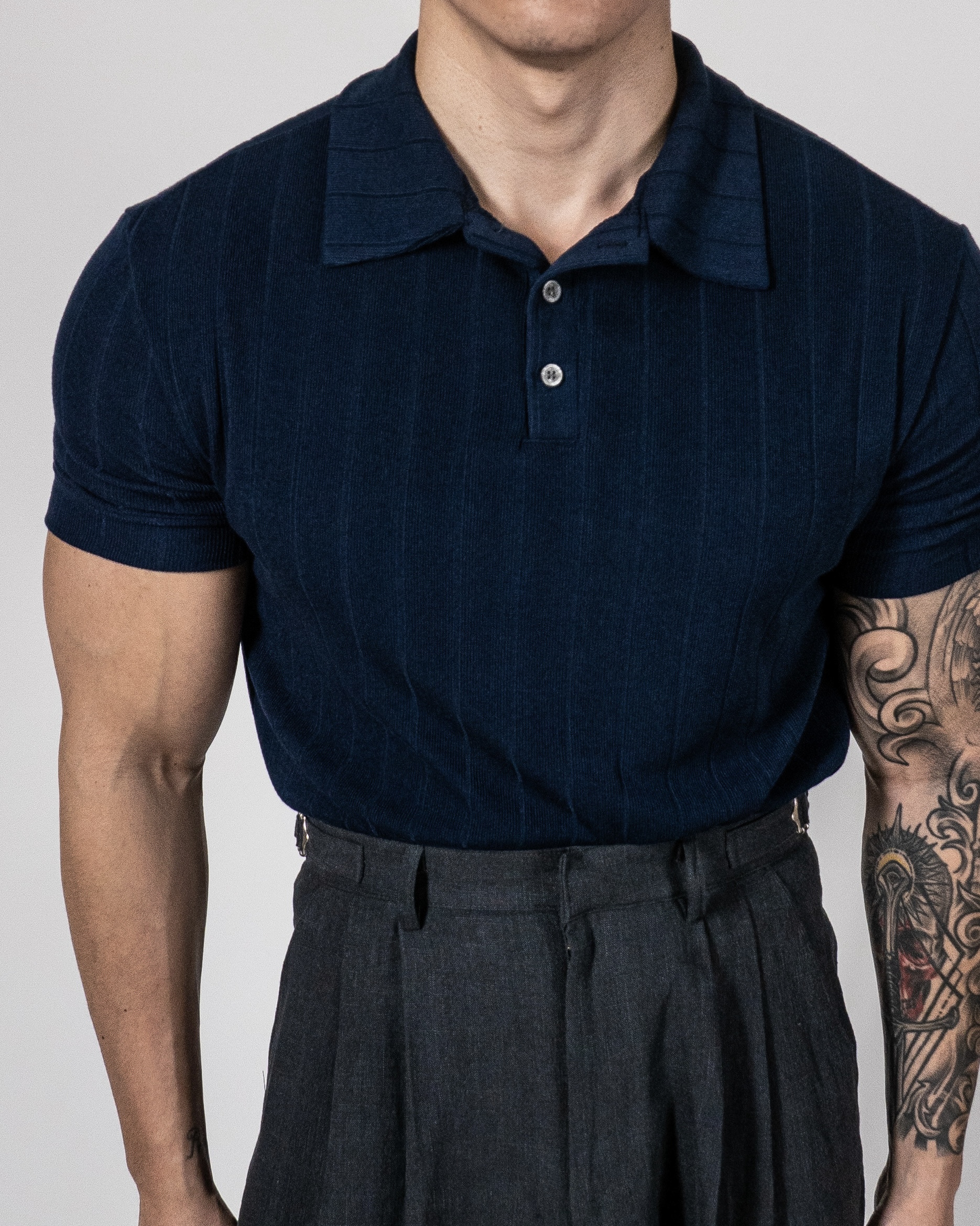 - 탄탄한 팔 립 조직과 짧은 팔길이의 머슬핏 카라 티셔츠