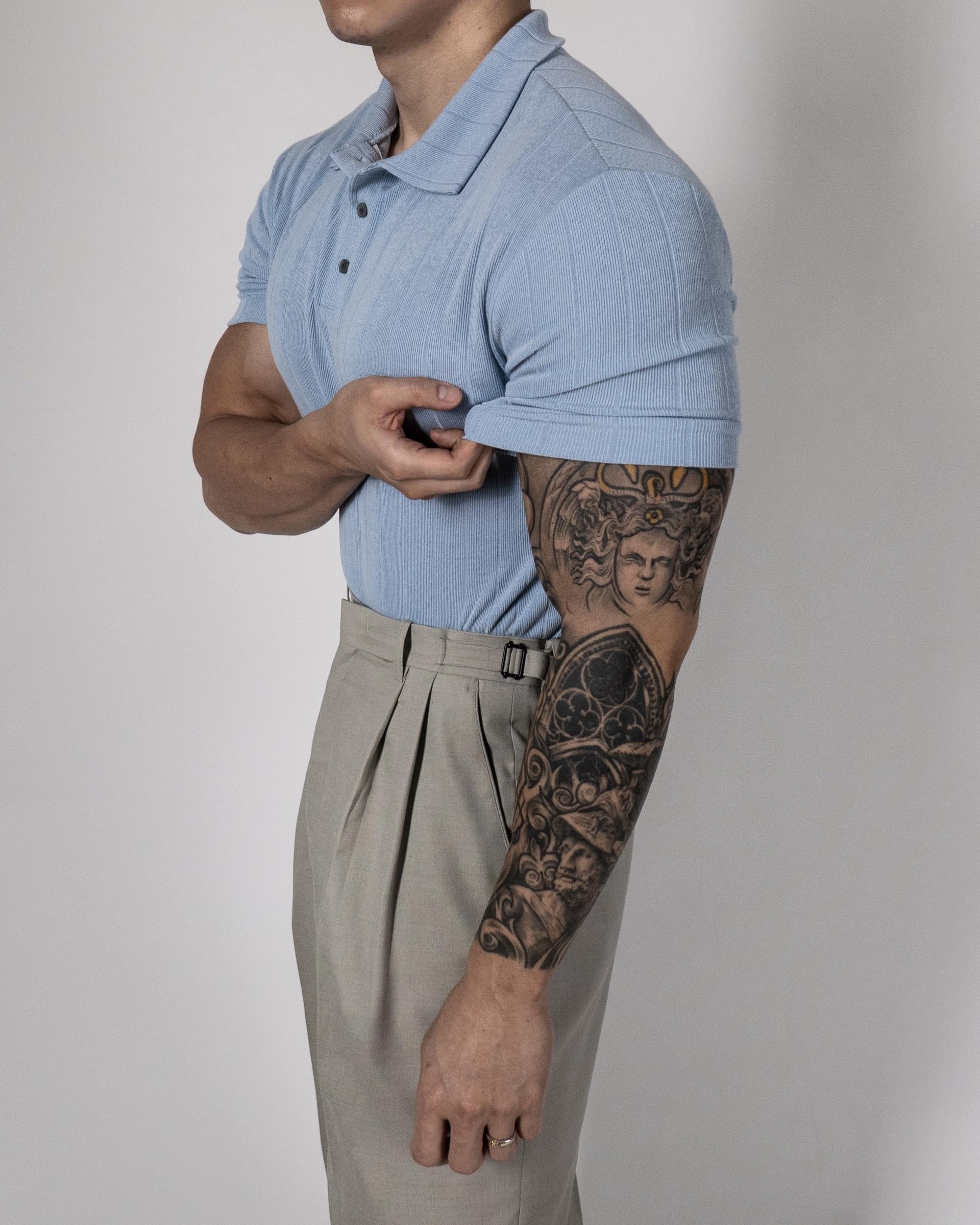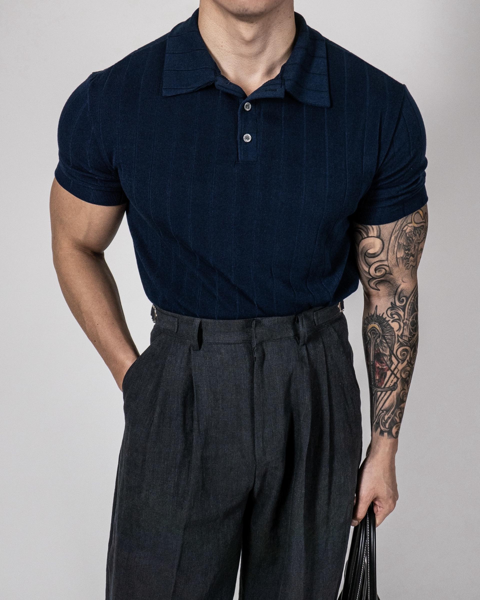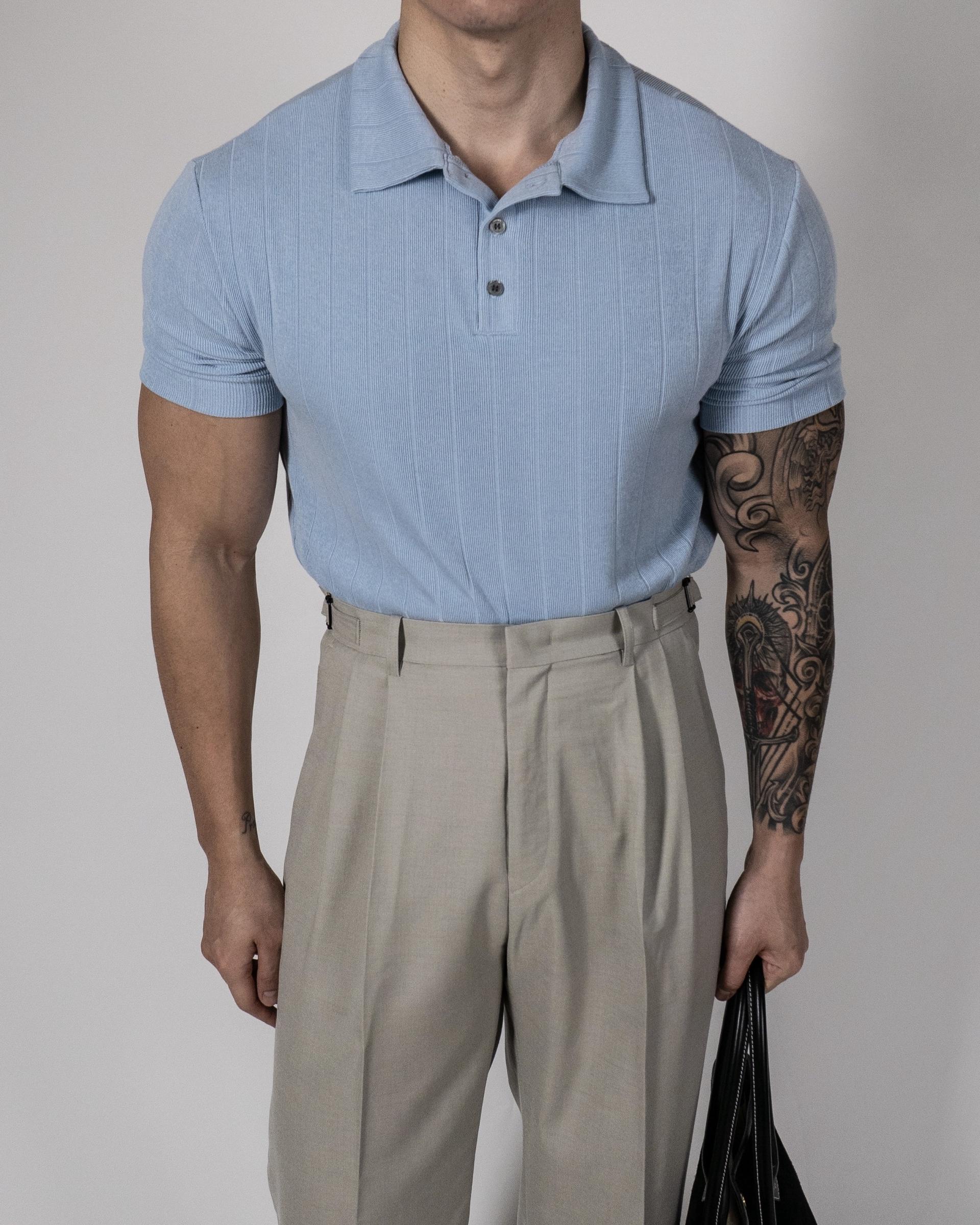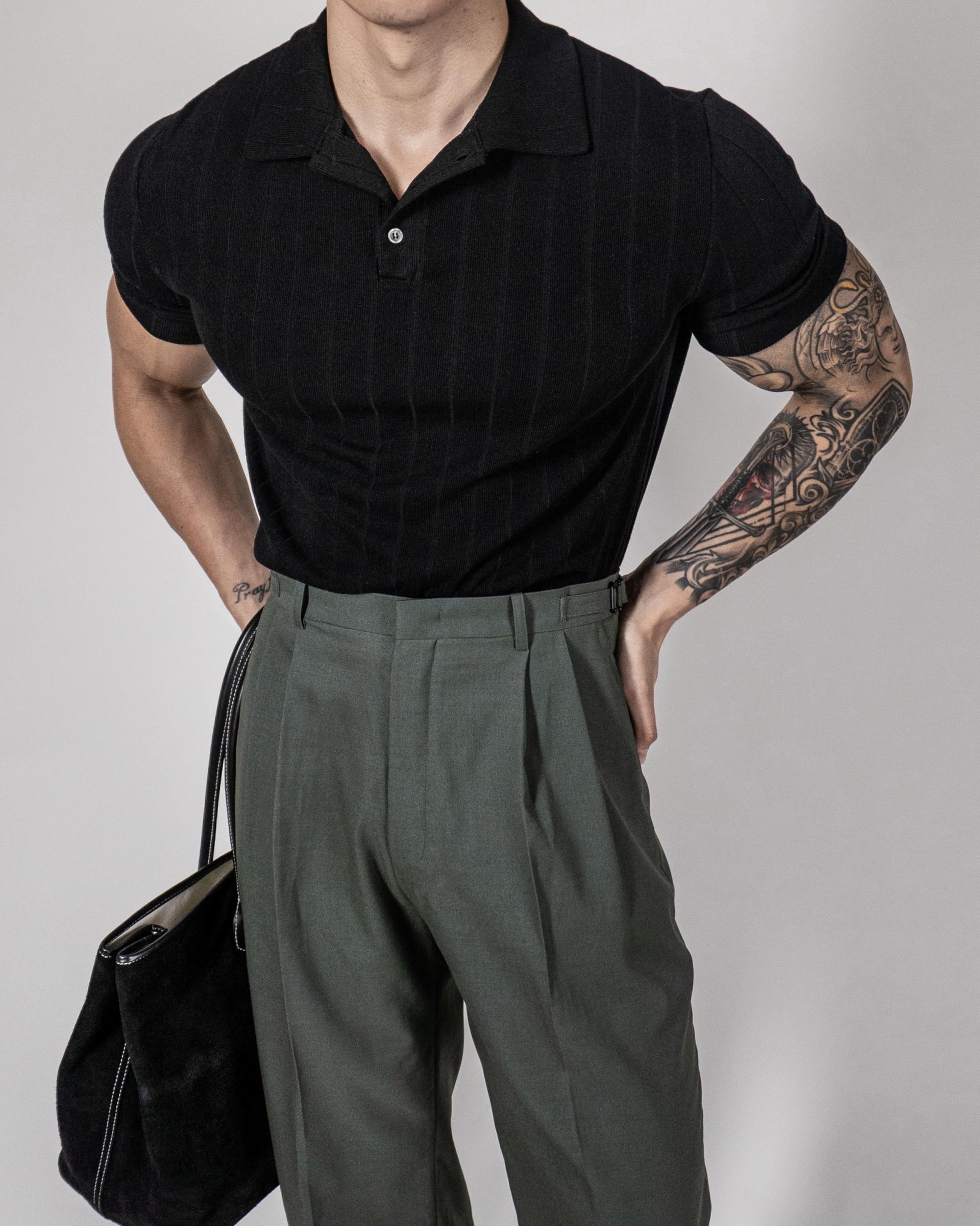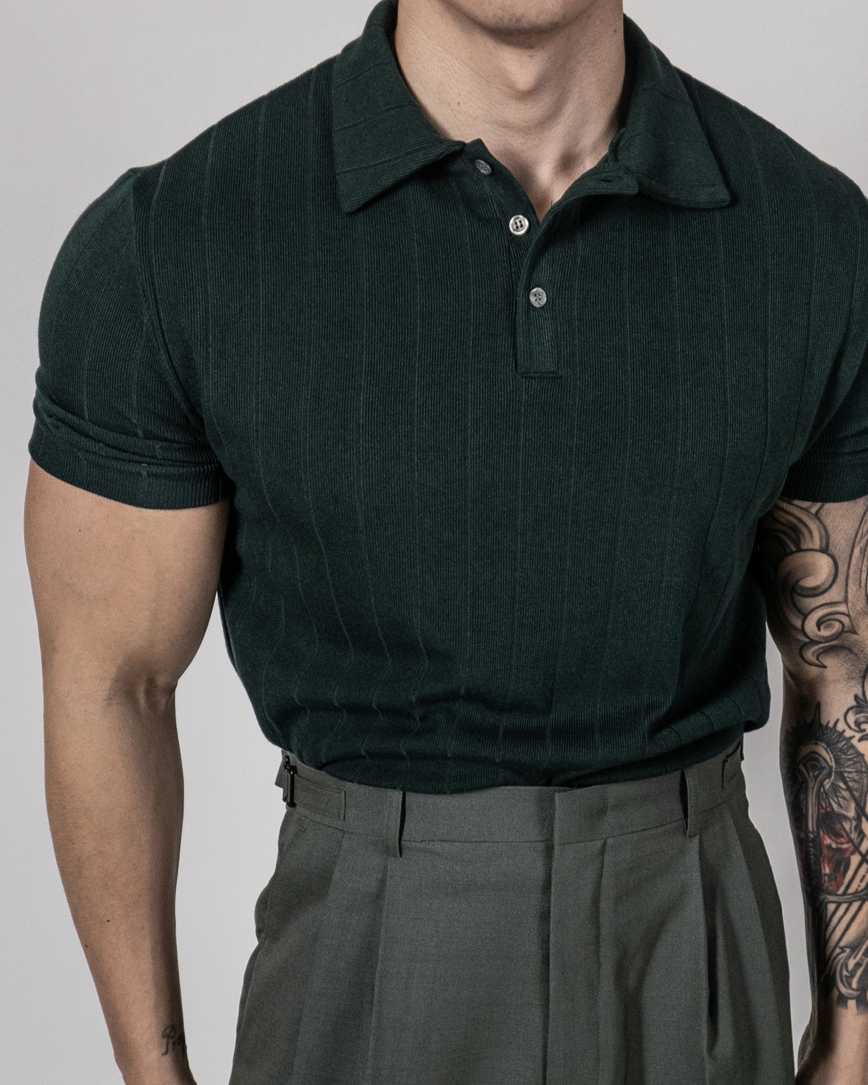- 탄탄한 팔 립 조직과 짧은 팔길이의 머슬핏 카라 티셔츠