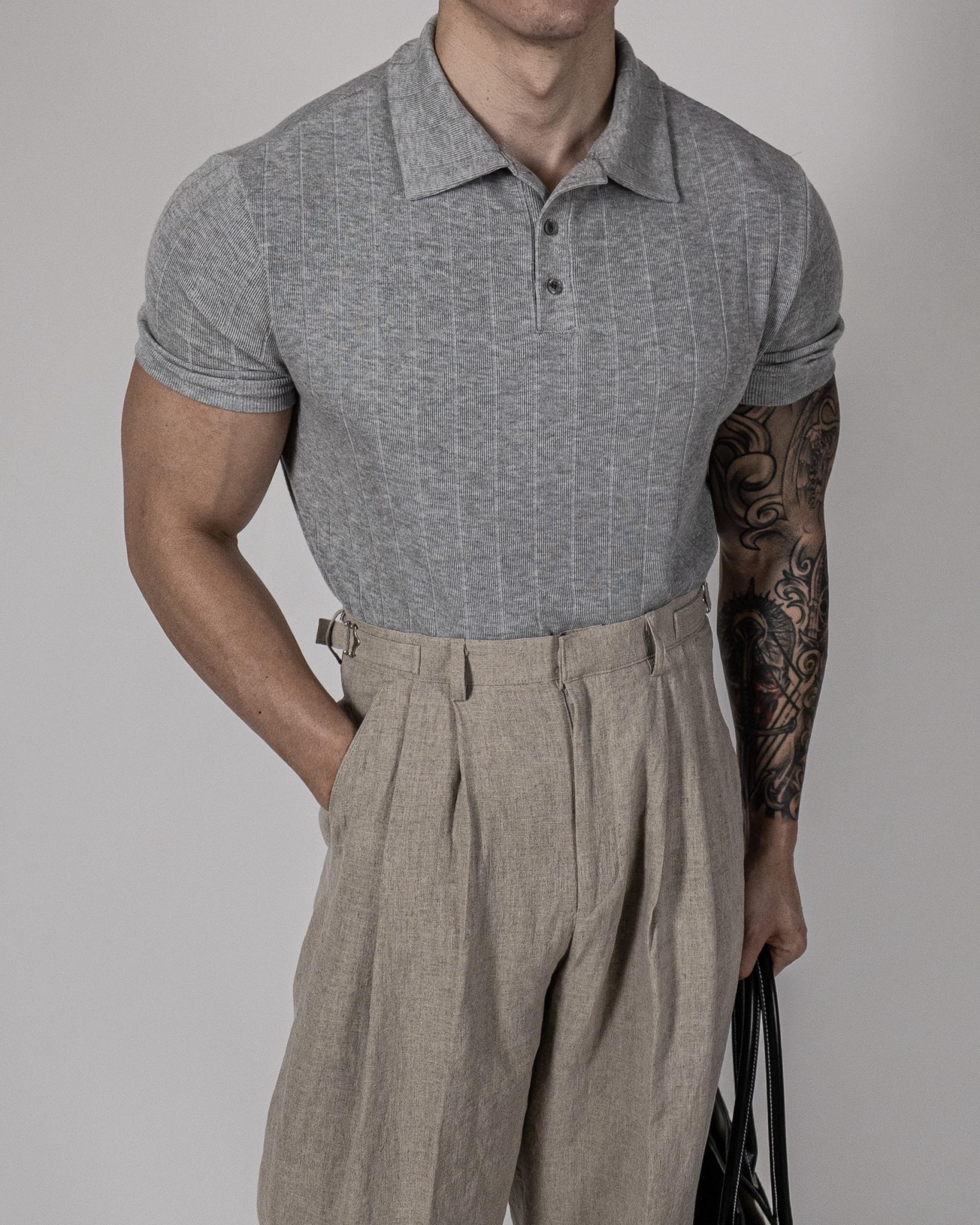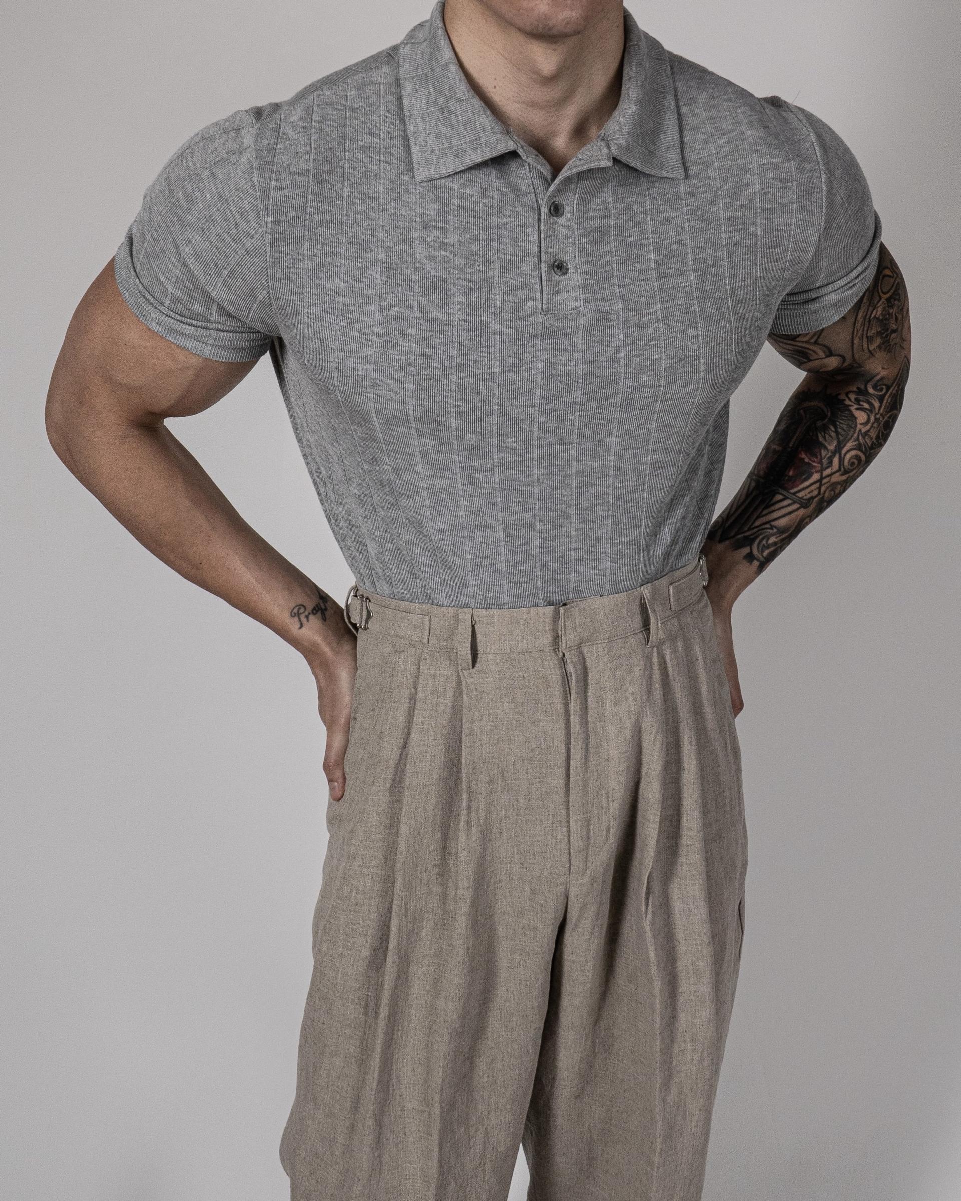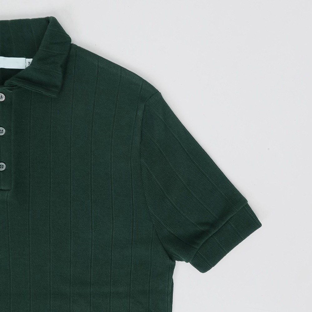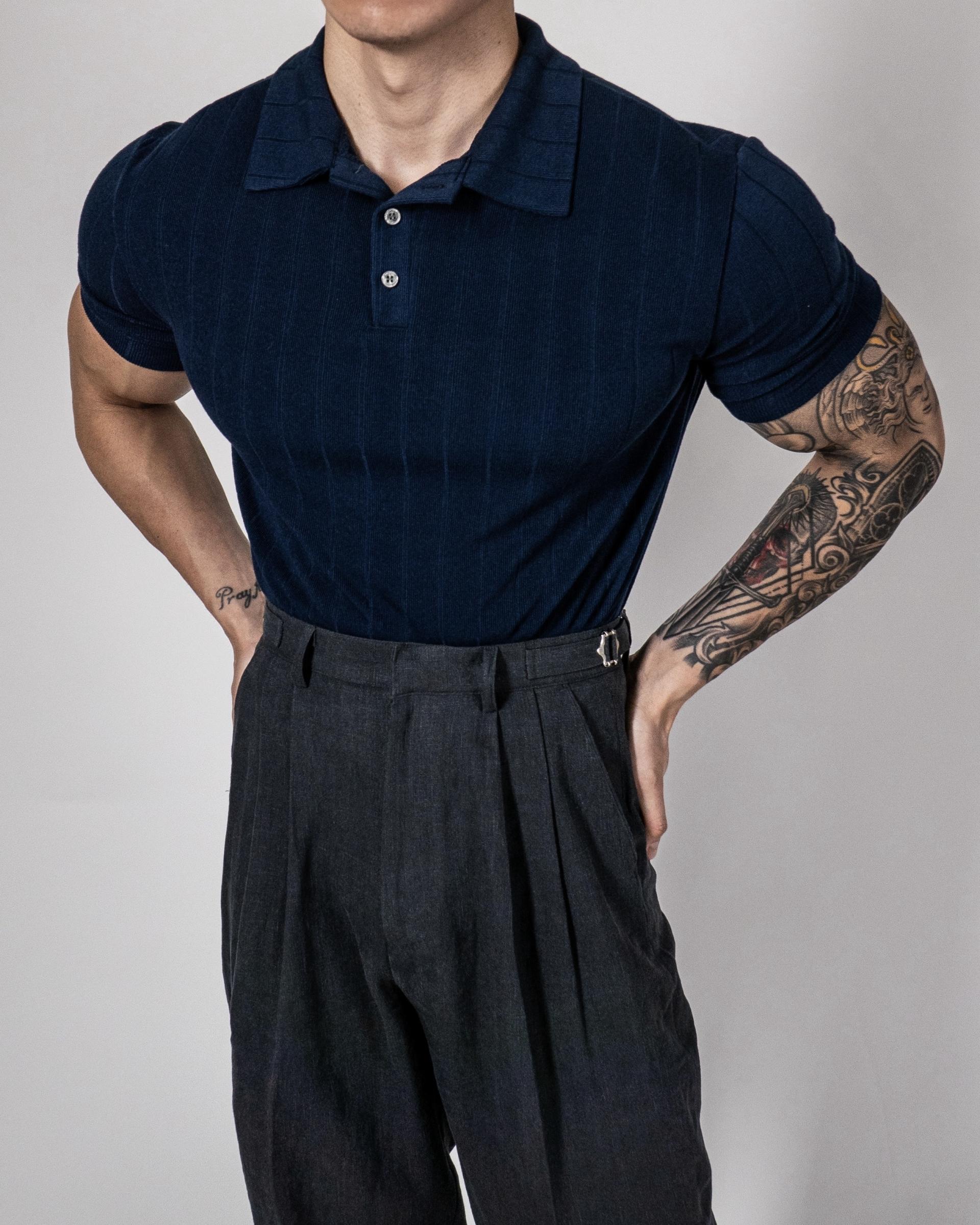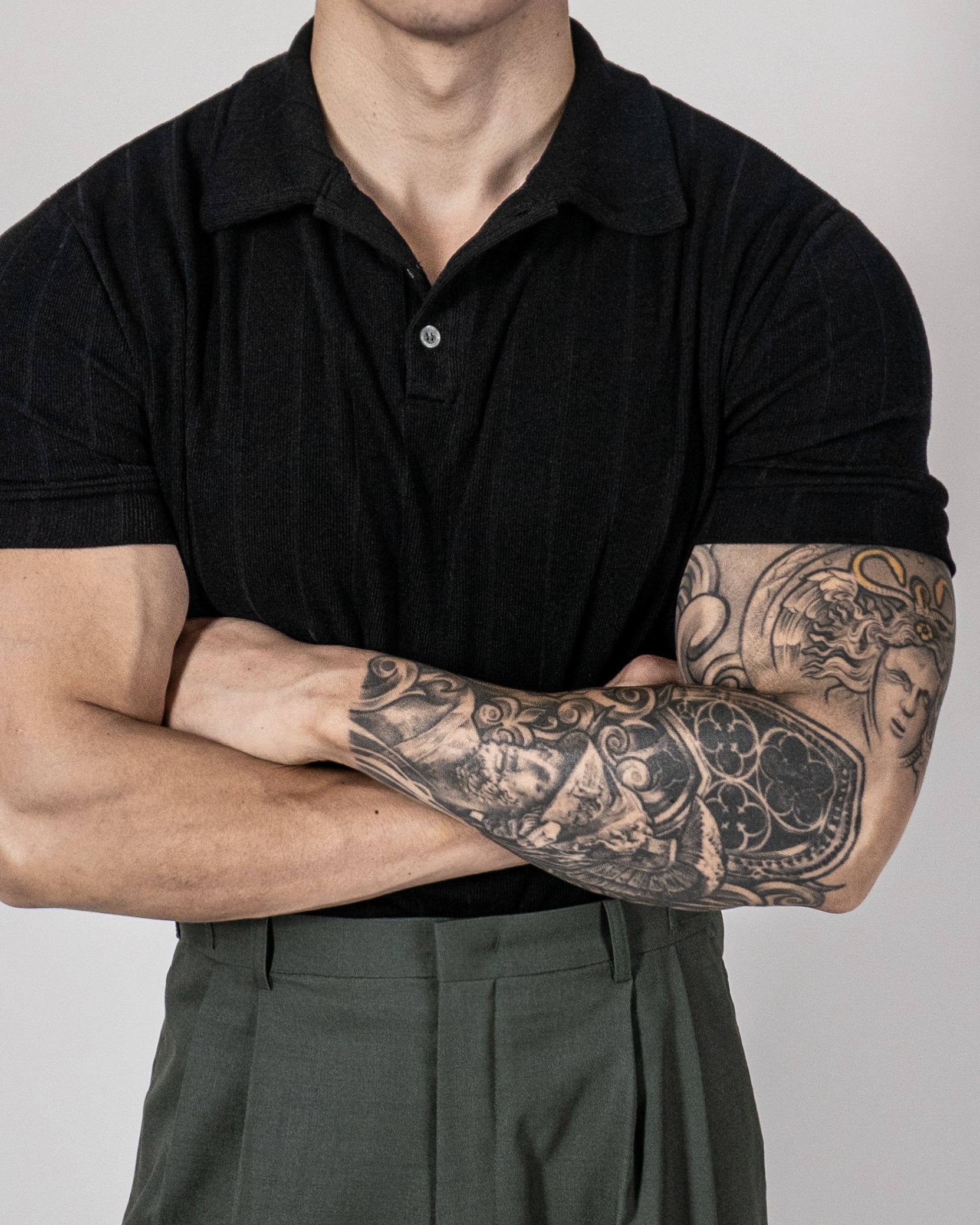 - 탄탄한 팔 립 조직과 짧은 팔길이의 머슬핏 카라 티셔츠