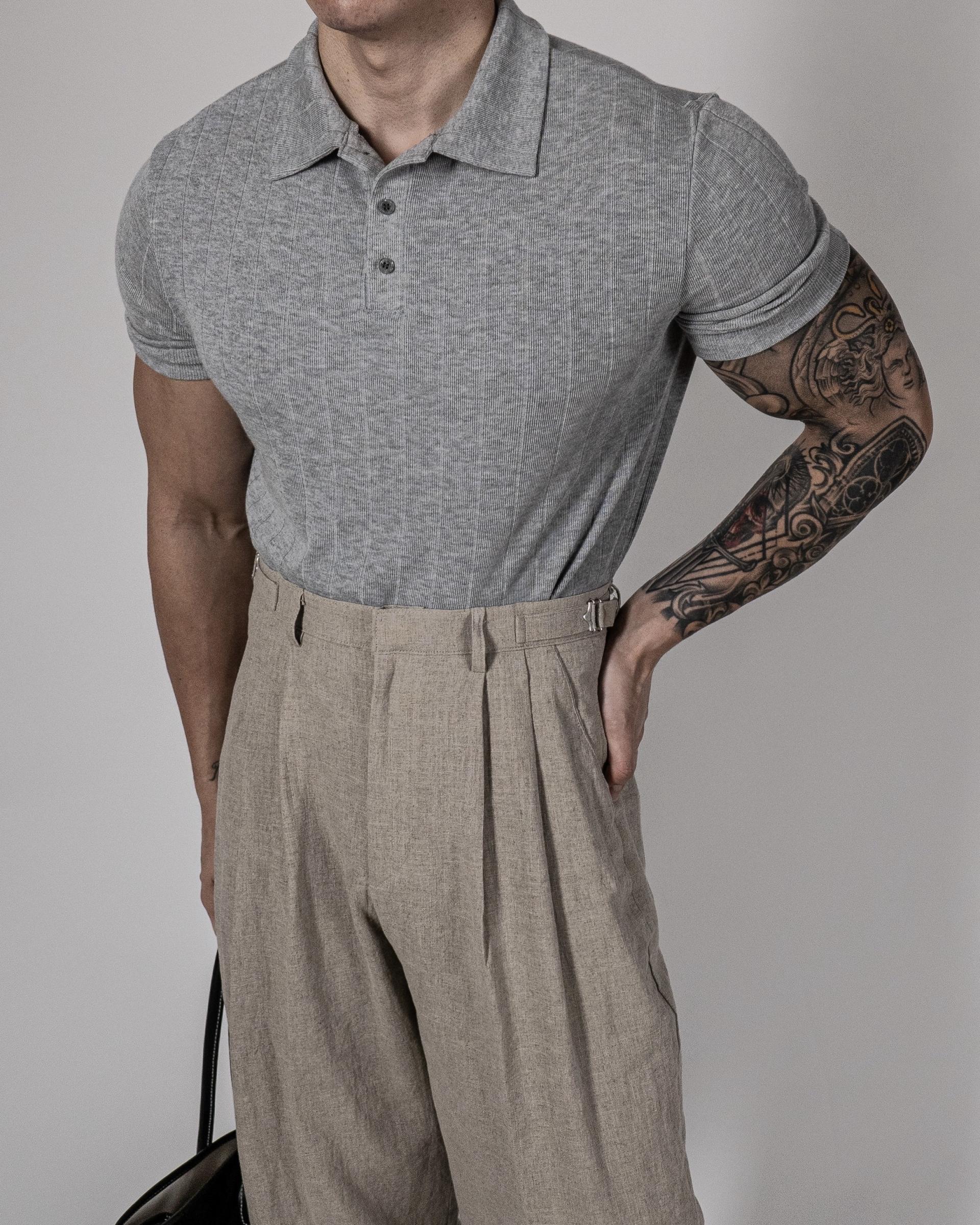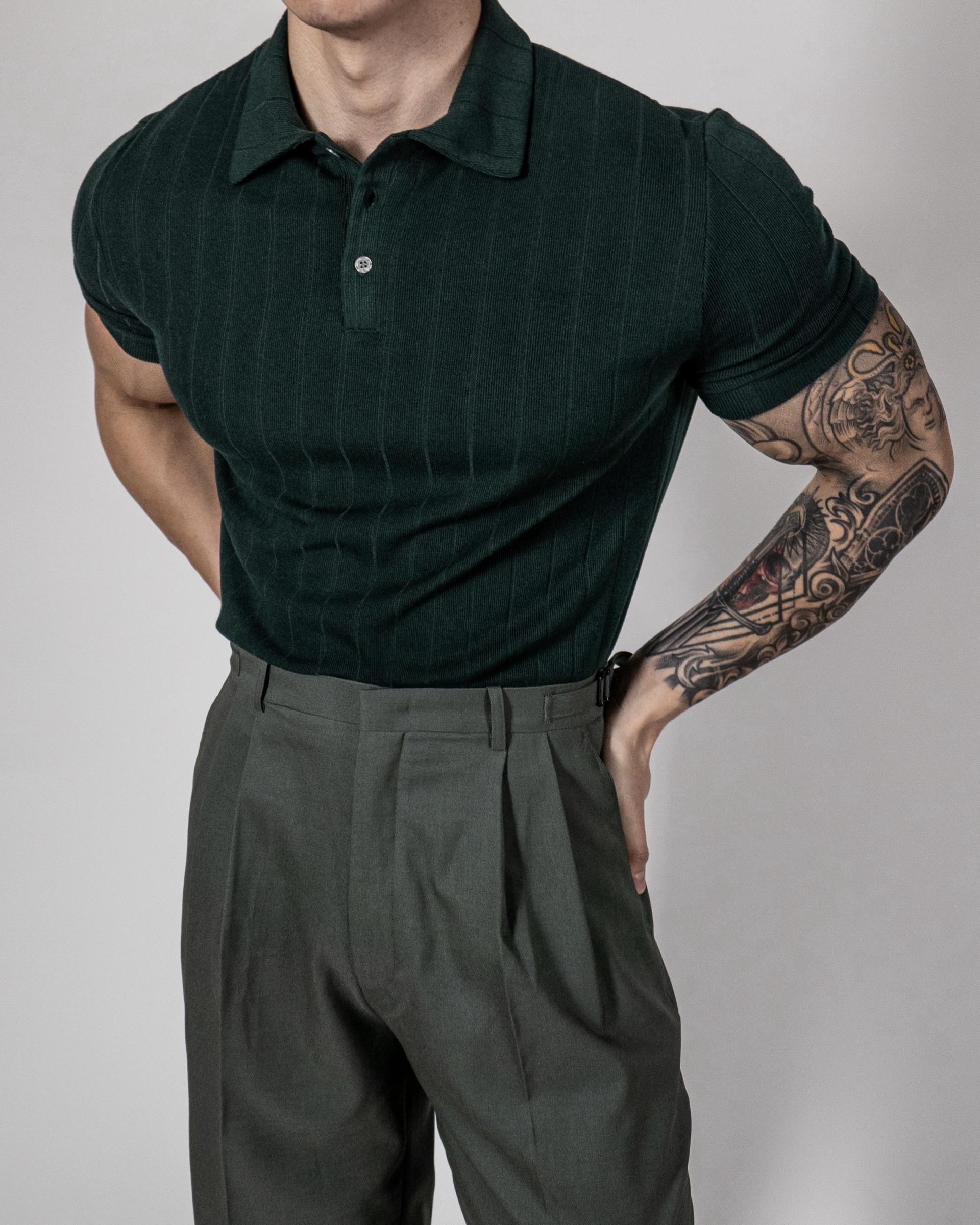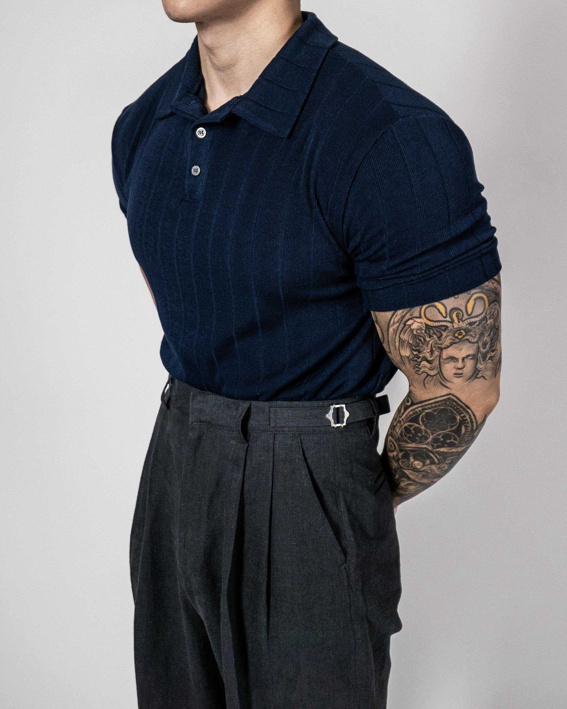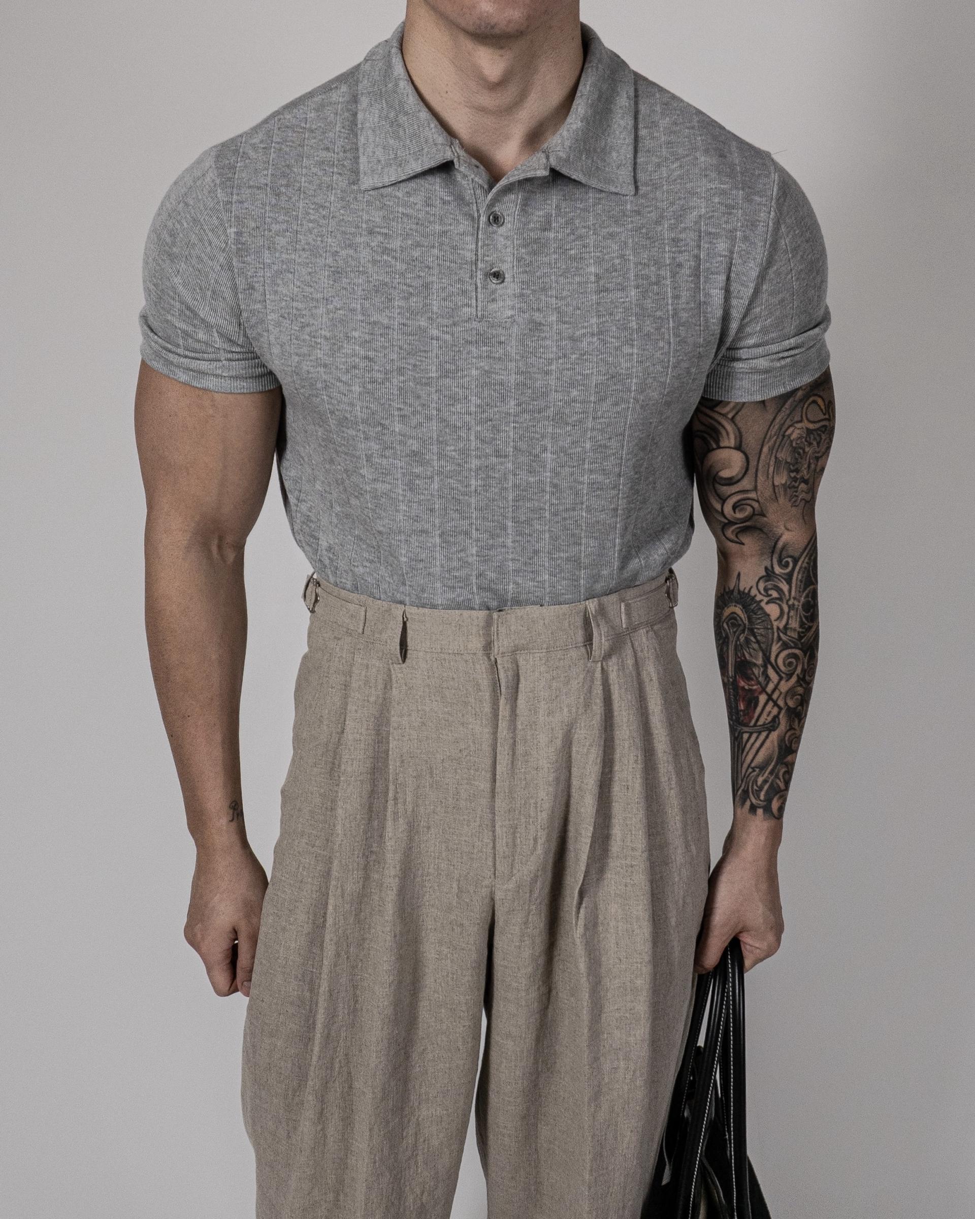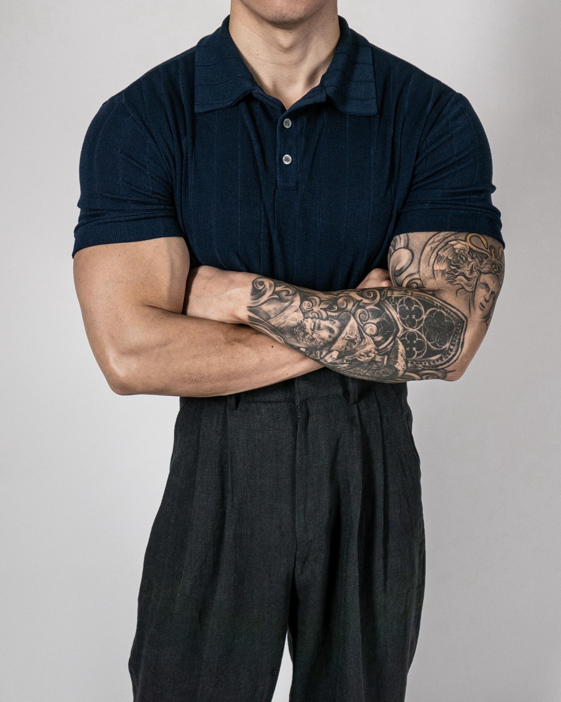 - 탄탄한 팔 립 조직과 짧은 팔길이의 머슬핏 카라 티셔츠